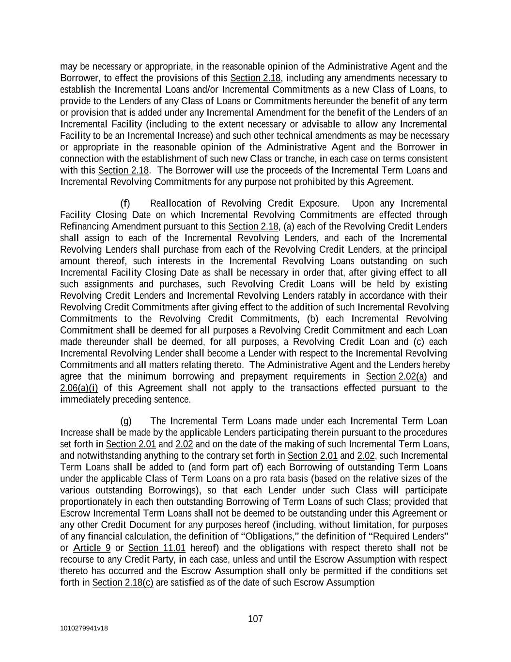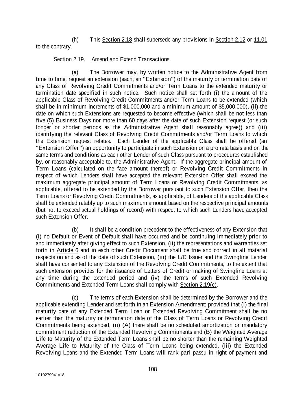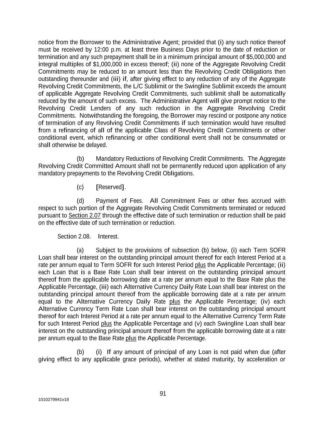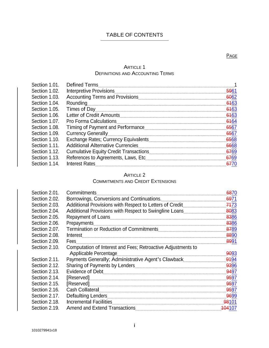 TABLE OF CONTENTS PAGE ARTICLE 1 DEFINITIONS AND ACCOUNTING TERMS Section 1.01. Defined Terms 1 Section 1.02. Interpretive Provisions 5961 Section 1.03. Accounting Terms and Provisions 6062 Section 1.04. Rounding 6163 Section 1.05. Times of Day 6163 Section 1.06. Letter of Credit Amounts 6163 Section 1.07. Pro Forma Calculations 6164 Section 1.08. Timing of Payment and Performance 6567 Section 1.09. Currency Generally 6567 Section 1.10. Exchange Rates; Currency Equivalents 6568 Section 1.11. Additional Alternative Currencies 6668 Section 1.12. Cumulative Equity Credit Transactions 6769 Section 1.13. References to Agreements, Laws, Etc 6769 Section 1.14. Interest Rates 6770 ARTICLE 2 COMMITMENTS AND CREDIT EXTENSIONS Section 2.01. Commitments 6870 Section 2.02. Borrowings, Conversions and Continuations. 6971 Section 2.03. Additional Provisions with Respect to Letters of Credit 7173 Section 2.04. Additional Provisions with Respect to Swingline Loans 8083 Section 2.05. Repayment of Loans 8386 Section 2.06. Prepayments 8386 Section 2.07. Termination or Reduction of Commitments 8789 Section 2.08. Interest 8890 Section 2.09. Fees 8991 Section 2.10. Computation of Interest and Fees; Retroactive Adjustments to Applicable Percentage 9093 Section 2.11. Payments Generally; Administrative Agent’s Clawback 9194 Section 2.12. Sharing of Payments by Lenders 9396 Section 2.13. Evidence of Debt 9497 Section 2.14. [Reserved] 9597 Section 2.15. [Reserved] 9597 Section 2.16. Cash Collateral 9597 Section 2.17. Defaulting Lenders 9699 Section 2.18. Incremental Facilities 98101 Section 2.19. Amend and Extend Transactions 104107 i 1010279941v18