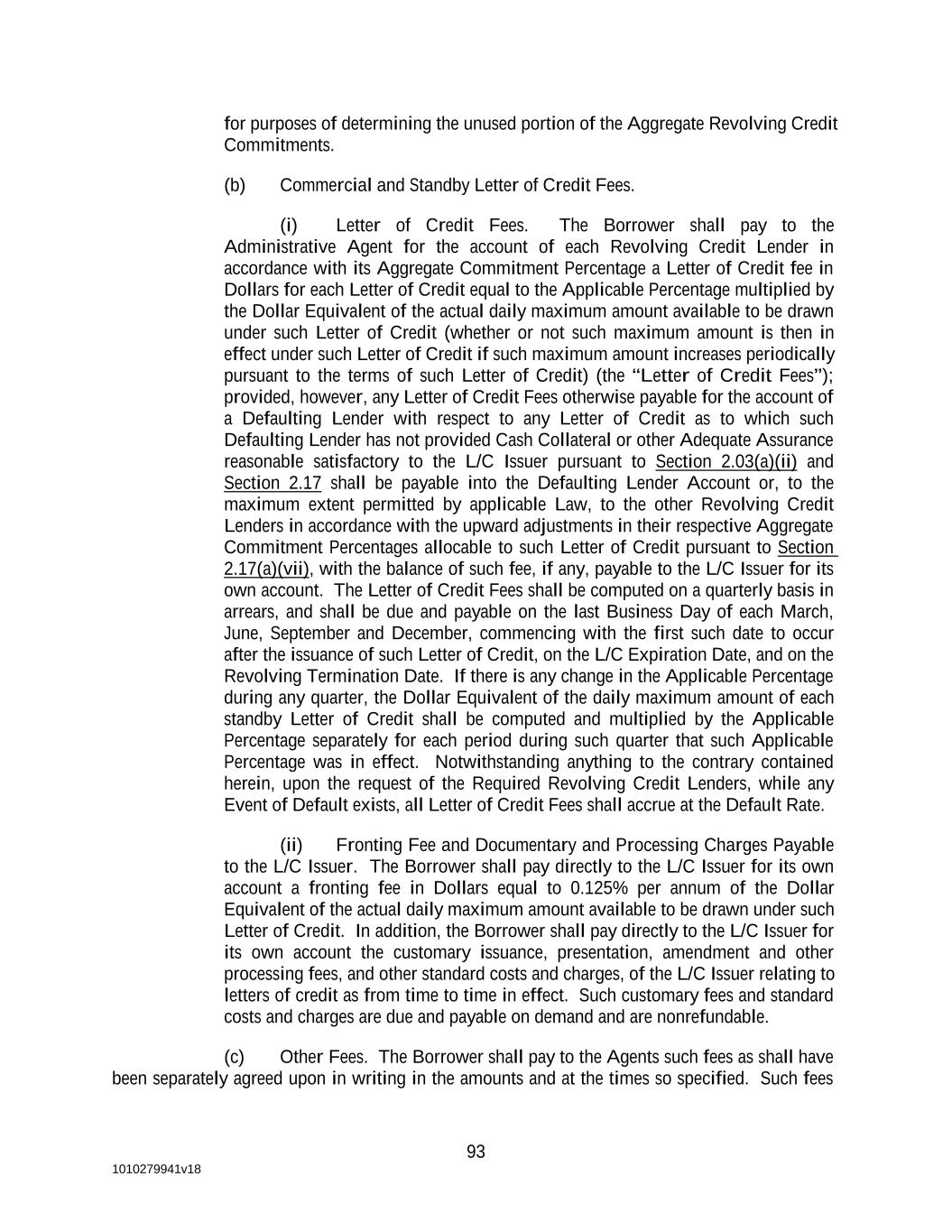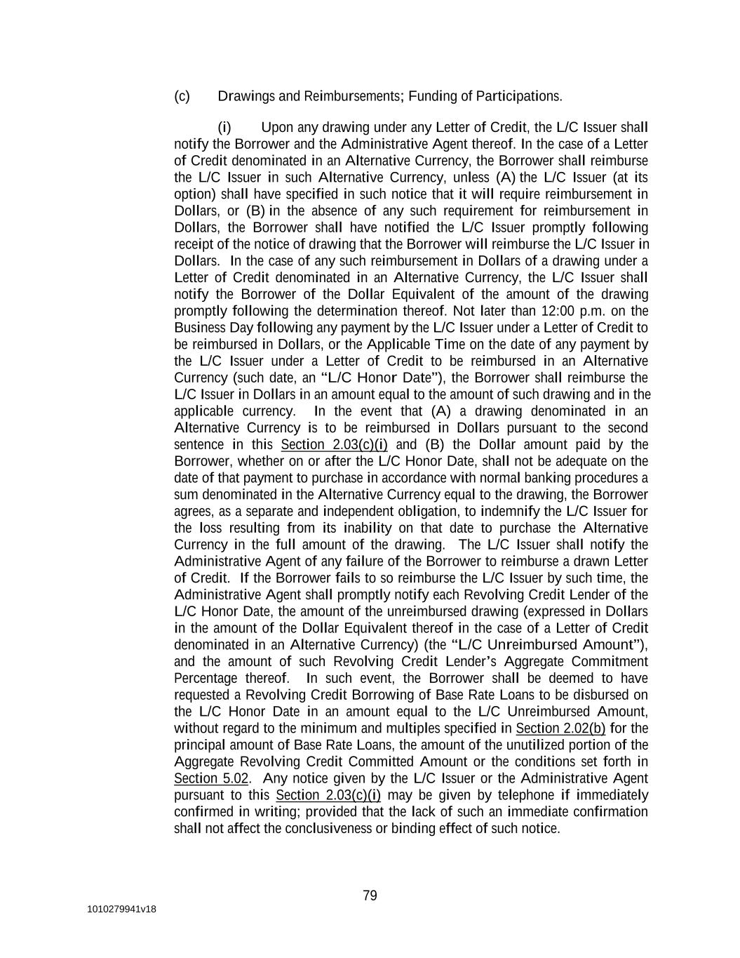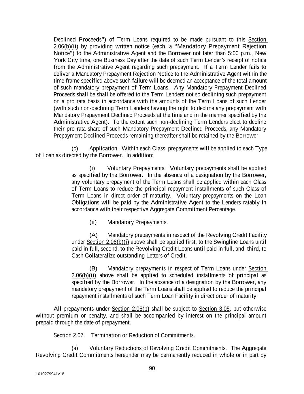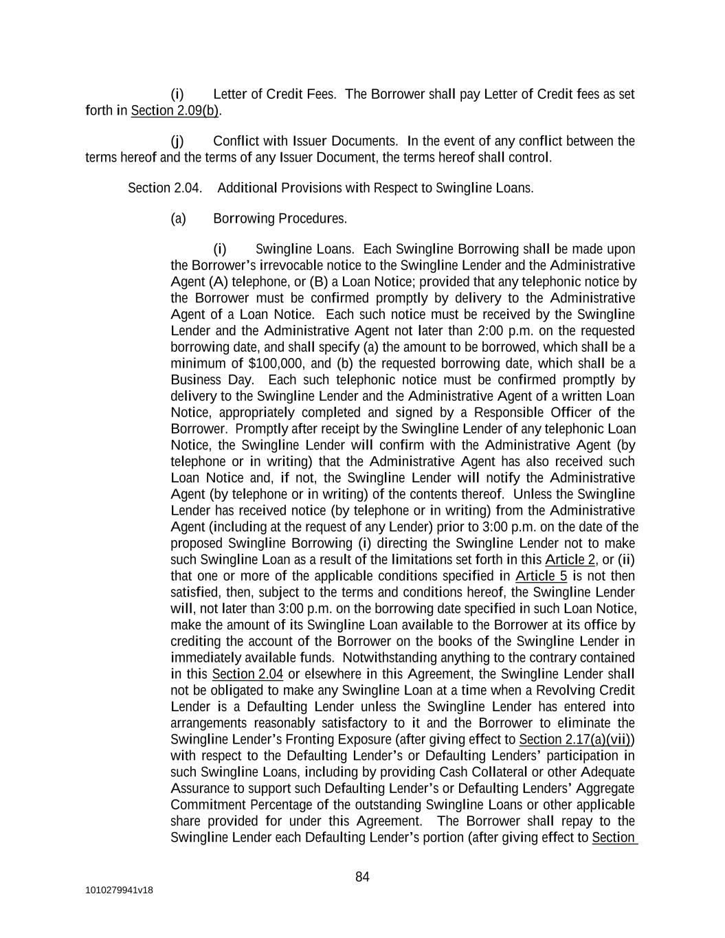 TABLE OF CONTENTS PAGE ARTICLE 1 DEFINITIONS AND ACCOUNTING TERMS Section 1.01. Defined Terms 1 Section 1.02. Interpretive Provisions 5961 Section 1.03. Accounting Terms and Provisions 6062 Section 1.04. Rounding 6163 Section 1.05. Times of Day 6163 Section 1.06. Letter of Credit Amounts 6163 Section 1.07. Pro Forma Calculations 6164 Section 1.08. Timing of Payment and Performance 6567 Section 1.09. Currency Generally 6567 Section 1.10. Exchange Rates; Currency Equivalents 6568 Section 1.11. Additional Alternative Currencies 6668 Section 1.12. Cumulative Equity Credit Transactions 6769 Section 1.13. References to Agreements, Laws, Etc 6769 Section 1.14. Interest Rates 6770 ARTICLE 2 COMMITMENTS AND CREDIT EXTENSIONS Section 2.01. Commitments 6870 Section 2.02. Borrowings, Conversions and Continuations. 6971 Section 2.03. Additional Provisions with Respect to Letters of Credit 7173 Section 2.04. Additional Provisions with Respect to Swingline Loans 8083 Section 2.05. Repayment of Loans 8386 Section 2.06. Prepayments 8386 Section 2.07. Termination or Reduction of Commitments 8789 Section 2.08. Interest 8890 Section 2.09. Fees 8991 Section 2.10. Computation of Interest and Fees; Retroactive Adjustments to Applicable Percentage 9093 Section 2.11. Payments Generally; Administrative Agent’s Clawback 9194 Section 2.12. Sharing of Payments by Lenders 9396 Section 2.13. Evidence of Debt 9497 Section 2.14. [Reserved] 9597 Section 2.15. [Reserved] 9597 Section 2.16. Cash Collateral 9597 Section 2.17. Defaulting Lenders 9699 Section 2.18. Incremental Facilities 98101 Section 2.19. Amend and Extend Transactions 104107 i 1010279941v18