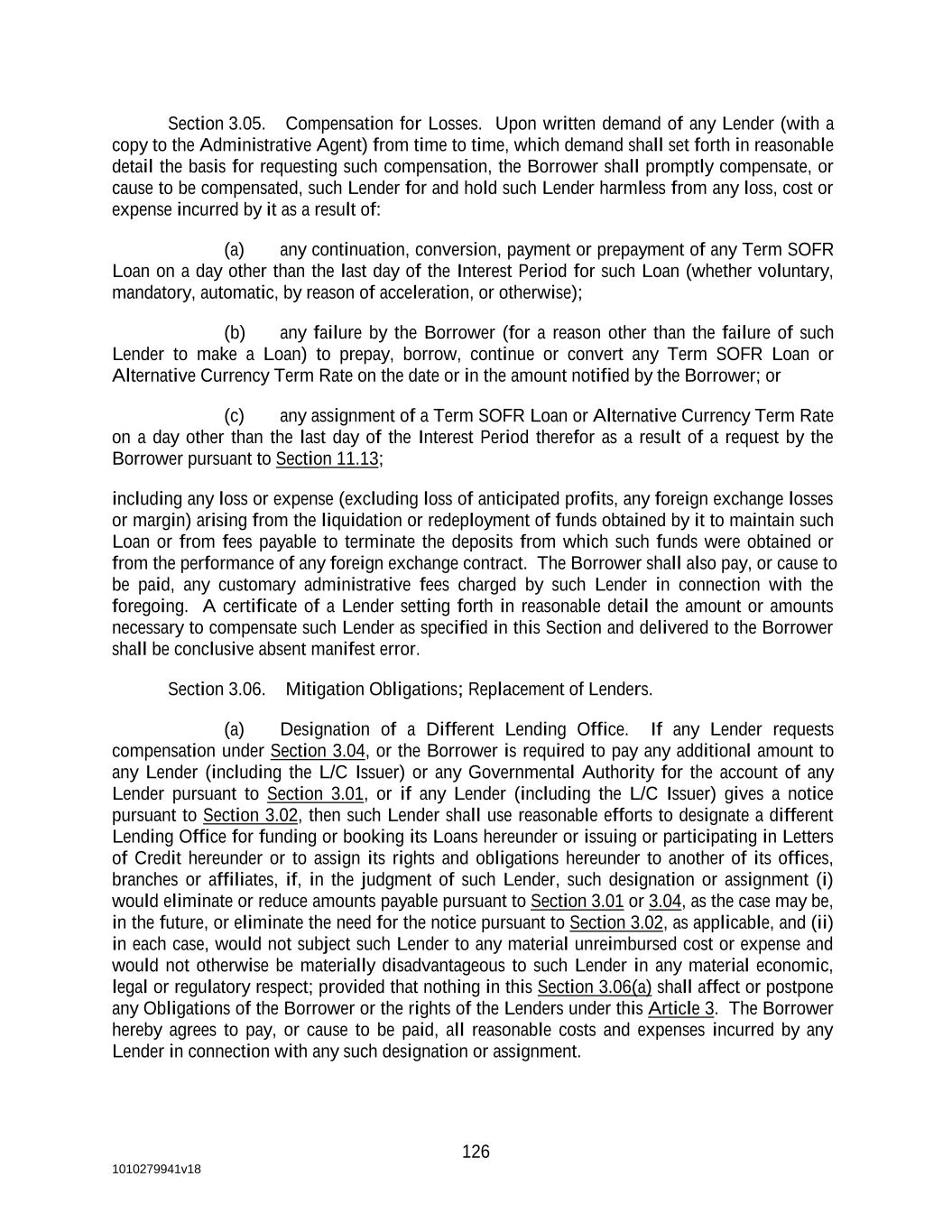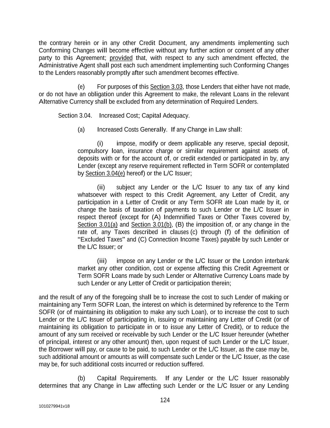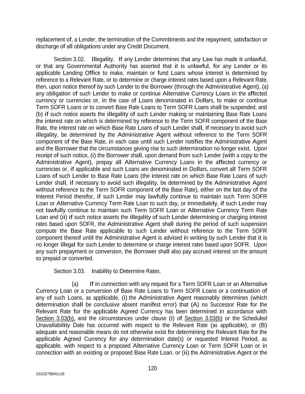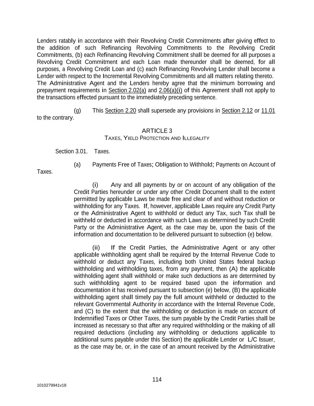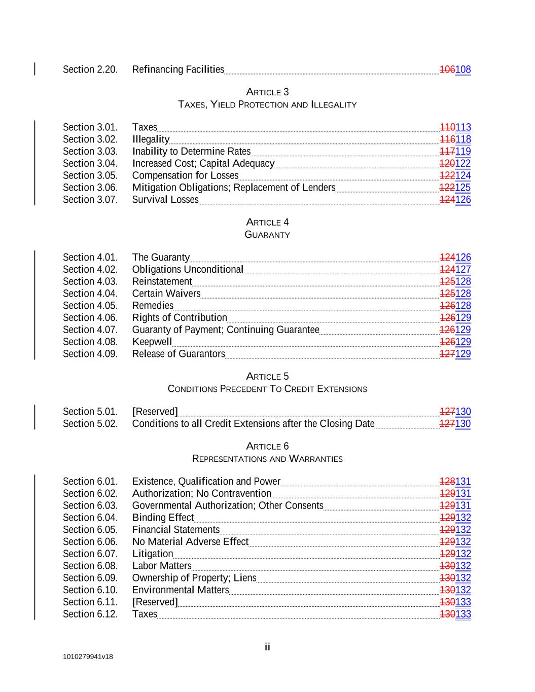 Section 2.20. Refinancing Facilities 106108 ARTICLE 3 TAXES, YIELD PROTECTION AND ILLEGALITY Section 3.01. Taxes 110113 Section 3.02. Illegality 116118 Section 3.03. Inability to Determine Rates 117119 Section 3.04. Increased Cost; Capital Adequacy 120122 Section 3.05. Compensation for Losses 122124 Section 3.06. Mitigation Obligations; Replacement of Lenders 122125 Section 3.07. Survival Losses 124126 ARTICLE 4 GUARANTY Section 4.01. The Guaranty 124126 Section 4.02. Obligations Unconditional 124127 Section 4.03. Reinstatement 125128 Section 4.04. Certain Waivers 125128 Section 4.05. Remedies 126128 Section 4.06. Rights of Contribution 126129 Section 4.07. Guaranty of Payment; Continuing Guarantee 126129 Section 4.08. Keepwell 126129 Section 4.09. Release of Guarantors 127129 ARTICLE 5 CONDITIONS PRECEDENT TO CREDIT EXTENSIONS Section 5.01. [Reserved] 127130 Section 5.02. Conditions to all Credit Extensions after the Closing Date 127130 ARTICLE 6 REPRESENTATIONS AND WARRANTIES Section 6.01. Existence, Qualification and Power 128131 Section 6.02. Authorization; No Contravention 129131 Section 6.03. Governmental Authorization; Other Consents 129131 Section 6.04. Binding Effect 129132 Section 6.05. Financial Statements 129132 Section 6.06. No Material Adverse Effect 129132 Section 6.07. Litigation 129132 Section 6.08. Labor Matters 130132 Section 6.09. Ownership of Property; Liens 130132 Section 6.10. Environmental Matters 130132 Section 6.11. [Reserved] 130133 Section 6.12. Taxes 130133 ii 1010279941v18