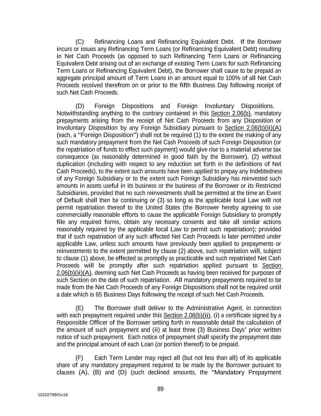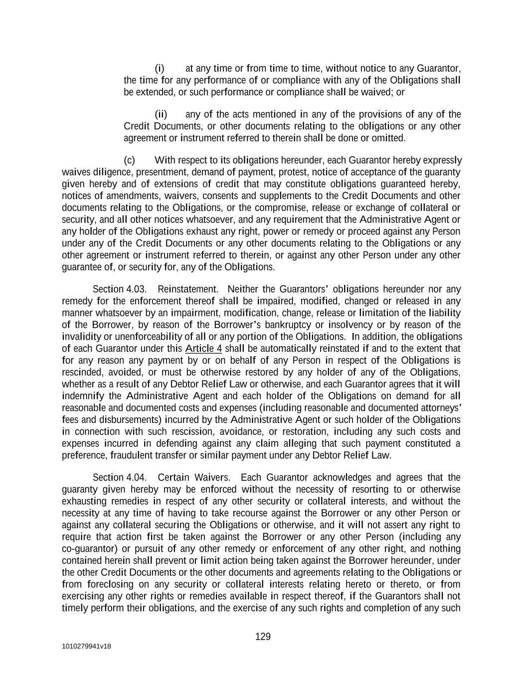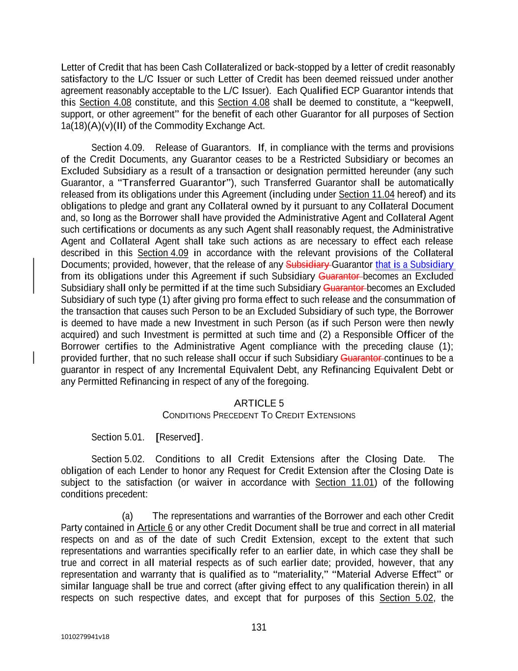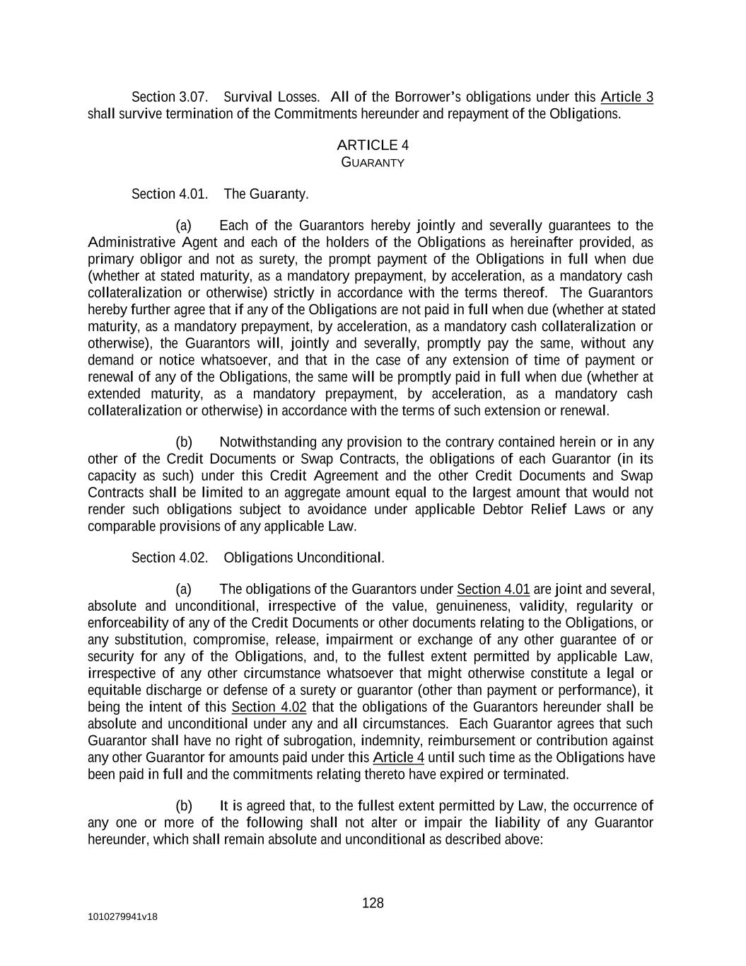 Section 2.20. Refinancing Facilities 106108 ARTICLE 3 TAXES, YIELD PROTECTION AND ILLEGALITY Section 3.01. Taxes 110113 Section 3.02. Illegality 116118 Section 3.03. Inability to Determine Rates 117119 Section 3.04. Increased Cost; Capital Adequacy 120122 Section 3.05. Compensation for Losses 122124 Section 3.06. Mitigation Obligations; Replacement of Lenders 122125 Section 3.07. Survival Losses 124126 ARTICLE 4 GUARANTY Section 4.01. The Guaranty 124126 Section 4.02. Obligations Unconditional 124127 Section 4.03. Reinstatement 125128 Section 4.04. Certain Waivers 125128 Section 4.05. Remedies 126128 Section 4.06. Rights of Contribution 126129 Section 4.07. Guaranty of Payment; Continuing Guarantee 126129 Section 4.08. Keepwell 126129 Section 4.09. Release of Guarantors 127129 ARTICLE 5 CONDITIONS PRECEDENT TO CREDIT EXTENSIONS Section 5.01. [Reserved] 127130 Section 5.02. Conditions to all Credit Extensions after the Closing Date 127130 ARTICLE 6 REPRESENTATIONS AND WARRANTIES Section 6.01. Existence, Qualification and Power 128131 Section 6.02. Authorization; No Contravention 129131 Section 6.03. Governmental Authorization; Other Consents 129131 Section 6.04. Binding Effect 129132 Section 6.05. Financial Statements 129132 Section 6.06. No Material Adverse Effect 129132 Section 6.07. Litigation 129132 Section 6.08. Labor Matters 130132 Section 6.09. Ownership of Property; Liens 130132 Section 6.10. Environmental Matters 130132 Section 6.11. [Reserved] 130133 Section 6.12. Taxes 130133 ii 1010279941v18