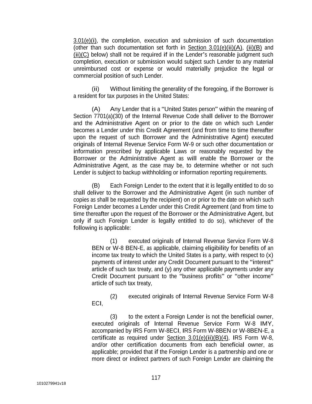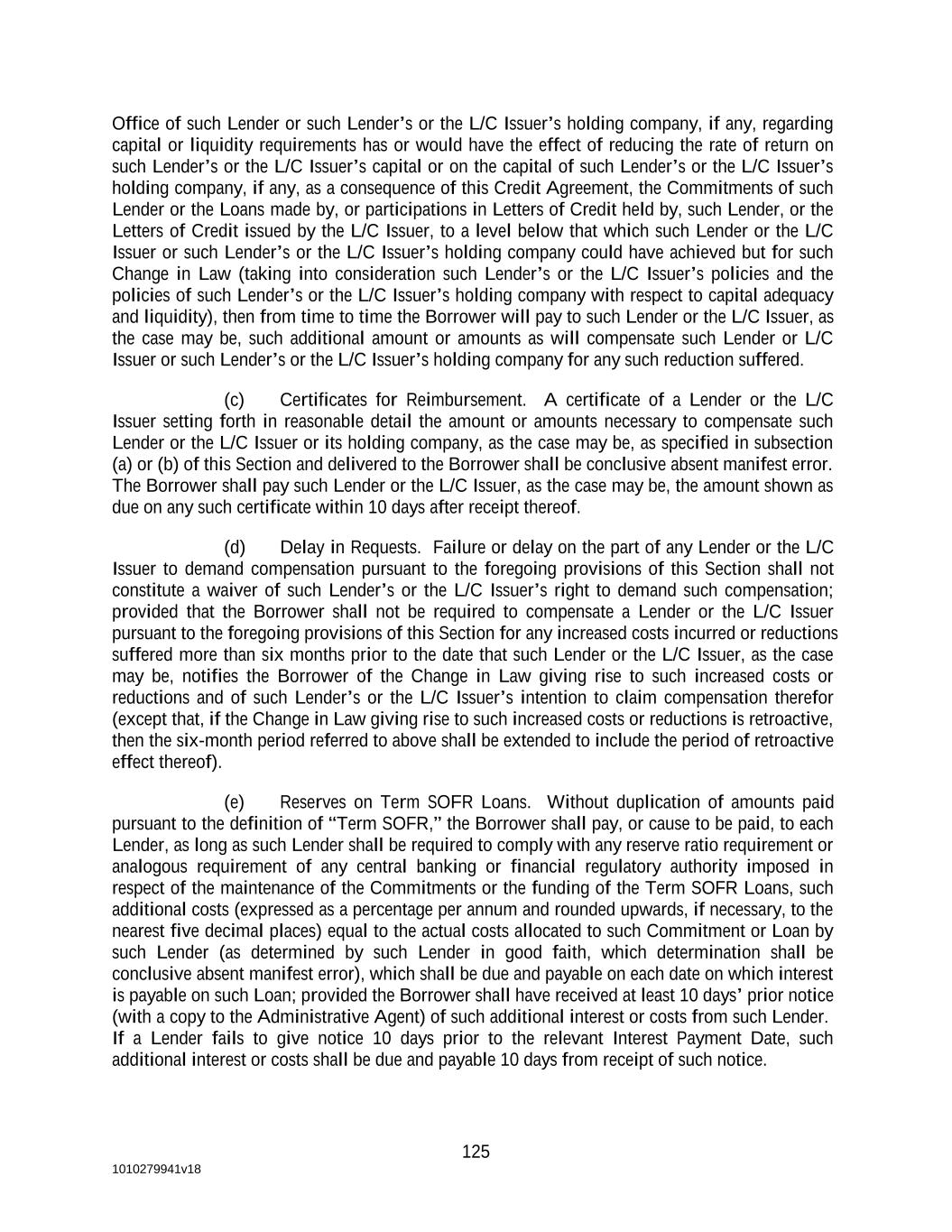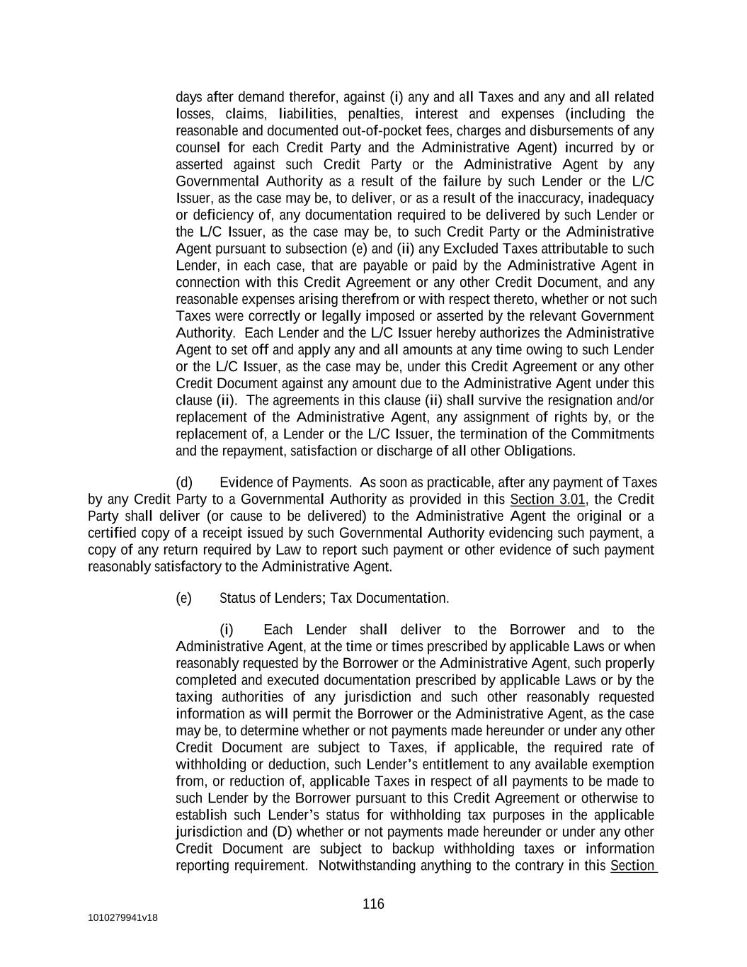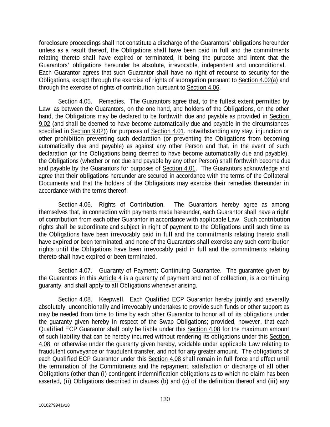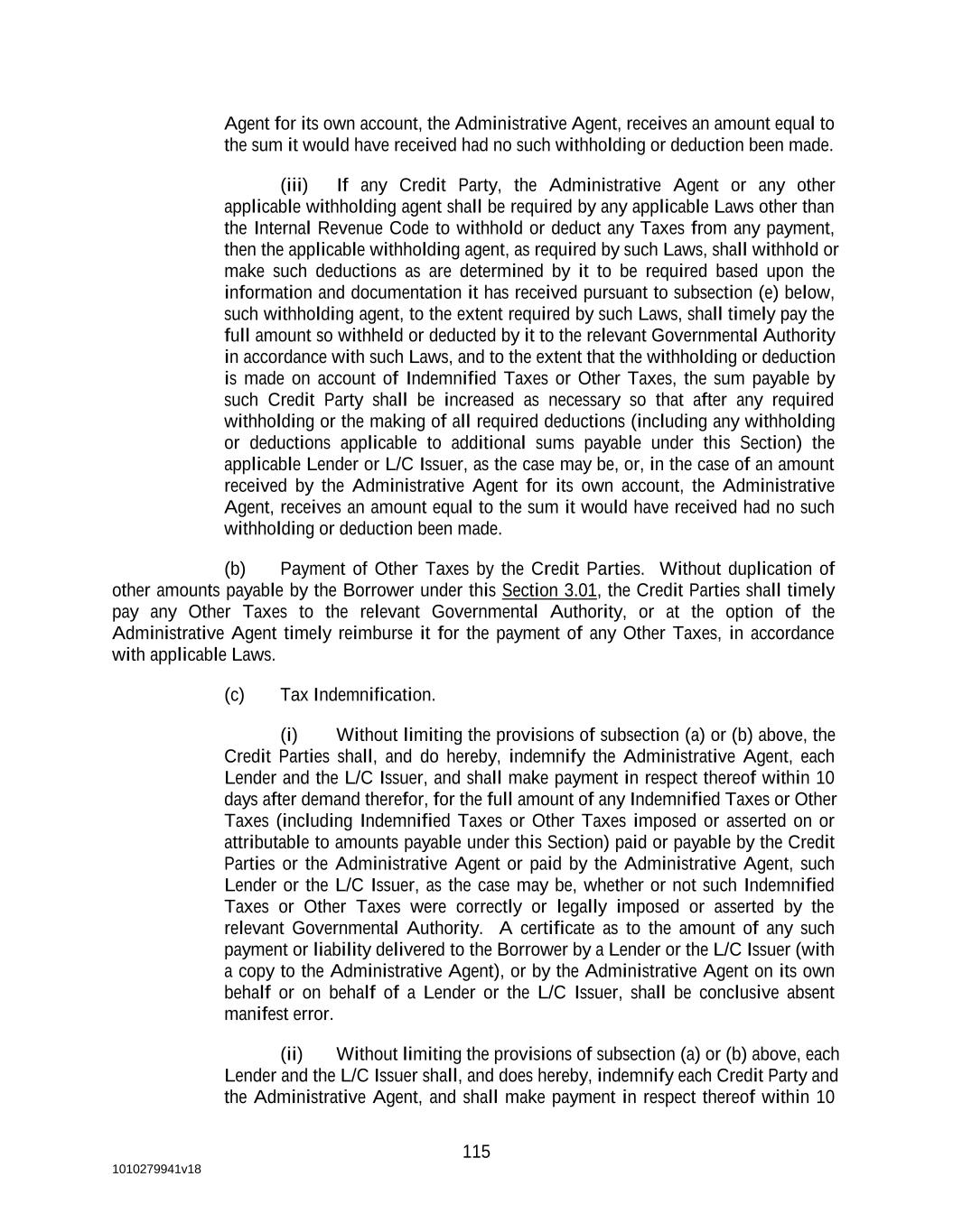 Section 2.20. Refinancing Facilities 106108 ARTICLE 3 TAXES, YIELD PROTECTION AND ILLEGALITY Section 3.01. Taxes 110113 Section 3.02. Illegality 116118 Section 3.03. Inability to Determine Rates 117119 Section 3.04. Increased Cost; Capital Adequacy 120122 Section 3.05. Compensation for Losses 122124 Section 3.06. Mitigation Obligations; Replacement of Lenders 122125 Section 3.07. Survival Losses 124126 ARTICLE 4 GUARANTY Section 4.01. The Guaranty 124126 Section 4.02. Obligations Unconditional 124127 Section 4.03. Reinstatement 125128 Section 4.04. Certain Waivers 125128 Section 4.05. Remedies 126128 Section 4.06. Rights of Contribution 126129 Section 4.07. Guaranty of Payment; Continuing Guarantee 126129 Section 4.08. Keepwell 126129 Section 4.09. Release of Guarantors 127129 ARTICLE 5 CONDITIONS PRECEDENT TO CREDIT EXTENSIONS Section 5.01. [Reserved] 127130 Section 5.02. Conditions to all Credit Extensions after the Closing Date 127130 ARTICLE 6 REPRESENTATIONS AND WARRANTIES Section 6.01. Existence, Qualification and Power 128131 Section 6.02. Authorization; No Contravention 129131 Section 6.03. Governmental Authorization; Other Consents 129131 Section 6.04. Binding Effect 129132 Section 6.05. Financial Statements 129132 Section 6.06. No Material Adverse Effect 129132 Section 6.07. Litigation 129132 Section 6.08. Labor Matters 130132 Section 6.09. Ownership of Property; Liens 130132 Section 6.10. Environmental Matters 130132 Section 6.11. [Reserved] 130133 Section 6.12. Taxes 130133 ii 1010279941v18