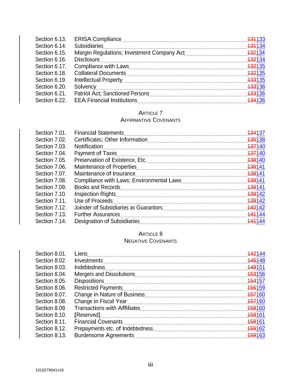 Section 6.13. ERISA Compliance 131133 Section 6.14. Subsidiaries 131134 Section 6.15. Margin Regulations; Investment Company Act 132134 Section 6.16. Disclosure 132134 Section 6.17. Compliance with Laws 132135 Section 6.18. Collateral Documents 132135 Section 6.19. Intellectual Property 133135 Section 6.20. Solvency 133136 Section 6.21. Patriot Act; Sanctioned Persons 133136 Section 6.22. EEA Financial Institutions 134136 ARTICLE 7 AFFIRMATIVE COVENANTS Section 7.01. Financial Statements 134137 Section 7.02. Certificates; Other Information 135138 Section 7.03. Notification 137140 Section 7.04. Payment of Taxes 137140 Section 7.05. Preservation of Existence, Etc 138140 Section 7.06. Maintenance of Properties 138141 Section 7.07. Maintenance of Insurance 138141 Section 7.08. Compliance with Laws; Environmental Laws 138141 Section 7.09. Books and Records 139141 Section 7.10. Inspection Rights 139142 Section 7.11. Use of Proceeds 139142 Section 7.12. Joinder of Subsidiaries as Guarantors 140142 Section 7.13. Further Assurances 141144 Section 7.14. Designation of Subsidiaries 141144 ARTICLE 8 NEGATIVE COVENANTS Section 8.01. Liens 142144 Section 8.02. Investments 145148 Section 8.03. Indebtedness 148151 Section 8.04. Mergers and Dissolutions 153156 Section 8.05. Dispositions 154157 Section 8.06. Restricted Payments 156159 Section 8.07. Change in Nature of Business 157160 Section 8.08. Change in Fiscal Year 157160 Section 8.09. Transactions with Affiliates 158160 Section 8.10. [Reserved] 158161 Section 8.11. Financial Covenants 158161 Section 8.12. Prepayments etc. of Indebtedness 159162 Section 8.13. Burdensome Agreements 159163 iii 1010279941v18