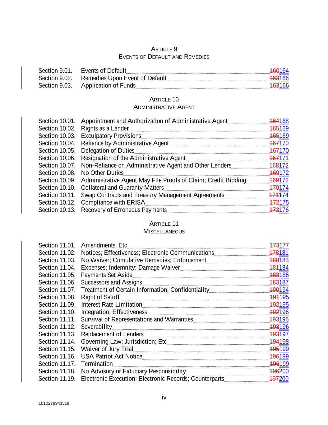 ARTICLE 9 EVENTS OF DEFAULT AND REMEDIES Section 9.01. Events of Default 160164 Section 9.02. Remedies Upon Event of Default 163166 Section 9.03. Application of Funds 163166 ARTICLE 10 ADMINISTRATIVE AGENT Section 10.01. Appointment and Authorization of Administrative Agent 164168 Section 10.02. Rights as a Lender 165169 Section 10.03. Exculpatory Provisions 165169 Section 10.04. Reliance by Administrative Agent 167170 Section 10.05. Delegation of Duties 167170 Section 10.06. Resignation of the Administrative Agent 167171 Section 10.07. Non-Reliance on Administrative Agent and Other Lenders 168172 Section 10.08. No Other Duties 169172 Section 10.09. Administrative Agent May File Proofs of Claim; Credit Bidding 169172 Section 10.10. Collateral and Guaranty Matters 170174 Section 10.11. Swap Contracts and Treasury Management Agreements 171174 Section 10.12. Compliance with ERISA 172175 Section 10.13. Recovery of Erroneous Payments 173176 ARTICLE 11 MISCELLANEOUS Section 11.01. Amendments, Etc 173177 Section 11.02. Notices; Effectiveness; Electronic Communications 178181 Section 11.03. No Waiver; Cumulative Remedies; Enforcement 180183 Section 11.04. Expenses; Indemnity; Damage Waiver 181184 Section 11.05. Payments Set Aside 183186 Section 11.06. Successors and Assigns 183187 Section 11.07. Treatment of Certain Information; Confidentiality 190194 Section 11.08. Right of Setoff 191195 Section 11.09. Interest Rate Limitation 192195 Section 11.10. Integration; Effectiveness 192196 Section 11.11. Survival of Representations and Warranties 193196 Section 11.12. Severability 193196 Section 11.13. Replacement of Lenders 193197 Section 11.14. Governing Law; Jurisdiction; Etc 194198 Section 11.15. Waiver of Jury Trial 195199 Section 11.16. USA Patriot Act Notice 196199 Section 11.17. Termination 196199 Section 11.18. No Advisory or Fiduciary Responsibility 196200 Section 11.19. Electronic Execution; Electronic Records; Counterparts 197200 iv 1010279941v18