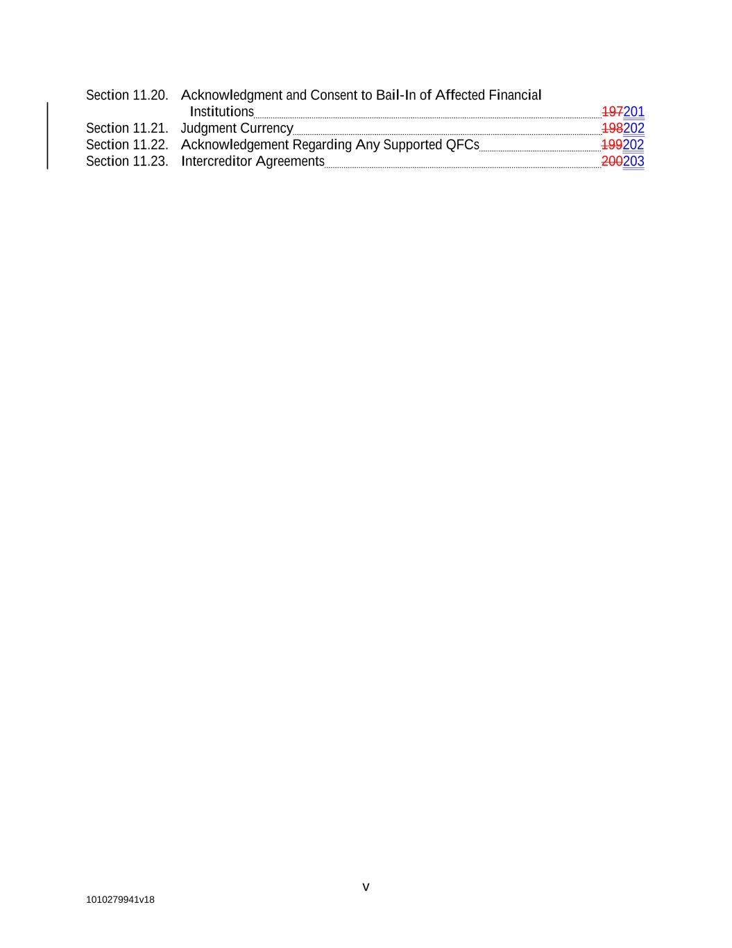 Section 11.20. Acknowledgment and Consent to Bail-In of Affected Financial Institutions 197201 Section 11.21. Judgment Currency 198202 Section 11.22. Acknowledgement Regarding Any Supported QFCs 199202 Section 11.23. Intercreditor Agreements 200203 v 1010279941v18