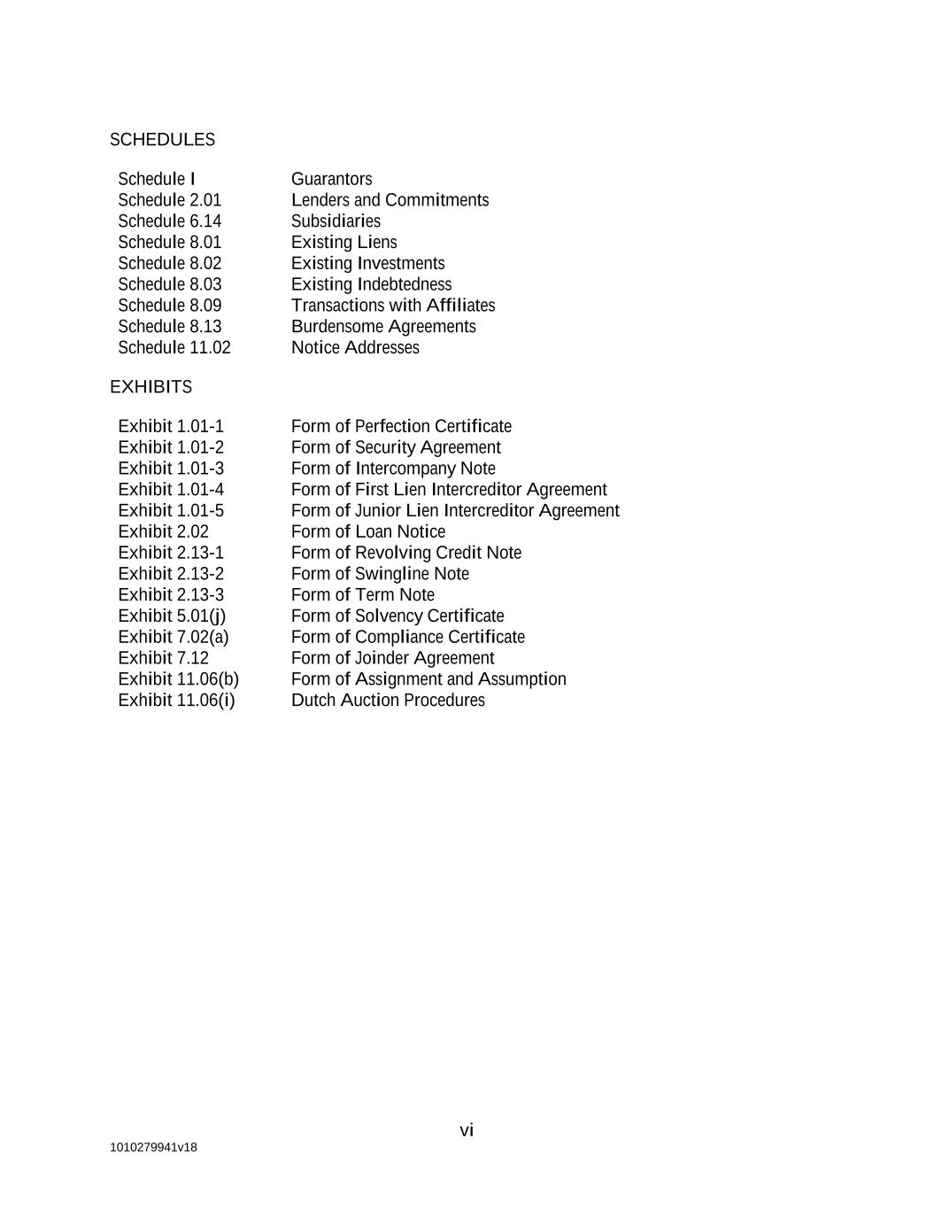 vi 1010279941v18 Exhibit 1.01-3 Form of Intercompany Note Schedule 8.03 Exhibit 1.01-4 Existing Indebtedness Form of First Lien Intercreditor Agreement Schedule 6.14 Exhibit 1.01-5 Guarantors Form of Junior Lien Intercreditor Agreement Schedule 8.09 Subsidiaries Exhibit 2.02 Transactions with Affiliates Form of Loan Notice SCHEDULES Exhibit 2.13-1 Form of Revolving Credit Note Schedule 8.13 Exhibit 2.13-2 Burdensome Agreements Form of Swingline Note Schedule 8.01 Exhibit 2.13-3 Form of Term Note Schedule 11.02 Existing Liens Exhibit 5.01(j) Notice Addresses Form of Solvency Certificate Schedule 2.01 EXHIBITS Exhibit 7.02(a) Form of Compliance Certificate Exhibit 1.01-1 Exhibit 7.12 Form of Joinder Agreement Form of Perfection Certificate Schedule 8.02 Exhibit 11.06(b) Form of Assignment and Assumption Lenders and Commitments Exhibit 1.01-2 Exhibit 11.06(i) Existing Investments Dutch Auction Procedures Form of Security Agreement Schedule I