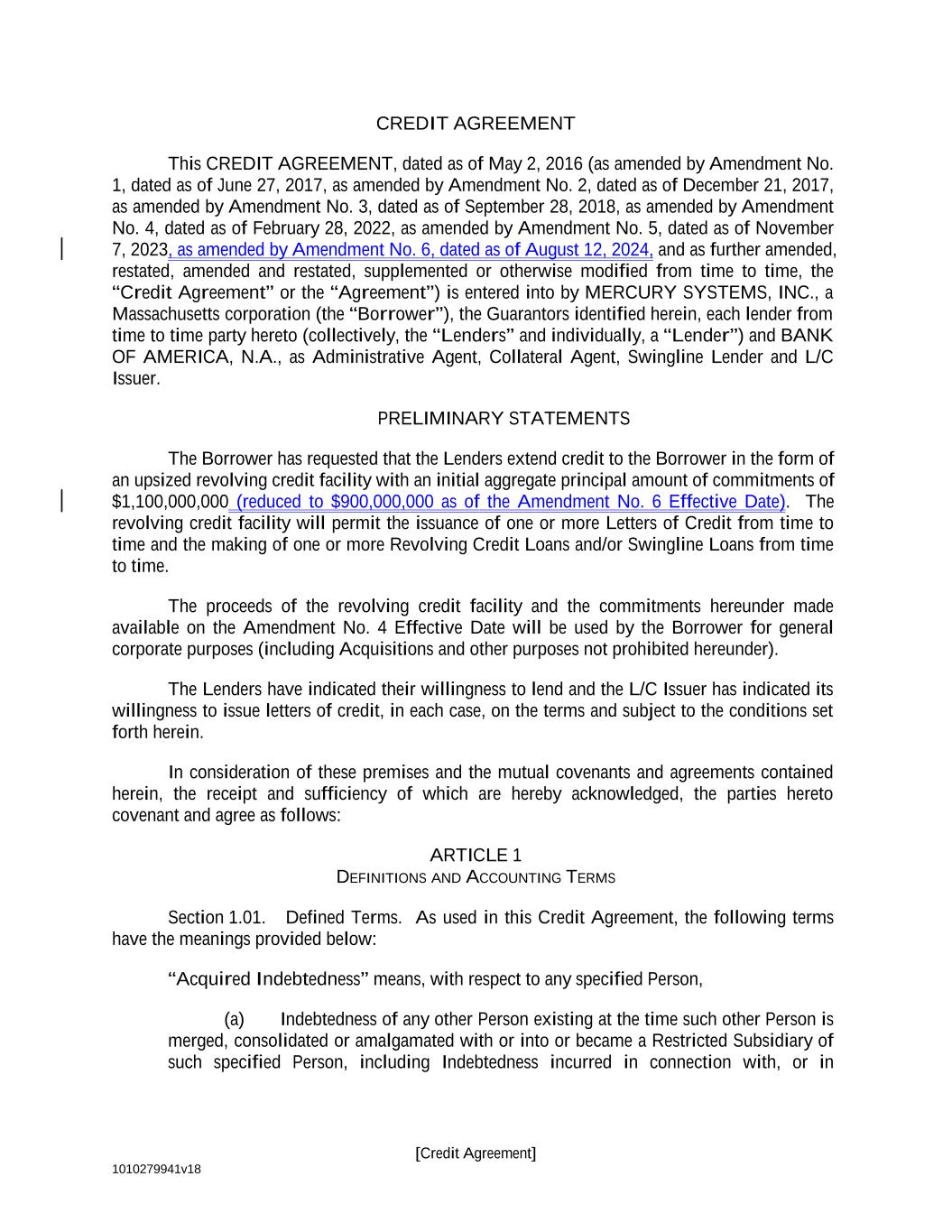 CREDIT AGREEMENT This CREDIT AGREEMENT, dated as of May 2, 2016 (as amended by Amendment No. 1, dated as of June 27, 2017, as amended by Amendment No. 2, dated as of December 21, 2017, as amended by Amendment No. 3, dated as of September 28, 2018, as amended by Amendment No. 4, dated as of February 28, 2022, as amended by Amendment No. 5, dated as of November 7, 2023, as amended by Amendment No. 6, dated as of August 12, 2024, and as further amended, restated, amended and restated, supplemented or otherwise modified from time to time, the “Credit Agreement” or the “Agreement”) is entered into by MERCURY SYSTEMS, INC., a Massachusetts corporation (the “Borrower”), the Guarantors identified herein, each lender from time to time party hereto (collectively, the “Lenders” and individually, a “Lender”) and BANK OF AMERICA, N.A., as Administrative Agent, Collateral Agent, Swingline Lender and L/C Issuer. PRELIMINARY STATEMENTS The Borrower has requested that the Lenders extend credit to the Borrower in the form of an upsized revolving credit facility with an initial aggregate principal amount of commitments of $1,100,000,000 (reduced to $900,000,000 as of the Amendment No. 6 Effective Date). The revolving credit facility will permit the issuance of one or more Letters of Credit from time to time and the making of one or more Revolving Credit Loans and/or Swingline Loans from time to time. The proceeds of the revolving credit facility and the commitments hereunder made available on the Amendment No. 4 Effective Date will be used by the Borrower for general corporate purposes (including Acquisitions and other purposes not prohibited hereunder). The Lenders have indicated their willingness to lend and the L/C Issuer has indicated its willingness to issue letters of credit, in each case, on the terms and subject to the conditions set forth herein. In consideration of these premises and the mutual covenants and agreements contained herein, the receipt and sufficiency of which are hereby acknowledged, the parties hereto covenant and agree as follows: ARTICLE 1 DEFINITIONS AND ACCOUNTING TERMS Section 1.01. Defined Terms. As used in this Credit Agreement, the following terms have the meanings provided below: “Acquired Indebtedness” means, with respect to any specified Person, (a) Indebtedness of any other Person existing at the time such other Person is merged, consolidated or amalgamated with or into or became a Restricted Subsidiary of such specified Person, including Indebtedness incurred in connection with, or in [Credit Agreement] 1010279941v18