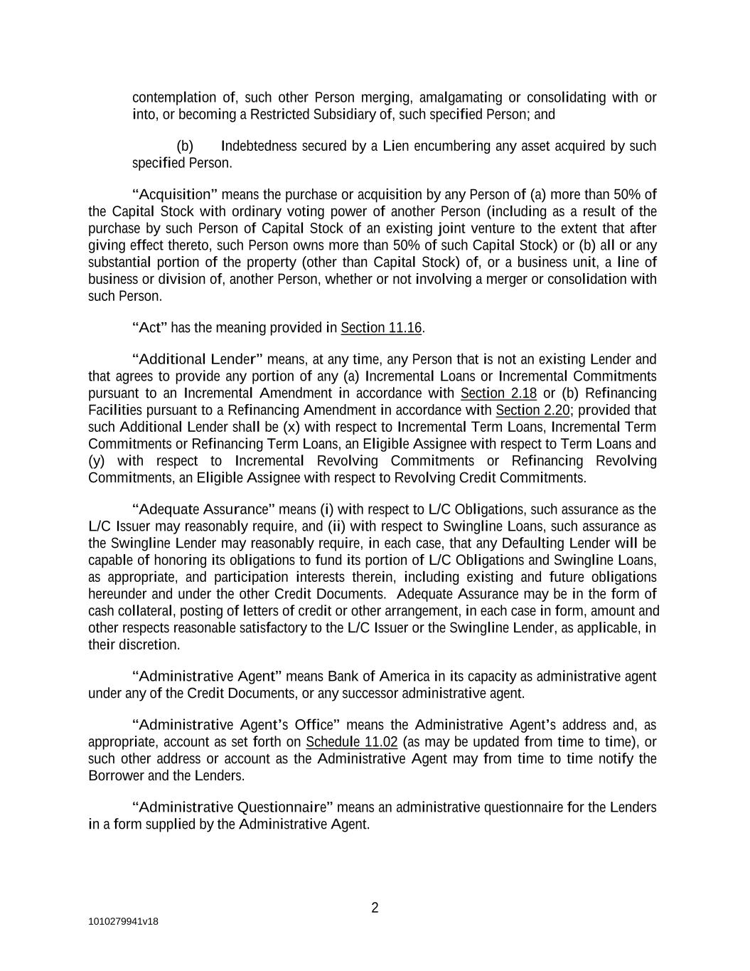 contemplation of, such other Person merging, amalgamating or consolidating with or into, or becoming a Restricted Subsidiary of, such specified Person; and (b) Indebtedness secured by a Lien encumbering any asset acquired by such specified Person. “Acquisition” means the purchase or acquisition by any Person of (a) more than 50% of the Capital Stock with ordinary voting power of another Person (including as a result of the purchase by such Person of Capital Stock of an existing joint venture to the extent that after giving effect thereto, such Person owns more than 50% of such Capital Stock) or (b) all or any substantial portion of the property (other than Capital Stock) of, or a business unit, a line of business or division of, another Person, whether or not involving a merger or consolidation with such Person. “Act” has the meaning provided in Section 11.16. “Additional Lender” means, at any time, any Person that is not an existing Lender and that agrees to provide any portion of any (a) Incremental Loans or Incremental Commitments pursuant to an Incremental Amendment in accordance with Section 2.18 or (b) Refinancing Facilities pursuant to a Refinancing Amendment in accordance with Section 2.20; provided that such Additional Lender shall be (x) with respect to Incremental Term Loans, Incremental Term Commitments or Refinancing Term Loans, an Eligible Assignee with respect to Term Loans and (y) with respect to Incremental Revolving Commitments or Refinancing Revolving Commitments, an Eligible Assignee with respect to Revolving Credit Commitments. “Adequate Assurance” means (i) with respect to L/C Obligations, such assurance as the L/C Issuer may reasonably require, and (ii) with respect to Swingline Loans, such assurance as the Swingline Lender may reasonably require, in each case, that any Defaulting Lender will be capable of honoring its obligations to fund its portion of L/C Obligations and Swingline Loans, as appropriate, and participation interests therein, including existing and future obligations hereunder and under the other Credit Documents. Adequate Assurance may be in the form of cash collateral, posting of letters of credit or other arrangement, in each case in form, amount and other respects reasonable satisfactory to the L/C Issuer or the Swingline Lender, as applicable, in their discretion. “Administrative Agent” means Bank of America in its capacity as administrative agent under any of the Credit Documents, or any successor administrative agent. “Administrative Agent’s Office” means the Administrative Agent’s address and, as appropriate, account as set forth on Schedule 11.02 (as may be updated from time to time), or such other address or account as the Administrative Agent may from time to time notify the Borrower and the Lenders. “Administrative Questionnaire” means an administrative questionnaire for the Lenders in a form supplied by the Administrative Agent. 2 1010279941v18