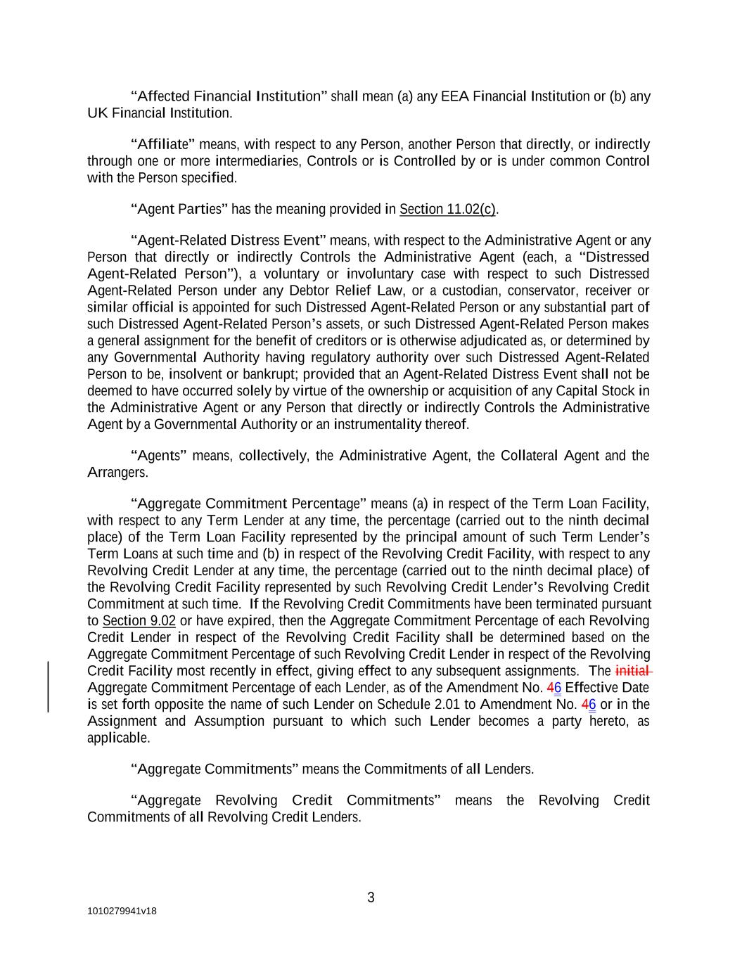 “Affected Financial Institution” shall mean (a) any EEA Financial Institution or (b) any UK Financial Institution. “Affiliate” means, with respect to any Person, another Person that directly, or indirectly through one or more intermediaries, Controls or is Controlled by or is under common Control with the Person specified. “Agent Parties” has the meaning provided in Section 11.02(c). “Agent-Related Distress Event” means, with respect to the Administrative Agent or any Person that directly or indirectly Controls the Administrative Agent (each, a “Distressed Agent-Related Person”), a voluntary or involuntary case with respect to such Distressed Agent-Related Person under any Debtor Relief Law, or a custodian, conservator, receiver or similar official is appointed for such Distressed Agent-Related Person or any substantial part of such Distressed Agent-Related Person’s assets, or such Distressed Agent-Related Person makes a general assignment for the benefit of creditors or is otherwise adjudicated as, or determined by any Governmental Authority having regulatory authority over such Distressed Agent-Related Person to be, insolvent or bankrupt; provided that an Agent-Related Distress Event shall not be deemed to have occurred solely by virtue of the ownership or acquisition of any Capital Stock in the Administrative Agent or any Person that directly or indirectly Controls the Administrative Agent by a Governmental Authority or an instrumentality thereof. “Agents” means, collectively, the Administrative Agent, the Collateral Agent and the Arrangers. “Aggregate Commitment Percentage” means (a) in respect of the Term Loan Facility, with respect to any Term Lender at any time, the percentage (carried out to the ninth decimal place) of the Term Loan Facility represented by the principal amount of such Term Lender’s Term Loans at such time and (b) in respect of the Revolving Credit Facility, with respect to any Revolving Credit Lender at any time, the percentage (carried out to the ninth decimal place) of the Revolving Credit Facility represented by such Revolving Credit Lender’s Revolving Credit Commitment at such time. If the Revolving Credit Commitments have been terminated pursuant to Section 9.02 or have expired, then the Aggregate Commitment Percentage of each Revolving Credit Lender in respect of the Revolving Credit Facility shall be determined based on the Aggregate Commitment Percentage of such Revolving Credit Lender in respect of the Revolving Credit Facility most recently in effect, giving effect to any subsequent assignments. The initial Aggregate Commitment Percentage of each Lender, as of the Amendment No. 46 Effective Date is set forth opposite the name of such Lender on Schedule 2.01 to Amendment No. 46 or in the Assignment and Assumption pursuant to which such Lender becomes a party hereto, as applicable. “Aggregate Commitments” means the Commitments of all Lenders. “Aggregate Revolving Credit Commitments” means the Revolving Credit Commitments of all Revolving Credit Lenders. 3 1010279941v18
