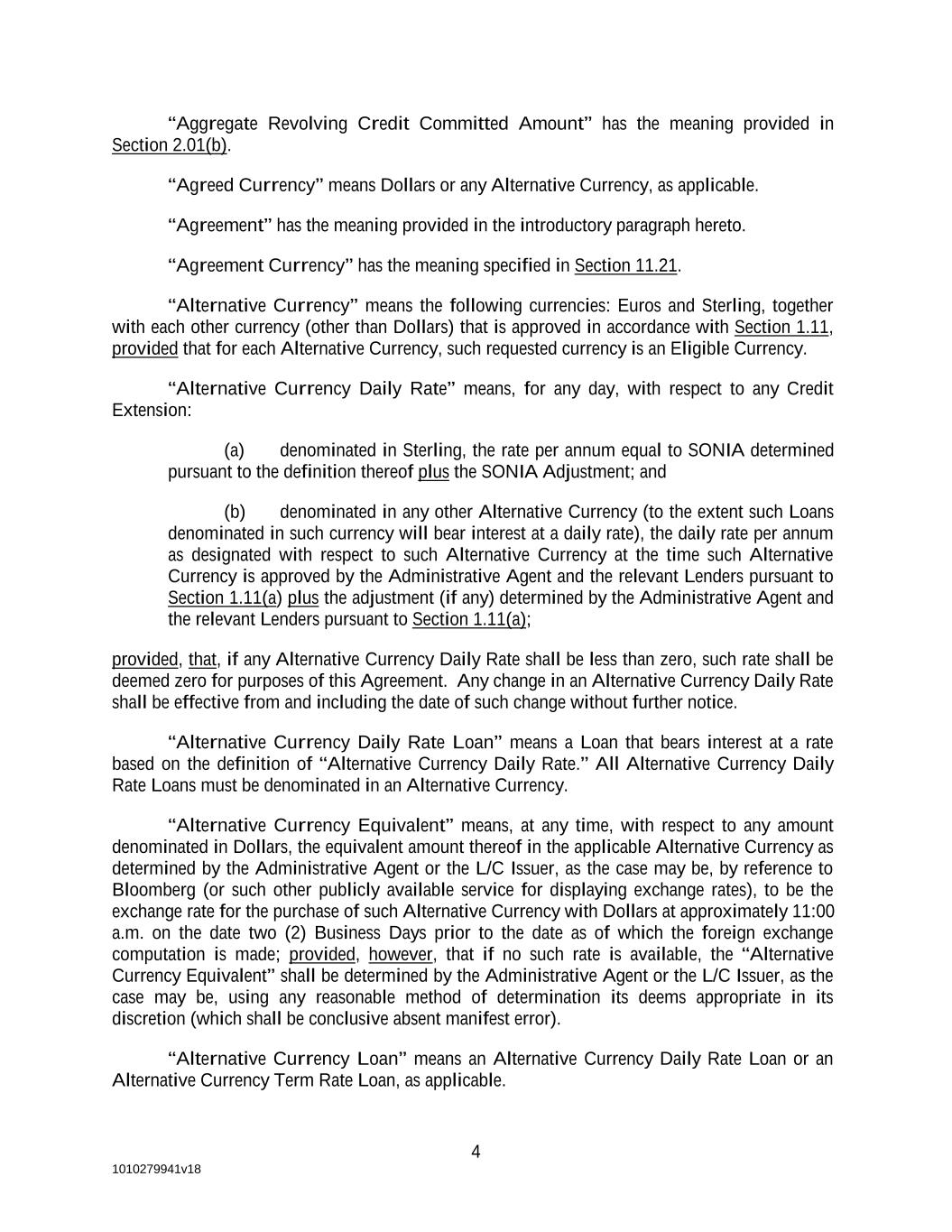 “Aggregate Revolving Credit Committed Amount” has the meaning provided in Section 2.01(b). “Agreed Currency” means Dollars or any Alternative Currency, as applicable. “Agreement” has the meaning provided in the introductory paragraph hereto. “Agreement Currency” has the meaning specified in Section 11.21. “Alternative Currency” means the following currencies: Euros and Sterling, together with each other currency (other than Dollars) that is approved in accordance with Section 1.11, provided that for each Alternative Currency, such requested currency is an Eligible Currency. “Alternative Currency Daily Rate” means, for any day, with respect to any Credit Extension: (a) denominated in Sterling, the rate per annum equal to SONIA determined pursuant to the definition thereof plus the SONIA Adjustment; and (b) denominated in any other Alternative Currency (to the extent such Loans denominated in such currency will bear interest at a daily rate), the daily rate per annum as designated with respect to such Alternative Currency at the time such Alternative Currency is approved by the Administrative Agent and the relevant Lenders pursuant to Section 1.11(a) plus the adjustment (if any) determined by the Administrative Agent and the relevant Lenders pursuant to Section 1.11(a); provided, that, if any Alternative Currency Daily Rate shall be less than zero, such rate shall be deemed zero for purposes of this Agreement. Any change in an Alternative Currency Daily Rate shall be effective from and including the date of such change without further notice. “Alternative Currency Daily Rate Loan” means a Loan that bears interest at a rate based on the definition of “Alternative Currency Daily Rate.” All Alternative Currency Daily Rate Loans must be denominated in an Alternative Currency. “Alternative Currency Equivalent” means, at any time, with respect to any amount denominated in Dollars, the equivalent amount thereof in the applicable Alternative Currency as determined by the Administrative Agent or the L/C Issuer, as the case may be, by reference to Bloomberg (or such other publicly available service for displaying exchange rates), to be the exchange rate for the purchase of such Alternative Currency with Dollars at approximately 11:00 a.m. on the date two (2) Business Days prior to the date as of which the foreign exchange computation is made; provided, however, that if no such rate is available, the “Alternative Currency Equivalent” shall be determined by the Administrative Agent or the L/C Issuer, as the case may be, using any reasonable method of determination its deems appropriate in its discretion (which shall be conclusive absent manifest error). “Alternative Currency Loan” means an Alternative Currency Daily Rate Loan or an Alternative Currency Term Rate Loan, as applicable. 4 1010279941v18