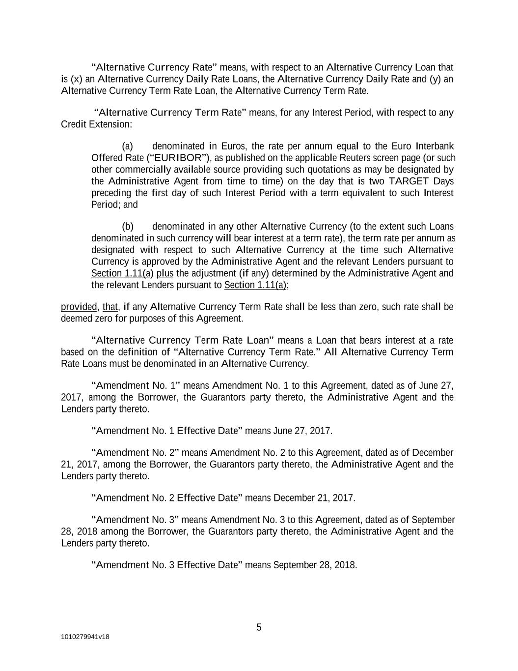 “Alternative Currency Rate” means, with respect to an Alternative Currency Loan that is (x) an Alternative Currency Daily Rate Loans, the Alternative Currency Daily Rate and (y) an Alternative Currency Term Rate Loan, the Alternative Currency Term Rate. “Alternative Currency Term Rate” means, for any Interest Period, with respect to any Credit Extension: (a) denominated in Euros, the rate per annum equal to the Euro Interbank Offered Rate (“EURIBOR”), as published on the applicable Reuters screen page (or such other commercially available source providing such quotations as may be designated by the Administrative Agent from time to time) on the day that is two TARGET Days preceding the first day of such Interest Period with a term equivalent to such Interest Period; and (b) denominated in any other Alternative Currency (to the extent such Loans denominated in such currency will bear interest at a term rate), the term rate per annum as designated with respect to such Alternative Currency at the time such Alternative Currency is approved by the Administrative Agent and the relevant Lenders pursuant to Section 1.11(a) plus the adjustment (if any) determined by the Administrative Agent and the relevant Lenders pursuant to Section 1.11(a); provided, that, if any Alternative Currency Term Rate shall be less than zero, such rate shall be deemed zero for purposes of this Agreement. “Alternative Currency Term Rate Loan” means a Loan that bears interest at a rate based on the definition of “Alternative Currency Term Rate.” All Alternative Currency Term Rate Loans must be denominated in an Alternative Currency. “Amendment No. 1” means Amendment No. 1 to this Agreement, dated as of June 27, 2017, among the Borrower, the Guarantors party thereto, the Administrative Agent and the Lenders party thereto. “Amendment No. 1 Effective Date” means June 27, 2017. “Amendment No. 2” means Amendment No. 2 to this Agreement, dated as of December 21, 2017, among the Borrower, the Guarantors party thereto, the Administrative Agent and the Lenders party thereto. “Amendment No. 2 Effective Date” means December 21, 2017. “Amendment No. 3” means Amendment No. 3 to this Agreement, dated as of September 28, 2018 among the Borrower, the Guarantors party thereto, the Administrative Agent and the Lenders party thereto. “Amendment No. 3 Effective Date” means September 28, 2018. 5 1010279941v18