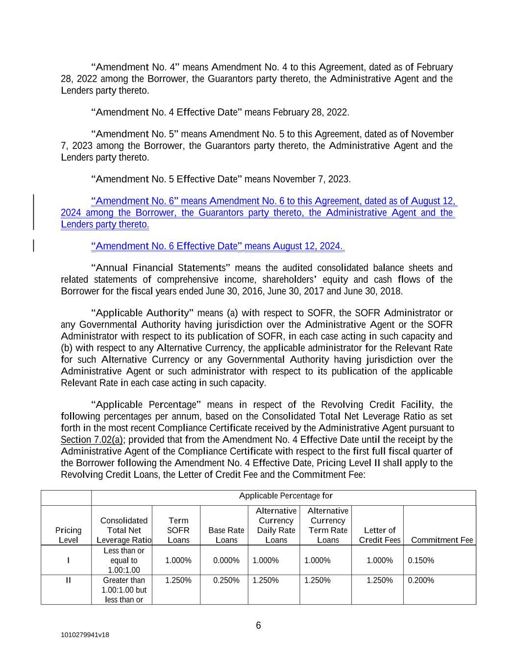 6 1010279941v18 Less than or equal to 1.00:1.00 1.000% Term SOFR Loans 0.000% 1.000% Base Rate Loans 1.000% Applicable Percentage for 1.000% Alternative Currency Daily Rate Loans 0.150% “Amendment No. 4” means Amendment No. 4 to this Agreement, dated as of February 28, 2022 among the Borrower, the Guarantors party thereto, the Administrative Agent and the Lenders party thereto. “Amendment No. 4 Effective Date” means February 28, 2022. “Amendment No. 5” means Amendment No. 5 to this Agreement, dated as of November 7, 2023 among the Borrower, the Guarantors party thereto, the Administrative Agent and the Lenders party thereto. “Amendment No. 5 Effective Date” means November 7, 2023. “Amendment No. 6” means Amendment No. 6 to this Agreement, dated as of August 12, 2024 among the Borrower, the Guarantors party thereto, the Administrative Agent and the Lenders party thereto. “Amendment No. 6 Effective Date” means August 12, 2024. “Annual Financial Statements” means the audited consolidated balance sheets and related statements of comprehensive income, shareholders’ equity and cash flows of the Borrower for the fiscal years ended June 30, 2016, June 30, 2017 and June 30, 2018. “Applicable Authority” means (a) with respect to SOFR, the SOFR Administrator or any Governmental Authority having jurisdiction over the Administrative Agent or the SOFR Administrator with respect to its publication of SOFR, in each case acting in such capacity and (b) with respect to any Alternative Currency, the applicable administrator for the Relevant Rate for such Alternative Currency or any Governmental Authority having jurisdiction over the Administrative Agent or such administrator with respect to its publication of the applicable Relevant Rate in each case acting in such capacity. “Applicable Percentage” means in respect of the Revolving Credit Facility, the following percentages per annum, based on the Consolidated Total Net Leverage Ratio as set forth in the most recent Compliance Certificate received by the Administrative Agent pursuant to Section 7.02(a); provided that from the Amendment No. 4 Effective Date until the receipt by the Administrative Agent of the Compliance Certificate with respect to the first full fiscal quarter of the Borrower following the Amendment No. 4 Effective Date, Pricing Level II shall apply to the Revolving Credit Loans, the Letter of Credit Fee and the Commitment Fee: Alternative Currency Term Rate Loans II Greater than 1.00:1.00 but less than or Letter of Credit Fees 1.250% 0.250% Commitment Fee 1.250% Pricing Level 1.250% 1.250% 0.200% I Consolidated Total Net Leverage Ratio
