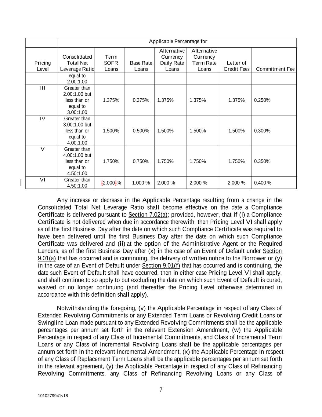 7 1010279941v18 1.375% Alternative Currency Term Rate Loans 0.250% Letter of Credit Fees IV Pricing Level Greater than 3.00:1.00 but less than or equal to 4.00:1.00 Commitment Fee 1.500% 0.500% 1.500% 1.500% Consolidated Total Net Leverage Ratio 1.500% equal to 2.00:1.00 0.300% V Greater than 4.00:1.00 but less than or equal to 4.50:1.00 1.750% 0.750% 1.750% 1.750% 1.750% 0.350% III Term SOFR Loans VI Greater than 2.00:1.00 but less than or equal to 3.00:1.00 Greater than 4.50:1.00 Applicable Percentage for [2.000]% 1.375% 1.000 % Base Rate Loans 2.000 % 0.375% 2.000 % 2.000 % 1.375% 0.400 % Alternative Currency Daily Rate Loans Any increase or decrease in the Applicable Percentage resulting from a change in the Consolidated Total Net Leverage Ratio shall become effective on the date a Compliance Certificate is delivered pursuant to Section 7.02(a); provided, however, that if (i) a Compliance Certificate is not delivered when due in accordance therewith, then Pricing Level VI shall apply as of the first Business Day after the date on which such Compliance Certificate was required to have been delivered until the first Business Day after the date on which such Compliance Certificate was delivered and (ii) at the option of the Administrative Agent or the Required Lenders, as of the first Business Day after (x) in the case of an Event of Default under Section 9.01(a) that has occurred and is continuing, the delivery of written notice to the Borrower or (y) in the case of an Event of Default under Section 9.01(f) that has occurred and is continuing, the date such Event of Default shall have occurred, then in either case Pricing Level VI shall apply, and shall continue to so apply to but excluding the date on which such Event of Default is cured, waived or no longer continuing (and thereafter the Pricing Level otherwise determined in accordance with this definition shall apply). Notwithstanding the foregoing, (v) the Applicable Percentage in respect of any Class of Extended Revolving Commitments or any Extended Term Loans or Revolving Credit Loans or Swingline Loan made pursuant to any Extended Revolving Commitments shall be the applicable percentages per annum set forth in the relevant Extension Amendment, (w) the Applicable Percentage in respect of any Class of Incremental Commitments, and Class of Incremental Term Loans or any Class of Incremental Revolving Loans shall be the applicable percentages per annum set forth in the relevant Incremental Amendment, (x) the Applicable Percentage in respect of any Class of Replacement Term Loans shall be the applicable percentages per annum set forth in the relevant agreement, (y) the Applicable Percentage in respect of any Class of Refinancing Revolving Commitments, any Class of Refinancing Revolving Loans or any Class of 1.375%
