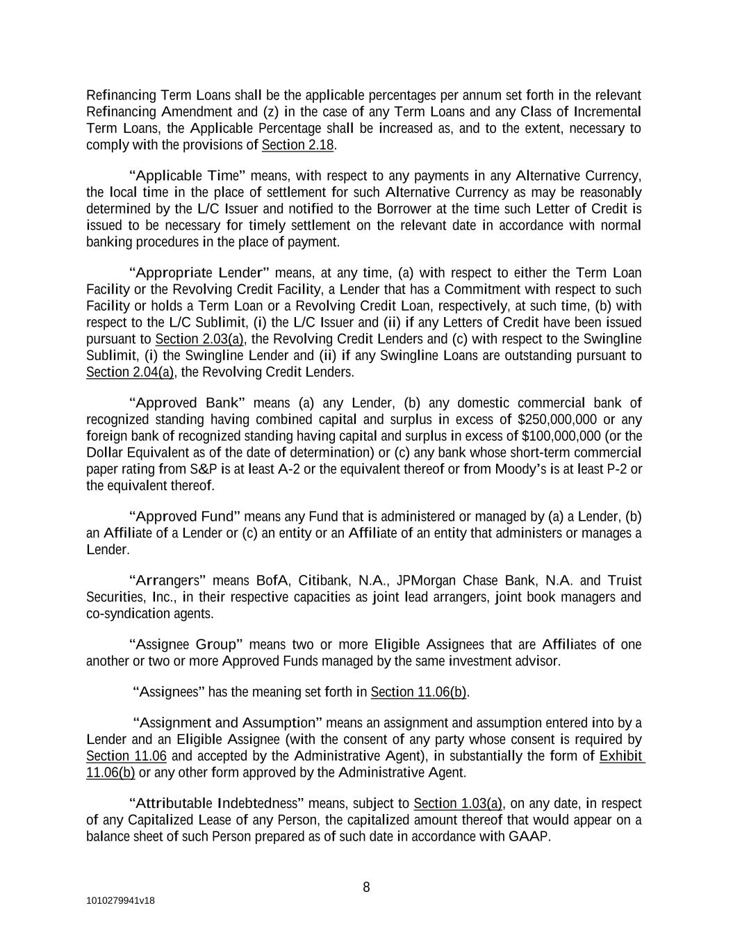 Refinancing Term Loans shall be the applicable percentages per annum set forth in the relevant Refinancing Amendment and (z) in the case of any Term Loans and any Class of Incremental Term Loans, the Applicable Percentage shall be increased as, and to the extent, necessary to comply with the provisions of Section 2.18. “Applicable Time” means, with respect to any payments in any Alternative Currency, the local time in the place of settlement for such Alternative Currency as may be reasonably determined by the L/C Issuer and notified to the Borrower at the time such Letter of Credit is issued to be necessary for timely settlement on the relevant date in accordance with normal banking procedures in the place of payment. “Appropriate Lender” means, at any time, (a) with respect to either the Term Loan Facility or the Revolving Credit Facility, a Lender that has a Commitment with respect to such Facility or holds a Term Loan or a Revolving Credit Loan, respectively, at such time, (b) with respect to the L/C Sublimit, (i) the L/C Issuer and (ii) if any Letters of Credit have been issued pursuant to Section 2.03(a), the Revolving Credit Lenders and (c) with respect to the Swingline Sublimit, (i) the Swingline Lender and (ii) if any Swingline Loans are outstanding pursuant to Section 2.04(a), the Revolving Credit Lenders. “Approved Bank” means (a) any Lender, (b) any domestic commercial bank of recognized standing having combined capital and surplus in excess of $250,000,000 or any foreign bank of recognized standing having capital and surplus in excess of $100,000,000 (or the Dollar Equivalent as of the date of determination) or (c) any bank whose short-term commercial paper rating from S&P is at least A-2 or the equivalent thereof or from Moody’s is at least P-2 or the equivalent thereof. “Approved Fund” means any Fund that is administered or managed by (a) a Lender, (b) an Affiliate of a Lender or (c) an entity or an Affiliate of an entity that administers or manages a Lender. “Arrangers” means BofA, Citibank, N.A., JPMorgan Chase Bank, N.A. and Truist Securities, Inc., in their respective capacities as joint lead arrangers, joint book managers and co-syndication agents. “Assignee Group” means two or more Eligible Assignees that are Affiliates of one another or two or more Approved Funds managed by the same investment advisor. “Assignees” has the meaning set forth in Section 11.06(b). “Assignment and Assumption” means an assignment and assumption entered into by a Lender and an Eligible Assignee (with the consent of any party whose consent is required by Section 11.06 and accepted by the Administrative Agent), in substantially the form of Exhibit 11.06(b) or any other form approved by the Administrative Agent. “Attributable Indebtedness” means, subject to Section 1.03(a), on any date, in respect of any Capitalized Lease of any Person, the capitalized amount thereof that would appear on a balance sheet of such Person prepared as of such date in accordance with GAAP. 8 1010279941v18