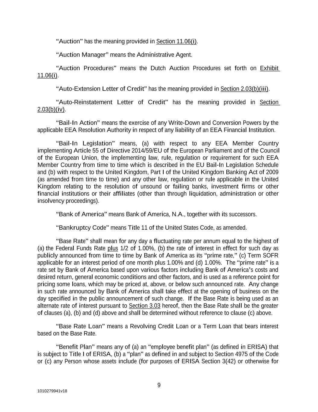 “Auction” has the meaning provided in Section 11.06(i). “Auction Manager” means the Administrative Agent. “Auction Procedures” means the Dutch Auction Procedures set forth on Exhibit 11.06(i). “Auto-Extension Letter of Credit” has the meaning provided in Section 2.03(b)(iii). “Auto-Reinstatement Letter of Credit” has the meaning provided in Section 2.03(b)(iv). “Bail-In Action” means the exercise of any Write-Down and Conversion Powers by the applicable EEA Resolution Authority in respect of any liability of an EEA Financial Institution. “Bail-In Legislation” means, (a) with respect to any EEA Member Country implementing Article 55 of Directive 2014/59/EU of the European Parliament and of the Council of the European Union, the implementing law, rule, regulation or requirement for such EEA Member Country from time to time which is described in the EU Bail-In Legislation Schedule and (b) with respect to the United Kingdom, Part I of the United Kingdom Banking Act of 2009 (as amended from time to time) and any other law, regulation or rule applicable in the United Kingdom relating to the resolution of unsound or failing banks, investment firms or other financial institutions or their affiliates (other than through liquidation, administration or other insolvency proceedings). “Bank of America” means Bank of America, N.A., together with its successors. “Bankruptcy Code” means Title 11 of the United States Code, as amended. “Base Rate” shall mean for any day a fluctuating rate per annum equal to the highest of (a) the Federal Funds Rate plus 1/2 of 1.00%, (b) the rate of interest in effect for such day as publicly announced from time to time by Bank of America as its “prime rate,” (c) Term SOFR applicable for an interest period of one month plus 1.00% and (d) 1.00%. The “prime rate” is a rate set by Bank of America based upon various factors including Bank of America’s costs and desired return, general economic conditions and other factors, and is used as a reference point for pricing some loans, which may be priced at, above, or below such announced rate. Any change in such rate announced by Bank of America shall take effect at the opening of business on the day specified in the public announcement of such change. If the Base Rate is being used as an alternate rate of interest pursuant to Section 3.03 hereof, then the Base Rate shall be the greater of clauses (a), (b) and (d) above and shall be determined without reference to clause (c) above. “Base Rate Loan” means a Revolving Credit Loan or a Term Loan that bears interest based on the Base Rate. “Benefit Plan” means any of (a) an “employee benefit plan” (as defined in ERISA) that is subject to Title I of ERISA, (b) a “plan” as defined in and subject to Section 4975 of the Code or (c) any Person whose assets include (for purposes of ERISA Section 3(42) or otherwise for 9 1010279941v18