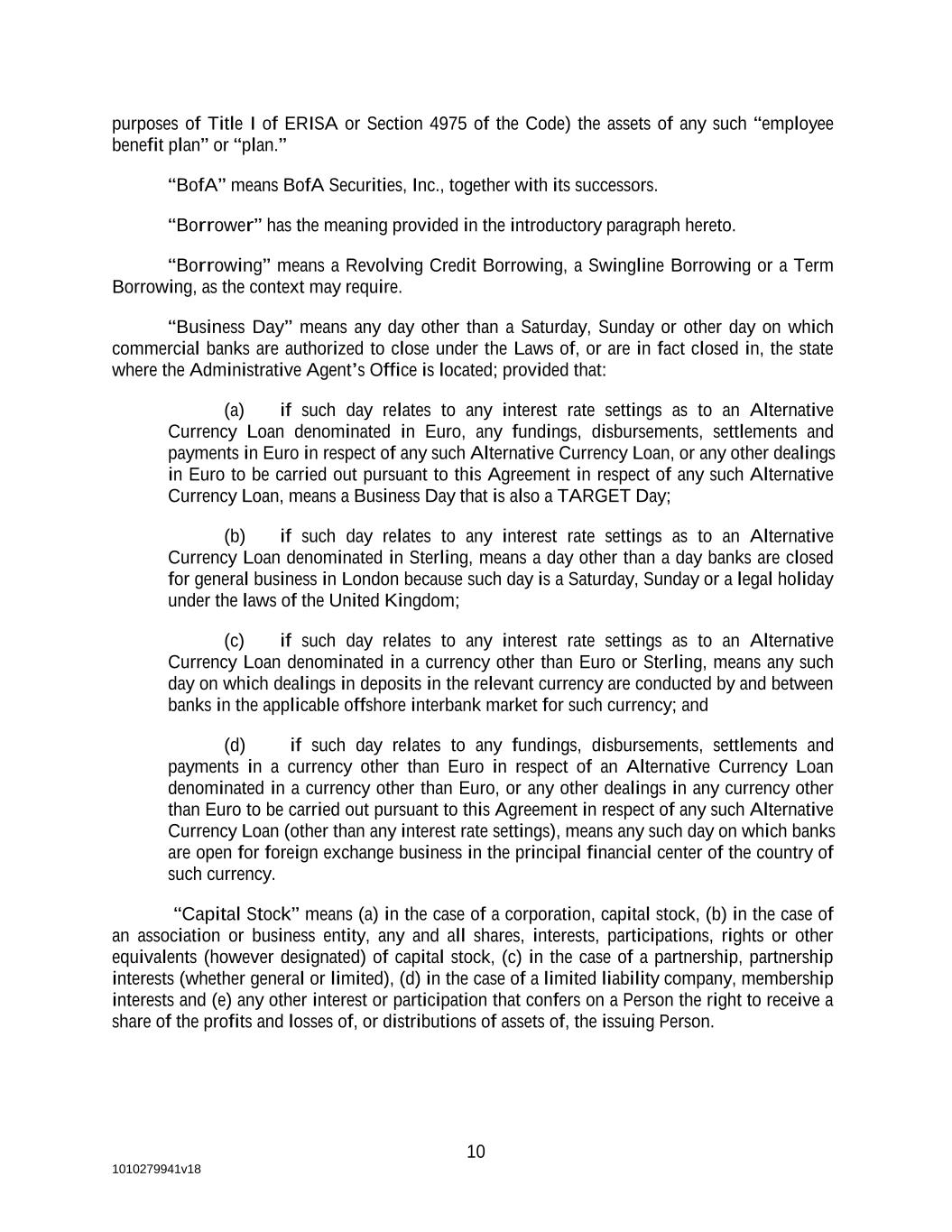 purposes of Title I of ERISA or Section 4975 of the Code) the assets of any such “employee benefit plan” or “plan.” “BofA” means BofA Securities, Inc., together with its successors. “Borrower” has the meaning provided in the introductory paragraph hereto. “Borrowing” means a Revolving Credit Borrowing, a Swingline Borrowing or a Term Borrowing, as the context may require. “Business Day” means any day other than a Saturday, Sunday or other day on which commercial banks are authorized to close under the Laws of, or are in fact closed in, the state where the Administrative Agent’s Office is located; provided that: (a) if such day relates to any interest rate settings as to an Alternative Currency Loan denominated in Euro, any fundings, disbursements, settlements and payments in Euro in respect of any such Alternative Currency Loan, or any other dealings in Euro to be carried out pursuant to this Agreement in respect of any such Alternative Currency Loan, means a Business Day that is also a TARGET Day; (b) if such day relates to any interest rate settings as to an Alternative Currency Loan denominated in Sterling, means a day other than a day banks are closed for general business in London because such day is a Saturday, Sunday or a legal holiday under the laws of the United Kingdom; (c) if such day relates to any interest rate settings as to an Alternative Currency Loan denominated in a currency other than Euro or Sterling, means any such day on which dealings in deposits in the relevant currency are conducted by and between banks in the applicable offshore interbank market for such currency; and (d) if such day relates to any fundings, disbursements, settlements and payments in a currency other than Euro in respect of an Alternative Currency Loan denominated in a currency other than Euro, or any other dealings in any currency other than Euro to be carried out pursuant to this Agreement in respect of any such Alternative Currency Loan (other than any interest rate settings), means any such day on which banks are open for foreign exchange business in the principal financial center of the country of such currency. “Capital Stock” means (a) in the case of a corporation, capital stock, (b) in the case of an association or business entity, any and all shares, interests, participations, rights or other equivalents (however designated) of capital stock, (c) in the case of a partnership, partnership interests (whether general or limited), (d) in the case of a limited liability company, membership interests and (e) any other interest or participation that confers on a Person the right to receive a share of the profits and losses of, or distributions of assets of, the issuing Person. 10 1010279941v18