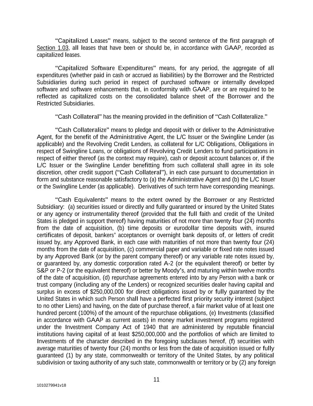 “Capitalized Leases” means, subject to the second sentence of the first paragraph of Section 1.03, all leases that have been or should be, in accordance with GAAP, recorded as capitalized leases. “Capitalized Software Expenditures” means, for any period, the aggregate of all expenditures (whether paid in cash or accrued as liabilities) by the Borrower and the Restricted Subsidiaries during such period in respect of purchased software or internally developed software and software enhancements that, in conformity with GAAP, are or are required to be reflected as capitalized costs on the consolidated balance sheet of the Borrower and the Restricted Subsidiaries. “Cash Collateral” has the meaning provided in the definition of “Cash Collateralize.” “Cash Collateralize” means to pledge and deposit with or deliver to the Administrative Agent, for the benefit of the Administrative Agent, the L/C Issuer or the Swingline Lender (as applicable) and the Revolving Credit Lenders, as collateral for L/C Obligations, Obligations in respect of Swingline Loans, or obligations of Revolving Credit Lenders to fund participations in respect of either thereof (as the context may require), cash or deposit account balances or, if the L/C Issuer or the Swingline Lender benefitting from such collateral shall agree in its sole discretion, other credit support (“Cash Collateral”), in each case pursuant to documentation in form and substance reasonable satisfactory to (a) the Administrative Agent and (b) the L/C Issuer or the Swingline Lender (as applicable). Derivatives of such term have corresponding meanings. “Cash Equivalents” means to the extent owned by the Borrower or any Restricted Subsidiary: (a) securities issued or directly and fully guaranteed or insured by the United States or any agency or instrumentality thereof (provided that the full faith and credit of the United States is pledged in support thereof) having maturities of not more than twenty four (24) months from the date of acquisition, (b) time deposits or eurodollar time deposits with, insured certificates of deposit, bankers’ acceptances or overnight bank deposits of, or letters of credit issued by, any Approved Bank, in each case with maturities of not more than twenty four (24) months from the date of acquisition, (c) commercial paper and variable or fixed rate notes issued by any Approved Bank (or by the parent company thereof) or any variable rate notes issued by, or guaranteed by, any domestic corporation rated A-2 (or the equivalent thereof) or better by S&P or P-2 (or the equivalent thereof) or better by Moody’s, and maturing within twelve months of the date of acquisition, (d) repurchase agreements entered into by any Person with a bank or trust company (including any of the Lenders) or recognized securities dealer having capital and surplus in excess of $250,000,000 for direct obligations issued by or fully guaranteed by the United States in which such Person shall have a perfected first priority security interest (subject to no other Liens) and having, on the date of purchase thereof, a fair market value of at least one hundred percent (100%) of the amount of the repurchase obligations, (e) Investments (classified in accordance with GAAP as current assets) in money market investment programs registered under the Investment Company Act of 1940 that are administered by reputable financial institutions having capital of at least $250,000,000 and the portfolios of which are limited to Investments of the character described in the foregoing subclauses hereof, (f) securities with average maturities of twenty four (24) months or less from the date of acquisition issued or fully guaranteed (1) by any state, commonwealth or territory of the United States, by any political subdivision or taxing authority of any such state, commonwealth or territory or by (2) any foreign 11 1010279941v18