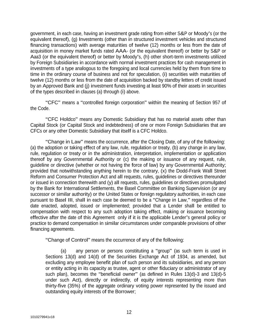 government, in each case, having an investment grade rating from either S&P or Moody’s (or the equivalent thereof), (g) Investments (other than in structured investment vehicles and structured financing transactions) with average maturities of twelve (12) months or less from the date of acquisition in money market funds rated AAA- (or the equivalent thereof) or better by S&P or Aaa3 (or the equivalent thereof) or better by Moody’s, (h) other short-term investments utilized by Foreign Subsidiaries in accordance with normal investment practices for cash management in investments of a type analogous to the foregoing and local currencies held by them from time to time in the ordinary course of business and not for speculation, (i) securities with maturities of twelve (12) months or less from the date of acquisition backed by standby letters of credit issued by an Approved Bank and (j) investment funds investing at least 90% of their assets in securities of the types described in clauses (a) through (i) above. “CFC” means a “controlled foreign corporation” within the meaning of Section 957 of the Code. “CFC Holdco” means any Domestic Subsidiary that has no material assets other than Capital Stock (or Capital Stock and indebtedness) of one or more Foreign Subsidiaries that are CFCs or any other Domestic Subsidiary that itself is a CFC Holdco. “Change in Law” means the occurrence, after the Closing Date, of any of the following: (a) the adoption or taking effect of any law, rule, regulation or treaty, (b) any change in any law, rule, regulation or treaty or in the administration, interpretation, implementation or application thereof by any Governmental Authority or (c) the making or issuance of any request, rule, guideline or directive (whether or not having the force of law) by any Governmental Authority; provided that notwithstanding anything herein to the contrary, (x) the Dodd-Frank Wall Street Reform and Consumer Protection Act and all requests, rules, guidelines or directives thereunder or issued in connection therewith and (y) all requests, rules, guidelines or directives promulgated by the Bank for International Settlements, the Basel Committee on Banking Supervision (or any successor or similar authority) or the United States or foreign regulatory authorities, in each case pursuant to Basel III, shall in each case be deemed to be a “Change in Law,” regardless of the date enacted, adopted, issued or implemented; provided that a Lender shall be entitled to compensation with respect to any such adoption taking effect, making or issuance becoming effective after the date of this Agreement only if it is the applicable Lender’s general policy or practice to demand compensation in similar circumstances under comparable provisions of other financing agreements. “Change of Control” means the occurrence of any of the following: (a) any person or persons constituting a “group” (as such term is used in Sections 13(d) and 14(d) of the Securities Exchange Act of 1934, as amended, but excluding any employee benefit plan of such person and its subsidiaries, and any person or entity acting in its capacity as trustee, agent or other fiduciary or administrator of any such plan), becomes the “beneficial owner” (as defined in Rules 13(d)-3 and 13(d)-5 under such Act), directly or indirectly, of equity interests representing more than thirty-five (35%) of the aggregate ordinary voting power represented by the issued and outstanding equity interests of the Borrower; 12 1010279941v18