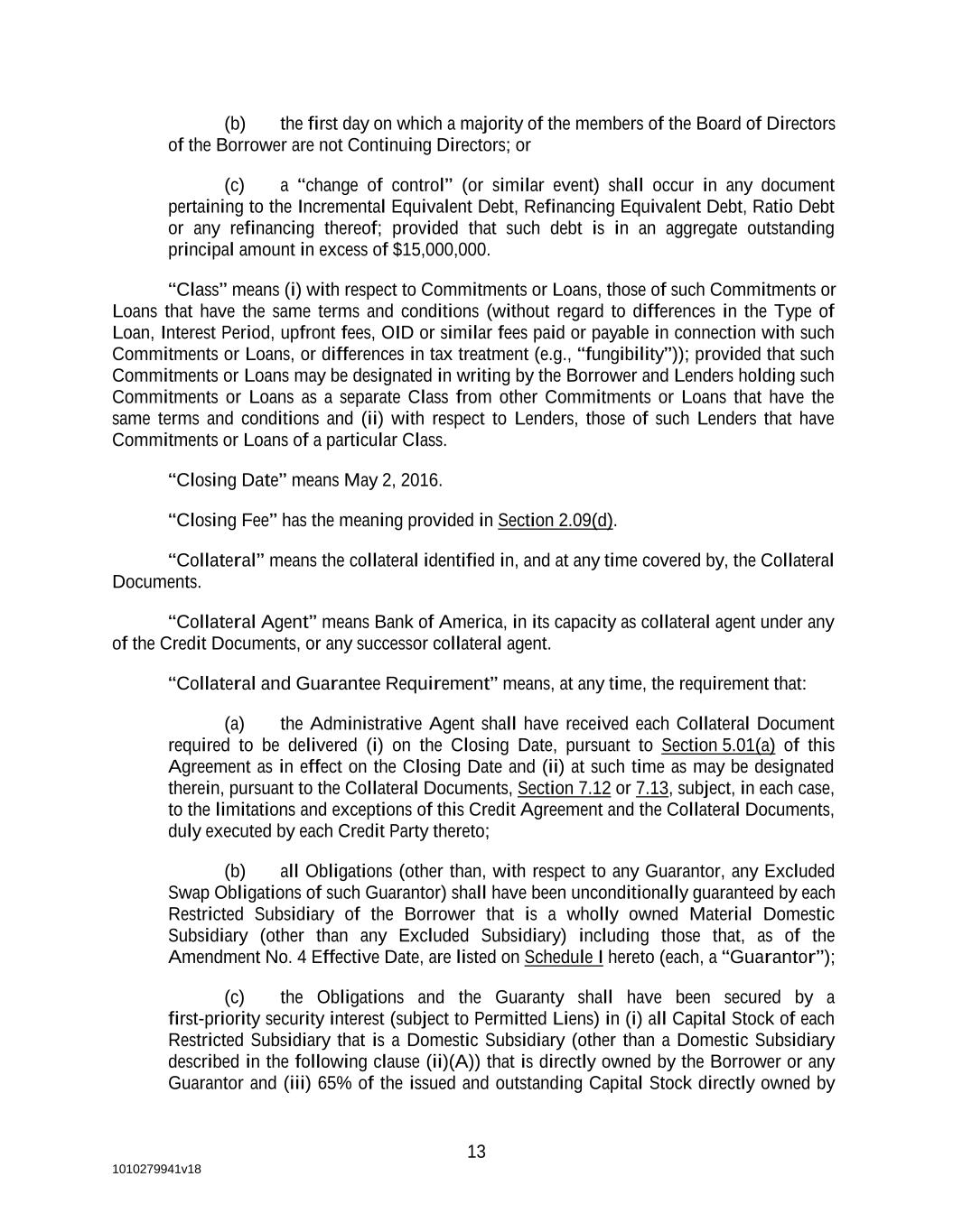 (b) the first day on which a majority of the members of the Board of Directors of the Borrower are not Continuing Directors; or (c) a “change of control” (or similar event) shall occur in any document pertaining to the Incremental Equivalent Debt, Refinancing Equivalent Debt, Ratio Debt or any refinancing thereof; provided that such debt is in an aggregate outstanding principal amount in excess of $15,000,000. “Class” means (i) with respect to Commitments or Loans, those of such Commitments or Loans that have the same terms and conditions (without regard to differences in the Type of Loan, Interest Period, upfront fees, OID or similar fees paid or payable in connection with such Commitments or Loans, or differences in tax treatment (e.g., “fungibility”)); provided that such Commitments or Loans may be designated in writing by the Borrower and Lenders holding such Commitments or Loans as a separate Class from other Commitments or Loans that have the same terms and conditions and (ii) with respect to Lenders, those of such Lenders that have Commitments or Loans of a particular Class. “Closing Date” means May 2, 2016. “Closing Fee” has the meaning provided in Section 2.09(d). “Collateral” means the collateral identified in, and at any time covered by, the Collateral Documents. “Collateral Agent” means Bank of America, in its capacity as collateral agent under any of the Credit Documents, or any successor collateral agent. “Collateral and Guarantee Requirement” means, at any time, the requirement that: (a) the Administrative Agent shall have received each Collateral Document required to be delivered (i) on the Closing Date, pursuant to Section 5.01(a) of this Agreement as in effect on the Closing Date and (ii) at such time as may be designated therein, pursuant to the Collateral Documents, Section 7.12 or 7.13, subject, in each case, to the limitations and exceptions of this Credit Agreement and the Collateral Documents, duly executed by each Credit Party thereto; (b) all Obligations (other than, with respect to any Guarantor, any Excluded Swap Obligations of such Guarantor) shall have been unconditionally guaranteed by each Restricted Subsidiary of the Borrower that is a wholly owned Material Domestic Subsidiary (other than any Excluded Subsidiary) including those that, as of the Amendment No. 4 Effective Date, are listed on Schedule I hereto (each, a “Guarantor”); (c) the Obligations and the Guaranty shall have been secured by a first-priority security interest (subject to Permitted Liens) in (i) all Capital Stock of each Restricted Subsidiary that is a Domestic Subsidiary (other than a Domestic Subsidiary described in the following clause (ii)(A)) that is directly owned by the Borrower or any Guarantor and (iii) 65% of the issued and outstanding Capital Stock directly owned by 13 1010279941v18