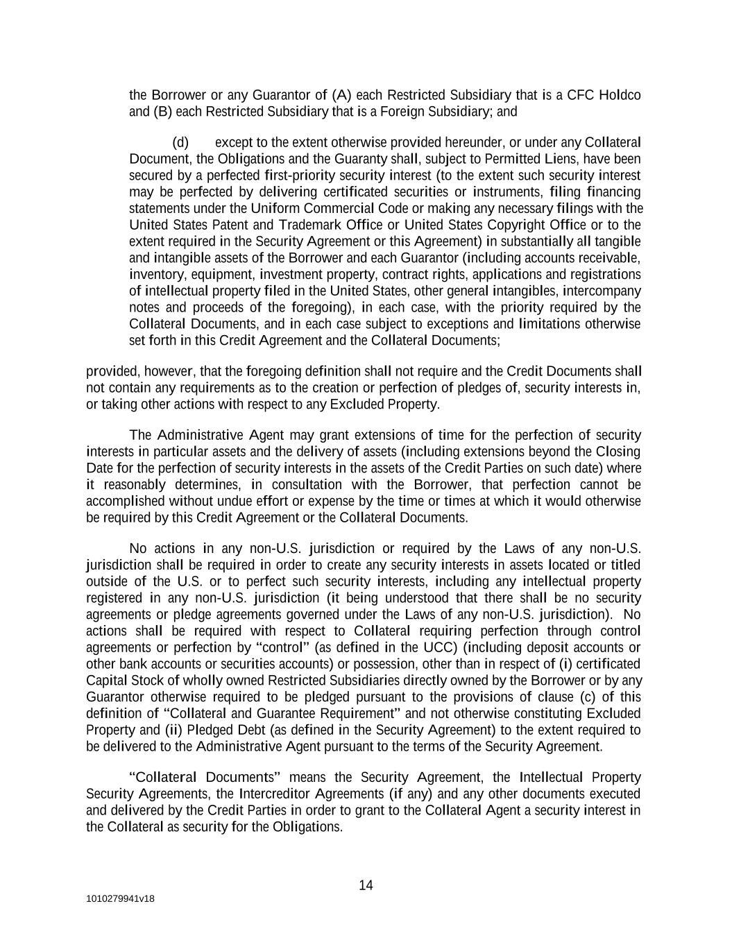 the Borrower or any Guarantor of (A) each Restricted Subsidiary that is a CFC Holdco and (B) each Restricted Subsidiary that is a Foreign Subsidiary; and (d) except to the extent otherwise provided hereunder, or under any Collateral Document, the Obligations and the Guaranty shall, subject to Permitted Liens, have been secured by a perfected first-priority security interest (to the extent such security interest may be perfected by delivering certificated securities or instruments, filing financing statements under the Uniform Commercial Code or making any necessary filings with the United States Patent and Trademark Office or United States Copyright Office or to the extent required in the Security Agreement or this Agreement) in substantially all tangible and intangible assets of the Borrower and each Guarantor (including accounts receivable, inventory, equipment, investment property, contract rights, applications and registrations of intellectual property filed in the United States, other general intangibles, intercompany notes and proceeds of the foregoing), in each case, with the priority required by the Collateral Documents, and in each case subject to exceptions and limitations otherwise set forth in this Credit Agreement and the Collateral Documents; provided, however, that the foregoing definition shall not require and the Credit Documents shall not contain any requirements as to the creation or perfection of pledges of, security interests in, or taking other actions with respect to any Excluded Property. The Administrative Agent may grant extensions of time for the perfection of security interests in particular assets and the delivery of assets (including extensions beyond the Closing Date for the perfection of security interests in the assets of the Credit Parties on such date) where it reasonably determines, in consultation with the Borrower, that perfection cannot be accomplished without undue effort or expense by the time or times at which it would otherwise be required by this Credit Agreement or the Collateral Documents. No actions in any non-U.S. jurisdiction or required by the Laws of any non-U.S. jurisdiction shall be required in order to create any security interests in assets located or titled outside of the U.S. or to perfect such security interests, including any intellectual property registered in any non-U.S. jurisdiction (it being understood that there shall be no security agreements or pledge agreements governed under the Laws of any non-U.S. jurisdiction). No actions shall be required with respect to Collateral requiring perfection through control agreements or perfection by “control” (as defined in the UCC) (including deposit accounts or other bank accounts or securities accounts) or possession, other than in respect of (i) certificated Capital Stock of wholly owned Restricted Subsidiaries directly owned by the Borrower or by any Guarantor otherwise required to be pledged pursuant to the provisions of clause (c) of this definition of “Collateral and Guarantee Requirement” and not otherwise constituting Excluded Property and (ii) Pledged Debt (as defined in the Security Agreement) to the extent required to be delivered to the Administrative Agent pursuant to the terms of the Security Agreement. “Collateral Documents” means the Security Agreement, the Intellectual Property Security Agreements, the Intercreditor Agreements (if any) and any other documents executed and delivered by the Credit Parties in order to grant to the Collateral Agent a security interest in the Collateral as security for the Obligations. 14 1010279941v18