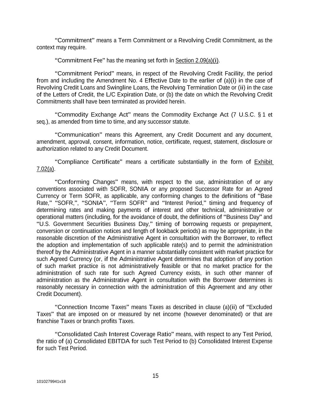 “Commitment” means a Term Commitment or a Revolving Credit Commitment, as the context may require. “Commitment Fee” has the meaning set forth in Section 2.09(a)(i). “Commitment Period” means, in respect of the Revolving Credit Facility, the period from and including the Amendment No. 4 Effective Date to the earlier of (a)(i) in the case of Revolving Credit Loans and Swingline Loans, the Revolving Termination Date or (ii) in the case of the Letters of Credit, the L/C Expiration Date, or (b) the date on which the Revolving Credit Commitments shall have been terminated as provided herein. “Commodity Exchange Act” means the Commodity Exchange Act (7 U.S.C. § 1 et seq.), as amended from time to time, and any successor statute. “Communication” means this Agreement, any Credit Document and any document, amendment, approval, consent, information, notice, certificate, request, statement, disclosure or authorization related to any Credit Document. “Compliance Certificate” means a certificate substantially in the form of Exhibit 7.02(a). “Conforming Changes” means, with respect to the use, administration of or any conventions associated with SOFR, SONIA or any proposed Successor Rate for an Agreed Currency or Term SOFR, as applicable, any conforming changes to the definitions of “Base Rate,” “SOFR,”, “SONIA”, “Term SOFR” and “Interest Period,” timing and frequency of determining rates and making payments of interest and other technical, administrative or operational matters (including, for the avoidance of doubt, the definitions of “Business Day” and “U.S. Government Securities Business Day,” timing of borrowing requests or prepayment, conversion or continuation notices and length of lookback periods) as may be appropriate, in the reasonable discretion of the Administrative Agent in consultation with the Borrower, to reflect the adoption and implementation of such applicable rate(s) and to permit the administration thereof by the Administrative Agent in a manner substantially consistent with market practice for such Agreed Currency (or, if the Administrative Agent determines that adoption of any portion of such market practice is not administratively feasible or that no market practice for the administration of such rate for such Agreed Currency exists, in such other manner of administration as the Administrative Agent in consultation with the Borrower determines is reasonably necessary in connection with the administration of this Agreement and any other Credit Document). “Connection Income Taxes” means Taxes as described in clause (a)(ii) of “Excluded Taxes” that are imposed on or measured by net income (however denominated) or that are franchise Taxes or branch profits Taxes. “Consolidated Cash Interest Coverage Ratio” means, with respect to any Test Period, the ratio of (a) Consolidated EBITDA for such Test Period to (b) Consolidated Interest Expense for such Test Period. 15 1010279941v18
