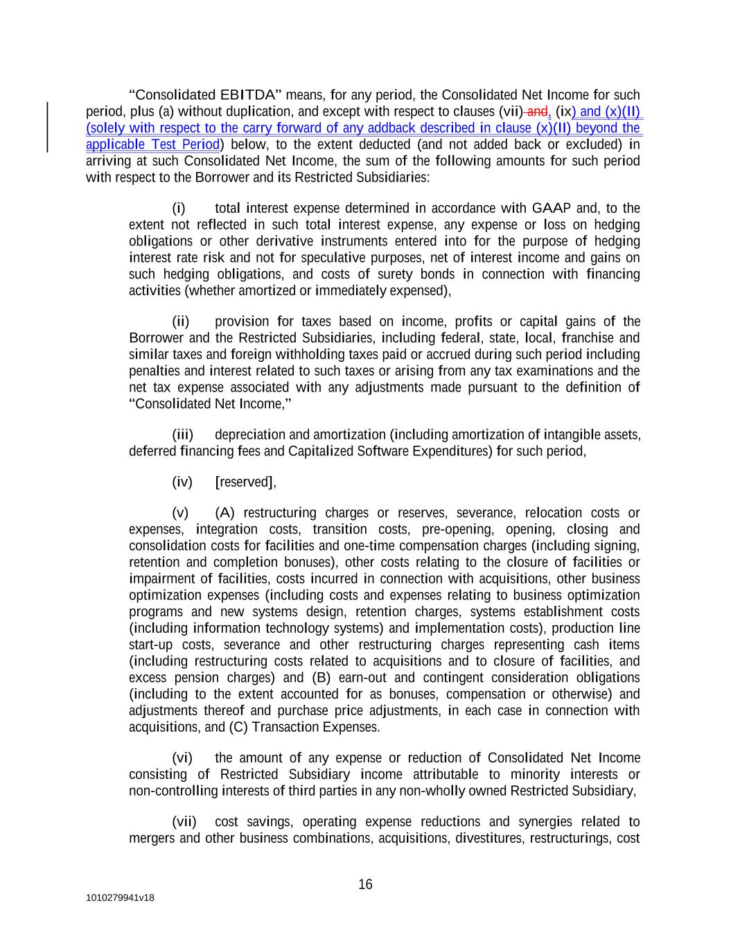 “Consolidated EBITDA” means, for any period, the Consolidated Net Income for such period, plus (a) without duplication, and except with respect to clauses (vii) and, (ix) and (x)(II) (solely with respect to the carry forward of any addback described in clause (x)(II) beyond the applicable Test Period) below, to the extent deducted (and not added back or excluded) in arriving at such Consolidated Net Income, the sum of the following amounts for such period with respect to the Borrower and its Restricted Subsidiaries: (i) total interest expense determined in accordance with GAAP and, to the extent not reflected in such total interest expense, any expense or loss on hedging obligations or other derivative instruments entered into for the purpose of hedging interest rate risk and not for speculative purposes, net of interest income and gains on such hedging obligations, and costs of surety bonds in connection with financing activities (whether amortized or immediately expensed), (ii) provision for taxes based on income, profits or capital gains of the Borrower and the Restricted Subsidiaries, including federal, state, local, franchise and similar taxes and foreign withholding taxes paid or accrued during such period including penalties and interest related to such taxes or arising from any tax examinations and the net tax expense associated with any adjustments made pursuant to the definition of “Consolidated Net Income,” (iii) depreciation and amortization (including amortization of intangible assets, deferred financing fees and Capitalized Software Expenditures) for such period, (iv) [reserved], (v) (A) restructuring charges or reserves, severance, relocation costs or expenses, integration costs, transition costs, pre-opening, opening, closing and consolidation costs for facilities and one-time compensation charges (including signing, retention and completion bonuses), other costs relating to the closure of facilities or impairment of facilities, costs incurred in connection with acquisitions, other business optimization expenses (including costs and expenses relating to business optimization programs and new systems design, retention charges, systems establishment costs (including information technology systems) and implementation costs), production line start-up costs, severance and other restructuring charges representing cash items (including restructuring costs related to acquisitions and to closure of facilities, and excess pension charges) and (B) earn-out and contingent consideration obligations (including to the extent accounted for as bonuses, compensation or otherwise) and adjustments thereof and purchase price adjustments, in each case in connection with acquisitions, and (C) Transaction Expenses. (vi) the amount of any expense or reduction of Consolidated Net Income consisting of Restricted Subsidiary income attributable to minority interests or non-controlling interests of third parties in any non-wholly owned Restricted Subsidiary, (vii) cost savings, operating expense reductions and synergies related to mergers and other business combinations, acquisitions, divestitures, restructurings, cost 16 1010279941v18