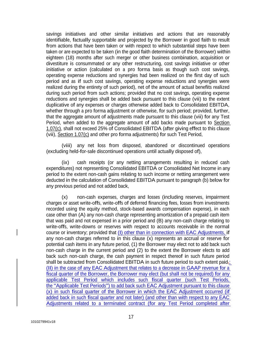 savings initiatives and other similar initiatives and actions that are reasonably identifiable, factually supportable and projected by the Borrower in good faith to result from actions that have been taken or with respect to which substantial steps have been taken or are expected to be taken (in the good faith determination of the Borrower) within eighteen (18) months after such merger or other business combination, acquisition or divestiture is consummated or any other restructuring, cost savings initiative or other initiative or action (calculated on a pro forma basis as though such cost savings, operating expense reductions and synergies had been realized on the first day of such period and as if such cost savings, operating expense reductions and synergies were realized during the entirety of such period), net of the amount of actual benefits realized during such period from such actions; provided that no cost savings, operating expense reductions and synergies shall be added back pursuant to this clause (vii) to the extent duplicative of any expenses or charges otherwise added back to Consolidated EBITDA, whether through a pro forma adjustment or otherwise, for such period; provided, further, that the aggregate amount of adjustments made pursuant to this clause (vii) for any Test Period, when added to the aggregate amount of add backs made pursuant to Section 1.07(c), shall not exceed 25% of Consolidated EBITDA (after giving effect to this clause (vii), Section 1.07(c) and other pro forma adjustments) for such Test Period, (viii) any net loss from disposed, abandoned or discontinued operations (excluding held-for-sale discontinued operations until actually disposed of), (ix) cash receipts (or any netting arrangements resulting in reduced cash expenditures) not representing Consolidated EBITDA or Consolidated Net Income in any period to the extent non-cash gains relating to such income or netting arrangement were deducted in the calculation of Consolidated EBITDA pursuant to paragraph (b) below for any previous period and not added back, (x) non-cash expenses, charges and losses (including reserves, impairment charges or asset write-offs, write-offs of deferred financing fees, losses from investments recorded using the equity method, stock-based awards compensation expense), in each case other than (A) any non-cash charge representing amortization of a prepaid cash item that was paid and not expensed in a prior period and (B) any non-cash charge relating to write-offs, write-downs or reserves with respect to accounts receivable in the normal course or inventory; provided that (I) other than in connection with EAC Adjustments, if any non-cash charges referred to in this clause (x) represents an accrual or reserve for potential cash items in any future period, (1) the Borrower may elect not to add back such non-cash charge in the current period and (2) to the extent the Borrower elects to add back such non-cash charge, the cash payment in respect thereof in such future period shall be subtracted from Consolidated EBITDA in such future period to such extent paid,; (II) in the case of any EAC Adjustment that relates to a decrease in GAAP revenue for a fiscal quarter of the Borrower, the Borrower may elect (but shall not be required) for any applicable Test Period which includes such fiscal quarter (such Test Periods, the “Applicable Test Periods”) to add back such EAC Adjustment pursuant to this clause (x) in such fiscal quarter of the Borrower in which the EAC Adjustment occurred (if added back in such fiscal quarter and not later) (and other than with respect to any EAC Adjustments related to a terminated contract (for any Test Period completed after 17 1010279941v18