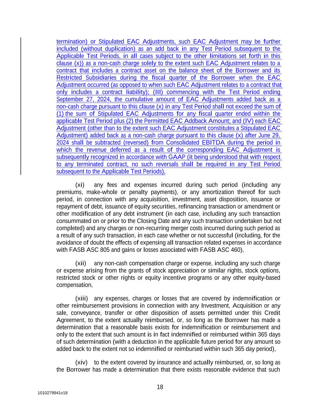 termination) or Stipulated EAC Adjustments, such EAC Adjustment may be further included (without duplication) as an add back in any Test Period subsequent to the Applicable Test Periods, in all cases subject to the other limitations set forth in this clause (x)) as a non-cash charge solely to the extent such EAC Adjustment relates to a contract that includes a contract asset on the balance sheet of the Borrower and its Restricted Subsidiaries during the fiscal quarter of the Borrower when the EAC Adjustment occurred (as opposed to when such EAC Adjustment relates to a contract that only includes a contract liability); (III) commencing with the Test Period ending September 27, 2024, the cumulative amount of EAC Adjustments added back as a non-cash charge pursuant to this clause (x) in any Test Period shall not exceed the sum of (1) the sum of Stipulated EAC Adjustments for any fiscal quarter ended within the applicable Test Period plus (2) the Permitted EAC Addback Amount; and (IV) each EAC Adjustment (other than to the extent such EAC Adjustment constitutes a Stipulated EAC Adjustment) added back as a non-cash charge pursuant to this clause (x) after June 29, 2024 shall be subtracted (reversed) from Consolidated EBITDA during the period in which the revenue deferred as a result of the corresponding EAC Adjustment is subsequently recognized in accordance with GAAP (it being understood that with respect to any terminated contract, no such reversals shall be required in any Test Period subsequent to the Applicable Test Periods), (xi) any fees and expenses incurred during such period (including any premiums, make-whole or penalty payments), or any amortization thereof for such period, in connection with any acquisition, investment, asset disposition, issuance or repayment of debt, issuance of equity securities, refinancing transaction or amendment or other modification of any debt instrument (in each case, including any such transaction consummated on or prior to the Closing Date and any such transaction undertaken but not completed) and any charges or non-recurring merger costs incurred during such period as a result of any such transaction, in each case whether or not successful (including, for the avoidance of doubt the effects of expensing all transaction related expenses in accordance with FASB ASC 805 and gains or losses associated with FASB ASC 460), (xii) any non-cash compensation charge or expense, including any such charge or expense arising from the grants of stock appreciation or similar rights, stock options, restricted stock or other rights or equity incentive programs or any other equity-based compensation, (xiii) any expenses, charges or losses that are covered by indemnification or other reimbursement provisions in connection with any Investment, Acquisition or any sale, conveyance, transfer or other disposition of assets permitted under this Credit Agreement, to the extent actually reimbursed, or, so long as the Borrower has made a determination that a reasonable basis exists for indemnification or reimbursement and only to the extent that such amount is in fact indemnified or reimbursed within 365 days of such determination (with a deduction in the applicable future period for any amount so added back to the extent not so indemnified or reimbursed within such 365 day period), (xiv) to the extent covered by insurance and actually reimbursed, or, so long as the Borrower has made a determination that there exists reasonable evidence that such 18 1010279941v18
