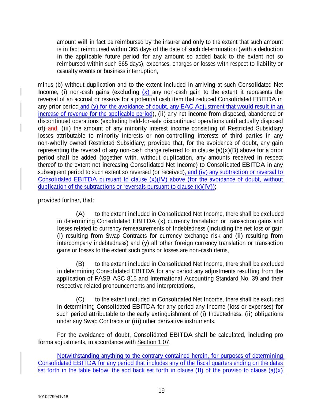 amount will in fact be reimbursed by the insurer and only to the extent that such amount is in fact reimbursed within 365 days of the date of such determination (with a deduction in the applicable future period for any amount so added back to the extent not so reimbursed within such 365 days), expenses, charges or losses with respect to liability or casualty events or business interruption, minus (b) without duplication and to the extent included in arriving at such Consolidated Net Income, (i) non-cash gains (excluding (x) any non-cash gain to the extent it represents the reversal of an accrual or reserve for a potential cash item that reduced Consolidated EBITDA in any prior period and (y) for the avoidance of doubt, any EAC Adjustment that would result in an increase of revenue for the applicable period), (ii) any net income from disposed, abandoned or discontinued operations (excluding held-for-sale discontinued operations until actually disposed of) and, (iii) the amount of any minority interest income consisting of Restricted Subsidiary losses attributable to minority interests or non-controlling interests of third parties in any non-wholly owned Restricted Subsidiary; provided that, for the avoidance of doubt, any gain representing the reversal of any non-cash charge referred to in clause (a)(x)(B) above for a prior period shall be added (together with, without duplication, any amounts received in respect thereof to the extent not increasing Consolidated Net Income) to Consolidated EBITDA in any subsequent period to such extent so reversed (or received), and (iv) any subtraction or reversal to Consolidated EBITDA pursuant to clause (x)(IV) above (for the avoidance of doubt, without duplication of the subtractions or reversals pursuant to clause (x)(IV)); provided further, that: (A) to the extent included in Consolidated Net Income, there shall be excluded in determining Consolidated EBITDA (x) currency translation or transaction gains and losses related to currency remeasurements of Indebtedness (including the net loss or gain (i) resulting from Swap Contracts for currency exchange risk and (ii) resulting from intercompany indebtedness) and (y) all other foreign currency translation or transaction gains or losses to the extent such gains or losses are non-cash items, (B) to the extent included in Consolidated Net Income, there shall be excluded in determining Consolidated EBITDA for any period any adjustments resulting from the application of FASB ASC 815 and International Accounting Standard No. 39 and their respective related pronouncements and interpretations, (C) to the extent included in Consolidated Net Income, there shall be excluded in determining Consolidated EBITDA for any period any income (loss or expenses) for such period attributable to the early extinguishment of (i) Indebtedness, (ii) obligations under any Swap Contracts or (iii) other derivative instruments. For the avoidance of doubt, Consolidated EBITDA shall be calculated, including pro forma adjustments, in accordance with Section 1.07. Notwithstanding anything to the contrary contained herein, for purposes of determining Consolidated EBITDA for any period that includes any of the fiscal quarters ending on the dates set forth in the table below, the add back set forth in clause (II) of the proviso to clause (a)(x) 19 1010279941v18
