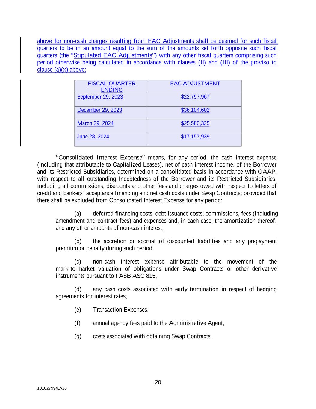20 1010279941v18 above for non-cash charges resulting from EAC Adjustments shall be deemed for such fiscal quarters to be in an amount equal to the sum of the amounts set forth opposite such fiscal quarters (the “Stipulated EAC Adjustments”) with any other fiscal quarters comprising such period otherwise being calculated in accordance with clauses (II) and (III) of the proviso to clause (a)(x) above: “Consolidated Interest Expense” means, for any period, the cash interest expense (including that attributable to Capitalized Leases), net of cash interest income, of the Borrower and its Restricted Subsidiaries, determined on a consolidated basis in accordance with GAAP, with respect to all outstanding Indebtedness of the Borrower and its Restricted Subsidiaries, including all commissions, discounts and other fees and charges owed with respect to letters of credit and bankers’ acceptance financing and net cash costs under Swap Contracts; provided that there shall be excluded from Consolidated Interest Expense for any period: (a) deferred financing costs, debt issuance costs, commissions, fees (including amendment and contract fees) and expenses and, in each case, the amortization thereof, and any other amounts of non-cash interest, (b) the accretion or accrual of discounted liabilities and any prepayment premium or penalty during such period, (c) non-cash interest expense attributable to the movement of the mark-to-market valuation of obligations under Swap Contracts or other derivative instruments pursuant to FASB ASC 815, (d) any cash costs associated with early termination in respect of hedging agreements for interest rates, (e) Transaction Expenses, (f) annual agency fees paid to the Administrative Agent, (g) costs associated with obtaining Swap Contracts, March 29, 2024 $22,797,967 $25,580,325 FISCAL QUARTER ENDING June 28, 2024 $17,157,939 December 29, 2023 $36,104,602 September 29, 2023 EAC ADJUSTMENT