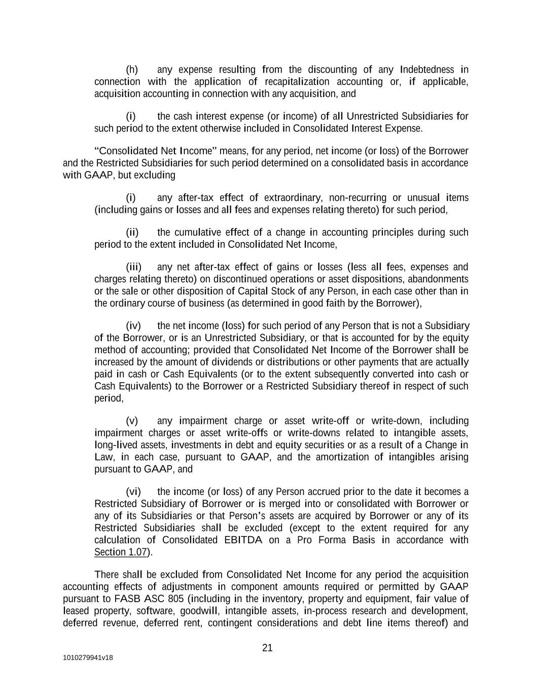 (h) any expense resulting from the discounting of any Indebtedness in connection with the application of recapitalization accounting or, if applicable, acquisition accounting in connection with any acquisition, and (i) the cash interest expense (or income) of all Unrestricted Subsidiaries for such period to the extent otherwise included in Consolidated Interest Expense. “Consolidated Net Income” means, for any period, net income (or loss) of the Borrower and the Restricted Subsidiaries for such period determined on a consolidated basis in accordance with GAAP, but excluding (i) any after-tax effect of extraordinary, non-recurring or unusual items (including gains or losses and all fees and expenses relating thereto) for such period, (ii) the cumulative effect of a change in accounting principles during such period to the extent included in Consolidated Net Income, (iii) any net after-tax effect of gains or losses (less all fees, expenses and charges relating thereto) on discontinued operations or asset dispositions, abandonments or the sale or other disposition of Capital Stock of any Person, in each case other than in the ordinary course of business (as determined in good faith by the Borrower), (iv) the net income (loss) for such period of any Person that is not a Subsidiary of the Borrower, or is an Unrestricted Subsidiary, or that is accounted for by the equity method of accounting; provided that Consolidated Net Income of the Borrower shall be increased by the amount of dividends or distributions or other payments that are actually paid in cash or Cash Equivalents (or to the extent subsequently converted into cash or Cash Equivalents) to the Borrower or a Restricted Subsidiary thereof in respect of such period, (v) any impairment charge or asset write-off or write-down, including impairment charges or asset write-offs or write-downs related to intangible assets, long-lived assets, investments in debt and equity securities or as a result of a Change in Law, in each case, pursuant to GAAP, and the amortization of intangibles arising pursuant to GAAP, and (vi) the income (or loss) of any Person accrued prior to the date it becomes a Restricted Subsidiary of Borrower or is merged into or consolidated with Borrower or any of its Subsidiaries or that Person’s assets are acquired by Borrower or any of its Restricted Subsidiaries shall be excluded (except to the extent required for any calculation of Consolidated EBITDA on a Pro Forma Basis in accordance with Section 1.07). There shall be excluded from Consolidated Net Income for any period the acquisition accounting effects of adjustments in component amounts required or permitted by GAAP pursuant to FASB ASC 805 (including in the inventory, property and equipment, fair value of leased property, software, goodwill, intangible assets, in-process research and development, deferred revenue, deferred rent, contingent considerations and debt line items thereof) and 21 1010279941v18