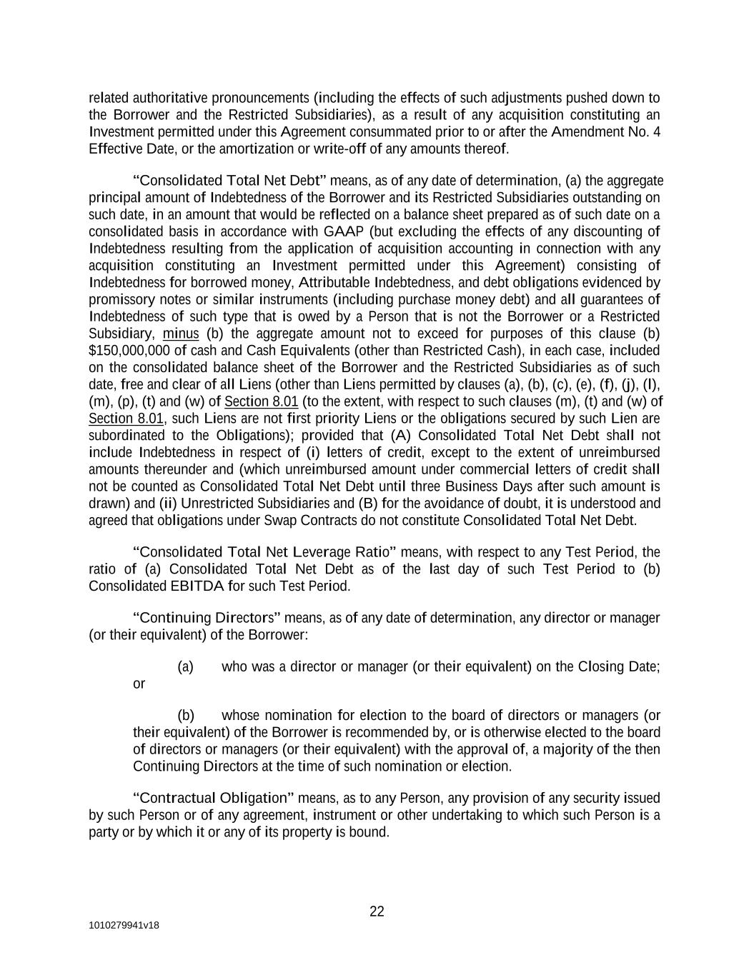 related authoritative pronouncements (including the effects of such adjustments pushed down to the Borrower and the Restricted Subsidiaries), as a result of any acquisition constituting an Investment permitted under this Agreement consummated prior to or after the Amendment No. 4 Effective Date, or the amortization or write-off of any amounts thereof. “Consolidated Total Net Debt” means, as of any date of determination, (a) the aggregate principal amount of Indebtedness of the Borrower and its Restricted Subsidiaries outstanding on such date, in an amount that would be reflected on a balance sheet prepared as of such date on a consolidated basis in accordance with GAAP (but excluding the effects of any discounting of Indebtedness resulting from the application of acquisition accounting in connection with any acquisition constituting an Investment permitted under this Agreement) consisting of Indebtedness for borrowed money, Attributable Indebtedness, and debt obligations evidenced by promissory notes or similar instruments (including purchase money debt) and all guarantees of Indebtedness of such type that is owed by a Person that is not the Borrower or a Restricted Subsidiary, minus (b) the aggregate amount not to exceed for purposes of this clause (b) $150,000,000 of cash and Cash Equivalents (other than Restricted Cash), in each case, included on the consolidated balance sheet of the Borrower and the Restricted Subsidiaries as of such date, free and clear of all Liens (other than Liens permitted by clauses (a), (b), (c), (e), (f), (j), (l), (m), (p), (t) and (w) of Section 8.01 (to the extent, with respect to such clauses (m), (t) and (w) of Section 8.01, such Liens are not first priority Liens or the obligations secured by such Lien are subordinated to the Obligations); provided that (A) Consolidated Total Net Debt shall not include Indebtedness in respect of (i) letters of credit, except to the extent of unreimbursed amounts thereunder and (which unreimbursed amount under commercial letters of credit shall not be counted as Consolidated Total Net Debt until three Business Days after such amount is drawn) and (ii) Unrestricted Subsidiaries and (B) for the avoidance of doubt, it is understood and agreed that obligations under Swap Contracts do not constitute Consolidated Total Net Debt. “Consolidated Total Net Leverage Ratio” means, with respect to any Test Period, the ratio of (a) Consolidated Total Net Debt as of the last day of such Test Period to (b) Consolidated EBITDA for such Test Period. “Continuing Directors” means, as of any date of determination, any director or manager (or their equivalent) of the Borrower: (a) who was a director or manager (or their equivalent) on the Closing Date; or (b) whose nomination for election to the board of directors or managers (or their equivalent) of the Borrower is recommended by, or is otherwise elected to the board of directors or managers (or their equivalent) with the approval of, a majority of the then Continuing Directors at the time of such nomination or election. “Contractual Obligation” means, as to any Person, any provision of any security issued by such Person or of any agreement, instrument or other undertaking to which such Person is a party or by which it or any of its property is bound. 22 1010279941v18