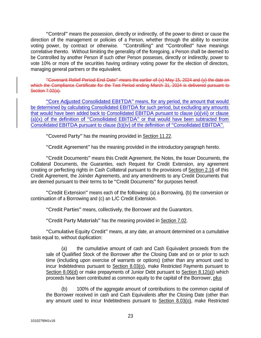 “Control” means the possession, directly or indirectly, of the power to direct or cause the direction of the management or policies of a Person, whether through the ability to exercise voting power, by contract or otherwise. “Controlling” and “Controlled” have meanings correlative thereto. Without limiting the generality of the foregoing, a Person shall be deemed to be Controlled by another Person if such other Person possesses, directly or indirectly, power to vote 10% or more of the securities having ordinary voting power for the election of directors, managing general partners or the equivalent. “Covenant Relief Period End Date” means the earlier of (x) May 15, 2024 and (y) the date on which the Compliance Certificate for the Test Period ending March 31, 2024 is delivered pursuant to Section 7.02(a). “Core Adjusted Consolidated EBITDA” means, for any period, the amount that would be determined by calculating Consolidated EBITDA for such period, but excluding any amounts that would have been added back to Consolidated EBITDA pursuant to clause (a)(vii) or clause (a)(x) of the definition of “Consolidated EBITDA” or that would have been subtracted from Consolidated EBITDA pursuant to clause (b)(iv) of the definition of “Consolidated EBITDA”. “Covered Party” has the meaning provided in Section 11.22. “Credit Agreement” has the meaning provided in the introductory paragraph hereto. “Credit Documents” means this Credit Agreement, the Notes, the Issuer Documents, the Collateral Documents, the Guaranties, each Request for Credit Extension, any agreement creating or perfecting rights in Cash Collateral pursuant to the provisions of Section 2.16 of this Credit Agreement, the Joinder Agreements, and any amendments to any Credit Documents that are deemed pursuant to their terms to be “Credit Documents” for purposes hereof. “Credit Extension” means each of the following: (a) a Borrowing, (b) the conversion or continuation of a Borrowing and (c) an L/C Credit Extension. “Credit Parties” means, collectively, the Borrower and the Guarantors. “Credit Party Materials” has the meaning provided in Section 7.02. “Cumulative Equity Credit” means, at any date, an amount determined on a cumulative basis equal to, without duplication: (a) the cumulative amount of cash and Cash Equivalent proceeds from the sale of Qualified Stock of the Borrower after the Closing Date and on or prior to such time (including upon exercise of warrants or options) (other than any amount used to incur Indebtedness pursuant to Section 8.03(o), make Restricted Payments pursuant to Section 8.06(d) or make prepayments of Junior Debt pursuant to Section 8.12(a)) which proceeds have been contributed as common equity to the capital of the Borrower, plus (b) 100% of the aggregate amount of contributions to the common capital of the Borrower received in cash and Cash Equivalents after the Closing Date (other than any amount used to incur Indebtedness pursuant to Section 8.03(o), make Restricted 23 1010279941v18