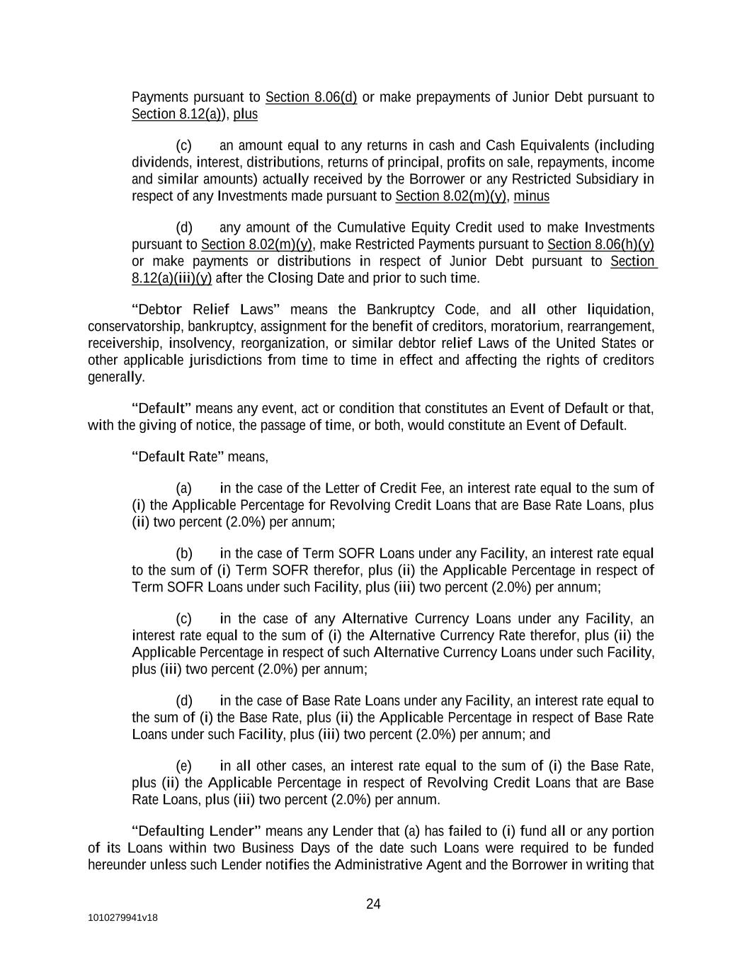 Payments pursuant to Section 8.06(d) or make prepayments of Junior Debt pursuant to Section 8.12(a)), plus (c) an amount equal to any returns in cash and Cash Equivalents (including dividends, interest, distributions, returns of principal, profits on sale, repayments, income and similar amounts) actually received by the Borrower or any Restricted Subsidiary in respect of any Investments made pursuant to Section 8.02(m)(y), minus (d) any amount of the Cumulative Equity Credit used to make Investments pursuant to Section 8.02(m)(y), make Restricted Payments pursuant to Section 8.06(h)(y) or make payments or distributions in respect of Junior Debt pursuant to Section 8.12(a)(iii)(y) after the Closing Date and prior to such time. “Debtor Relief Laws” means the Bankruptcy Code, and all other liquidation, conservatorship, bankruptcy, assignment for the benefit of creditors, moratorium, rearrangement, receivership, insolvency, reorganization, or similar debtor relief Laws of the United States or other applicable jurisdictions from time to time in effect and affecting the rights of creditors generally. “Default” means any event, act or condition that constitutes an Event of Default or that, with the giving of notice, the passage of time, or both, would constitute an Event of Default. “Default Rate” means, (a) in the case of the Letter of Credit Fee, an interest rate equal to the sum of (i) the Applicable Percentage for Revolving Credit Loans that are Base Rate Loans, plus (ii) two percent (2.0%) per annum; (b) in the case of Term SOFR Loans under any Facility, an interest rate equal to the sum of (i) Term SOFR therefor, plus (ii) the Applicable Percentage in respect of Term SOFR Loans under such Facility, plus (iii) two percent (2.0%) per annum; (c) in the case of any Alternative Currency Loans under any Facility, an interest rate equal to the sum of (i) the Alternative Currency Rate therefor, plus (ii) the Applicable Percentage in respect of such Alternative Currency Loans under such Facility, plus (iii) two percent (2.0%) per annum; (d) in the case of Base Rate Loans under any Facility, an interest rate equal to the sum of (i) the Base Rate, plus (ii) the Applicable Percentage in respect of Base Rate Loans under such Facility, plus (iii) two percent (2.0%) per annum; and (e) in all other cases, an interest rate equal to the sum of (i) the Base Rate, plus (ii) the Applicable Percentage in respect of Revolving Credit Loans that are Base Rate Loans, plus (iii) two percent (2.0%) per annum. “Defaulting Lender” means any Lender that (a) has failed to (i) fund all or any portion of its Loans within two Business Days of the date such Loans were required to be funded hereunder unless such Lender notifies the Administrative Agent and the Borrower in writing that 24 1010279941v18