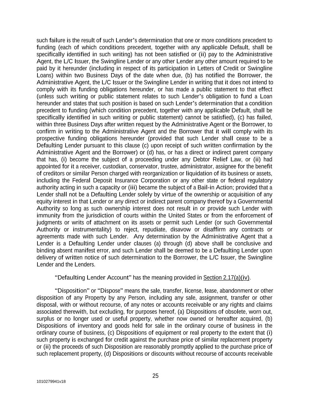 such failure is the result of such Lender’s determination that one or more conditions precedent to funding (each of which conditions precedent, together with any applicable Default, shall be specifically identified in such writing) has not been satisfied or (ii) pay to the Administrative Agent, the L/C Issuer, the Swingline Lender or any other Lender any other amount required to be paid by it hereunder (including in respect of its participation in Letters of Credit or Swingline Loans) within two Business Days of the date when due, (b) has notified the Borrower, the Administrative Agent, the L/C Issuer or the Swingline Lender in writing that it does not intend to comply with its funding obligations hereunder, or has made a public statement to that effect (unless such writing or public statement relates to such Lender’s obligation to fund a Loan hereunder and states that such position is based on such Lender’s determination that a condition precedent to funding (which condition precedent, together with any applicable Default, shall be specifically identified in such writing or public statement) cannot be satisfied), (c) has failed, within three Business Days after written request by the Administrative Agent or the Borrower, to confirm in writing to the Administrative Agent and the Borrower that it will comply with its prospective funding obligations hereunder (provided that such Lender shall cease to be a Defaulting Lender pursuant to this clause (c) upon receipt of such written confirmation by the Administrative Agent and the Borrower) or (d) has, or has a direct or indirect parent company that has, (i) become the subject of a proceeding under any Debtor Relief Law, or (ii) had appointed for it a receiver, custodian, conservator, trustee, administrator, assignee for the benefit of creditors or similar Person charged with reorganization or liquidation of its business or assets, including the Federal Deposit Insurance Corporation or any other state or federal regulatory authority acting in such a capacity or (iii) became the subject of a Bail-in Action; provided that a Lender shall not be a Defaulting Lender solely by virtue of the ownership or acquisition of any equity interest in that Lender or any direct or indirect parent company thereof by a Governmental Authority so long as such ownership interest does not result in or provide such Lender with immunity from the jurisdiction of courts within the United States or from the enforcement of judgments or writs of attachment on its assets or permit such Lender (or such Governmental Authority or instrumentality) to reject, repudiate, disavow or disaffirm any contracts or agreements made with such Lender. Any determination by the Administrative Agent that a Lender is a Defaulting Lender under clauses (a) through (d) above shall be conclusive and binding absent manifest error, and such Lender shall be deemed to be a Defaulting Lender upon delivery of written notice of such determination to the Borrower, the L/C Issuer, the Swingline Lender and the Lenders. “Defaulting Lender Account” has the meaning provided in Section 2.17(a)(iv). “Disposition” or “Dispose” means the sale, transfer, license, lease, abandonment or other disposition of any Property by any Person, including any sale, assignment, transfer or other disposal, with or without recourse, of any notes or accounts receivable or any rights and claims associated therewith, but excluding, for purposes hereof, (a) Dispositions of obsolete, worn out, surplus or no longer used or useful property, whether now owned or hereafter acquired, (b) Dispositions of inventory and goods held for sale in the ordinary course of business in the ordinary course of business, (c) Dispositions of equipment or real property to the extent that (i) such property is exchanged for credit against the purchase price of similar replacement property or (ii) the proceeds of such Disposition are reasonably promptly applied to the purchase price of such replacement property, (d) Dispositions or discounts without recourse of accounts receivable 25 1010279941v18