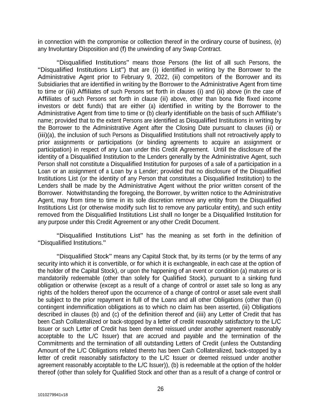 in connection with the compromise or collection thereof in the ordinary course of business, (e) any Involuntary Disposition and (f) the unwinding of any Swap Contract. “Disqualified Institutions” means those Persons (the list of all such Persons, the “Disqualified Institutions List”) that are (i) identified in writing by the Borrower to the Administrative Agent prior to February 9, 2022, (ii) competitors of the Borrower and its Subsidiaries that are identified in writing by the Borrower to the Administrative Agent from time to time or (iii) Affiliates of such Persons set forth in clauses (i) and (ii) above (in the case of Affiliates of such Persons set forth in clause (ii) above, other than bona fide fixed income investors or debt funds) that are either (a) identified in writing by the Borrower to the Administrative Agent from time to time or (b) clearly identifiable on the basis of such Affiliate’s name; provided that to the extent Persons are identified as Disqualified Institutions in writing by the Borrower to the Administrative Agent after the Closing Date pursuant to clauses (ii) or (iii)(a), the inclusion of such Persons as Disqualified Institutions shall not retroactively apply to prior assignments or participations (or binding agreements to acquire an assignment or participation) in respect of any Loan under this Credit Agreement. Until the disclosure of the identity of a Disqualified Institution to the Lenders generally by the Administrative Agent, such Person shall not constitute a Disqualified Institution for purposes of a sale of a participation in a Loan or an assignment of a Loan by a Lender; provided that no disclosure of the Disqualified Institutions List (or the identity of any Person that constitutes a Disqualified Institution) to the Lenders shall be made by the Administrative Agent without the prior written consent of the Borrower. Notwithstanding the foregoing, the Borrower, by written notice to the Administrative Agent, may from time to time in its sole discretion remove any entity from the Disqualified Institutions List (or otherwise modify such list to remove any particular entity), and such entity removed from the Disqualified Institutions List shall no longer be a Disqualified Institution for any purpose under this Credit Agreement or any other Credit Document. “Disqualified Institutions List” has the meaning as set forth in the definition of “Disqualified Institutions.” “Disqualified Stock” means any Capital Stock that, by its terms (or by the terms of any security into which it is convertible, or for which it is exchangeable, in each case at the option of the holder of the Capital Stock), or upon the happening of an event or condition (a) matures or is mandatorily redeemable (other than solely for Qualified Stock), pursuant to a sinking fund obligation or otherwise (except as a result of a change of control or asset sale so long as any rights of the holders thereof upon the occurrence of a change of control or asset sale event shall be subject to the prior repayment in full of the Loans and all other Obligations (other than (i) contingent indemnification obligations as to which no claim has been asserted, (ii) Obligations described in clauses (b) and (c) of the definition thereof and (iii) any Letter of Credit that has been Cash Collateralized or back-stopped by a letter of credit reasonably satisfactory to the L/C Issuer or such Letter of Credit has been deemed reissued under another agreement reasonably acceptable to the L/C Issuer) that are accrued and payable and the termination of the Commitments and the termination of all outstanding Letters of Credit (unless the Outstanding Amount of the L/C Obligations related thereto has been Cash Collateralized, back-stopped by a letter of credit reasonably satisfactory to the L/C Issuer or deemed reissued under another agreement reasonably acceptable to the L/C Issuer)), (b) is redeemable at the option of the holder thereof (other than solely for Qualified Stock and other than as a result of a change of control or 26 1010279941v18