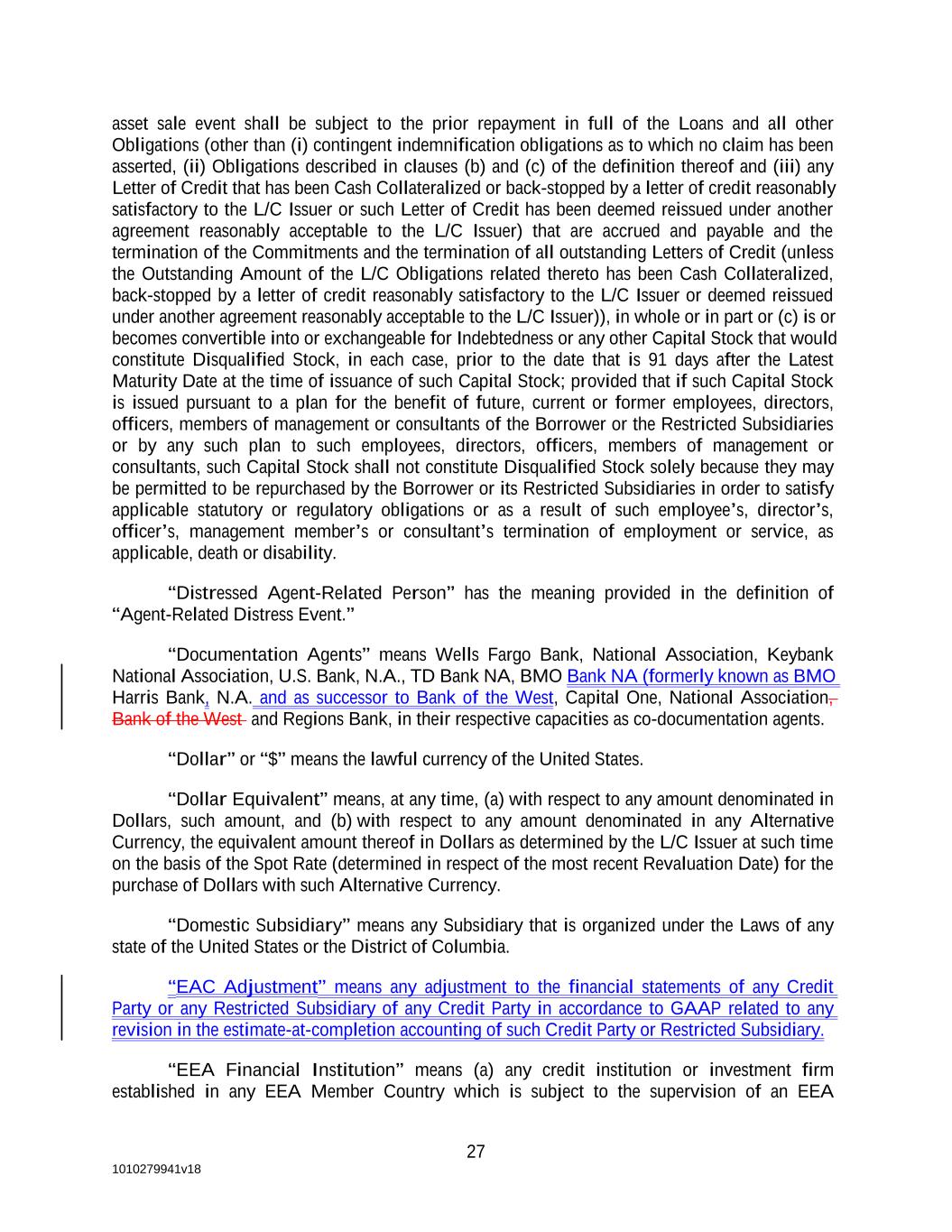 asset sale event shall be subject to the prior repayment in full of the Loans and all other Obligations (other than (i) contingent indemnification obligations as to which no claim has been asserted, (ii) Obligations described in clauses (b) and (c) of the definition thereof and (iii) any Letter of Credit that has been Cash Collateralized or back-stopped by a letter of credit reasonably satisfactory to the L/C Issuer or such Letter of Credit has been deemed reissued under another agreement reasonably acceptable to the L/C Issuer) that are accrued and payable and the termination of the Commitments and the termination of all outstanding Letters of Credit (unless the Outstanding Amount of the L/C Obligations related thereto has been Cash Collateralized, back-stopped by a letter of credit reasonably satisfactory to the L/C Issuer or deemed reissued under another agreement reasonably acceptable to the L/C Issuer)), in whole or in part or (c) is or becomes convertible into or exchangeable for Indebtedness or any other Capital Stock that would constitute Disqualified Stock, in each case, prior to the date that is 91 days after the Latest Maturity Date at the time of issuance of such Capital Stock; provided that if such Capital Stock is issued pursuant to a plan for the benefit of future, current or former employees, directors, officers, members of management or consultants of the Borrower or the Restricted Subsidiaries or by any such plan to such employees, directors, officers, members of management or consultants, such Capital Stock shall not constitute Disqualified Stock solely because they may be permitted to be repurchased by the Borrower or its Restricted Subsidiaries in order to satisfy applicable statutory or regulatory obligations or as a result of such employee’s, director’s, officer’s, management member’s or consultant’s termination of employment or service, as applicable, death or disability. “Distressed Agent-Related Person” has the meaning provided in the definition of “Agent-Related Distress Event.” “Documentation Agents” means Wells Fargo Bank, National Association, Keybank National Association, U.S. Bank, N.A., TD Bank NA, BMO Bank NA (formerly known as BMO Harris Bank, N.A. and as successor to Bank of the West, Capital One, National Association, Bank of the West and Regions Bank, in their respective capacities as co-documentation agents. “Dollar” or “$” means the lawful currency of the United States. “Dollar Equivalent” means, at any time, (a) with respect to any amount denominated in Dollars, such amount, and (b) with respect to any amount denominated in any Alternative Currency, the equivalent amount thereof in Dollars as determined by the L/C Issuer at such time on the basis of the Spot Rate (determined in respect of the most recent Revaluation Date) for the purchase of Dollars with such Alternative Currency. “Domestic Subsidiary” means any Subsidiary that is organized under the Laws of any state of the United States or the District of Columbia. “EAC Adjustment” means any adjustment to the financial statements of any Credit Party or any Restricted Subsidiary of any Credit Party in accordance to GAAP related to any revision in the estimate-at-completion accounting of such Credit Party or Restricted Subsidiary. “EEA Financial Institution” means (a) any credit institution or investment firm established in any EEA Member Country which is subject to the supervision of an EEA 27 1010279941v18