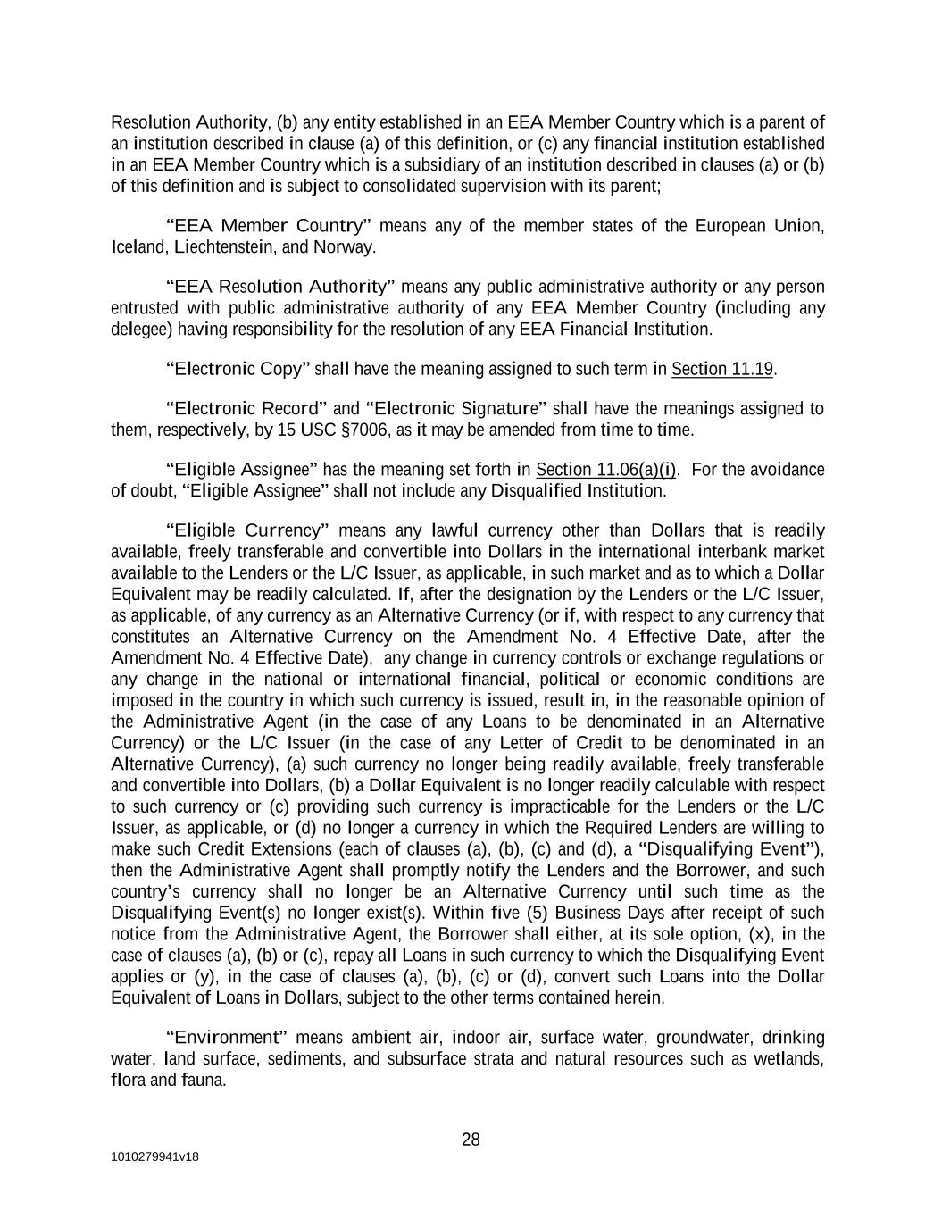 Resolution Authority, (b) any entity established in an EEA Member Country which is a parent of an institution described in clause (a) of this definition, or (c) any financial institution established in an EEA Member Country which is a subsidiary of an institution described in clauses (a) or (b) of this definition and is subject to consolidated supervision with its parent; “EEA Member Country” means any of the member states of the European Union, Iceland, Liechtenstein, and Norway. “EEA Resolution Authority” means any public administrative authority or any person entrusted with public administrative authority of any EEA Member Country (including any delegee) having responsibility for the resolution of any EEA Financial Institution. “Electronic Copy” shall have the meaning assigned to such term in Section 11.19. “Electronic Record” and “Electronic Signature” shall have the meanings assigned to them, respectively, by 15 USC §7006, as it may be amended from time to time. “Eligible Assignee” has the meaning set forth in Section 11.06(a)(i). For the avoidance of doubt, “Eligible Assignee” shall not include any Disqualified Institution. “Eligible Currency” means any lawful currency other than Dollars that is readily available, freely transferable and convertible into Dollars in the international interbank market available to the Lenders or the L/C Issuer, as applicable, in such market and as to which a Dollar Equivalent may be readily calculated. If, after the designation by the Lenders or the L/C Issuer, as applicable, of any currency as an Alternative Currency (or if, with respect to any currency that constitutes an Alternative Currency on the Amendment No. 4 Effective Date, after the Amendment No. 4 Effective Date), any change in currency controls or exchange regulations or any change in the national or international financial, political or economic conditions are imposed in the country in which such currency is issued, result in, in the reasonable opinion of the Administrative Agent (in the case of any Loans to be denominated in an Alternative Currency) or the L/C Issuer (in the case of any Letter of Credit to be denominated in an Alternative Currency), (a) such currency no longer being readily available, freely transferable and convertible into Dollars, (b) a Dollar Equivalent is no longer readily calculable with respect to such currency or (c) providing such currency is impracticable for the Lenders or the L/C Issuer, as applicable, or (d) no longer a currency in which the Required Lenders are willing to make such Credit Extensions (each of clauses (a), (b), (c) and (d), a “Disqualifying Event”), then the Administrative Agent shall promptly notify the Lenders and the Borrower, and such country’s currency shall no longer be an Alternative Currency until such time as the Disqualifying Event(s) no longer exist(s). Within five (5) Business Days after receipt of such notice from the Administrative Agent, the Borrower shall either, at its sole option, (x), in the case of clauses (a), (b) or (c), repay all Loans in such currency to which the Disqualifying Event applies or (y), in the case of clauses (a), (b), (c) or (d), convert such Loans into the Dollar Equivalent of Loans in Dollars, subject to the other terms contained herein. “Environment” means ambient air, indoor air, surface water, groundwater, drinking water, land surface, sediments, and subsurface strata and natural resources such as wetlands, flora and fauna. 28 1010279941v18