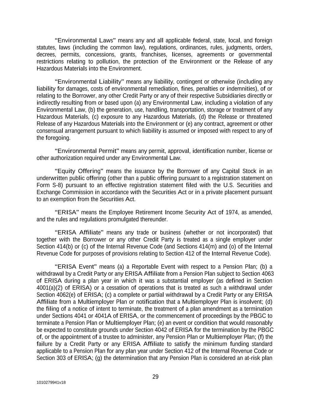 “Environmental Laws” means any and all applicable federal, state, local, and foreign statutes, laws (including the common law), regulations, ordinances, rules, judgments, orders, decrees, permits, concessions, grants, franchises, licenses, agreements or governmental restrictions relating to pollution, the protection of the Environment or the Release of any Hazardous Materials into the Environment. “Environmental Liability” means any liability, contingent or otherwise (including any liability for damages, costs of environmental remediation, fines, penalties or indemnities), of or relating to the Borrower, any other Credit Party or any of their respective Subsidiaries directly or indirectly resulting from or based upon (a) any Environmental Law, including a violation of any Environmental Law, (b) the generation, use, handling, transportation, storage or treatment of any Hazardous Materials, (c) exposure to any Hazardous Materials, (d) the Release or threatened Release of any Hazardous Materials into the Environment or (e) any contract, agreement or other consensual arrangement pursuant to which liability is assumed or imposed with respect to any of the foregoing. “Environmental Permit” means any permit, approval, identification number, license or other authorization required under any Environmental Law. “Equity Offering” means the issuance by the Borrower of any Capital Stock in an underwritten public offering (other than a public offering pursuant to a registration statement on Form S-8) pursuant to an effective registration statement filed with the U.S. Securities and Exchange Commission in accordance with the Securities Act or in a private placement pursuant to an exemption from the Securities Act. “ERISA” means the Employee Retirement Income Security Act of 1974, as amended, and the rules and regulations promulgated thereunder. “ERISA Affiliate” means any trade or business (whether or not incorporated) that together with the Borrower or any other Credit Party is treated as a single employer under Section 414(b) or (c) of the Internal Revenue Code (and Sections 414(m) and (o) of the Internal Revenue Code for purposes of provisions relating to Section 412 of the Internal Revenue Code). “ERISA Event” means (a) a Reportable Event with respect to a Pension Plan; (b) a withdrawal by a Credit Party or any ERISA Affiliate from a Pension Plan subject to Section 4063 of ERISA during a plan year in which it was a substantial employer (as defined in Section 4001(a)(2) of ERISA) or a cessation of operations that is treated as such a withdrawal under Section 4062(e) of ERISA; (c) a complete or partial withdrawal by a Credit Party or any ERISA Affiliate from a Multiemployer Plan or notification that a Multiemployer Plan is insolvent; (d) the filing of a notice of intent to terminate, the treatment of a plan amendment as a termination under Sections 4041 or 4041A of ERISA, or the commencement of proceedings by the PBGC to terminate a Pension Plan or Multiemployer Plan; (e) an event or condition that would reasonably be expected to constitute grounds under Section 4042 of ERISA for the termination by the PBGC of, or the appointment of a trustee to administer, any Pension Plan or Multiemployer Plan; (f) the failure by a Credit Party or any ERISA Affiliate to satisfy the minimum funding standard applicable to a Pension Plan for any plan year under Section 412 of the Internal Revenue Code or Section 303 of ERISA; (g) the determination that any Pension Plan is considered an at-risk plan 29 1010279941v18