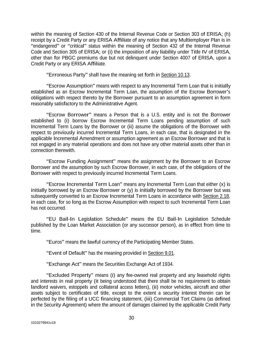 within the meaning of Section 430 of the Internal Revenue Code or Section 303 of ERISA; (h) receipt by a Credit Party or any ERISA Affiliate of any notice that any Multiemployer Plan is in “endangered” or “critical” status within the meaning of Section 432 of the Internal Revenue Code and Section 305 of ERISA; or (i) the imposition of any liability under Title IV of ERISA, other than for PBGC premiums due but not delinquent under Section 4007 of ERISA, upon a Credit Party or any ERISA Affiliate. “Erroneous Party” shall have the meaning set forth in Section 10.13. “Escrow Assumption” means with respect to any Incremental Term Loan that is initially established as an Escrow Incremental Term Loan, the assumption of the Escrow Borrower’s obligations with respect thereto by the Borrower pursuant to an assumption agreement in form reasonably satisfactory to the Administrative Agent. “Escrow Borrower” means a Person that is a U.S. entity and is not the Borrower established to (i) borrow Escrow Incremental Term Loans pending assumption of such Incremental Term Loans by the Borrower or (ii) assume the obligations of the Borrower with respect to previously incurred Incremental Term Loans, in each case, that is designated in the applicable Incremental Amendment or assumption agreement as an Escrow Borrower and that is not engaged in any material operations and does not have any other material assets other than in connection therewith. “Escrow Funding Assignment” means the assignment by the Borrower to an Escrow Borrower and the assumption by such Escrow Borrower, in each case, of the obligations of the Borrower with respect to previously incurred Incremental Term Loans. “Escrow Incremental Term Loan” means any Incremental Term Loan that either (x) is initially borrowed by an Escrow Borrower or (y) is initially borrowed by the Borrower but was subsequently converted to an Escrow Incremental Term Loans in accordance with Section 2.18, in each case, for so long as the Escrow Assumption with respect to such Incremental Term Loan has not occurred. “EU Bail-In Legislation Schedule” means the EU Bail-In Legislation Schedule published by the Loan Market Association (or any successor person), as in effect from time to time. “Euros” means the lawful currency of the Participating Member States. “Event of Default” has the meaning provided in Section 9.01. “Exchange Act” means the Securities Exchange Act of 1934. “Excluded Property” means (i) any fee-owned real property and any leasehold rights and interests in real property (it being understood that there shall be no requirement to obtain landlord waivers, estoppels and collateral access letters), (ii) motor vehicles, aircraft and other assets subject to certificates of title, except to the extent a security interest therein can be perfected by the filing of a UCC financing statement, (iii) Commercial Tort Claims (as defined in the Security Agreement) where the amount of damages claimed by the applicable Credit Party 30 1010279941v18