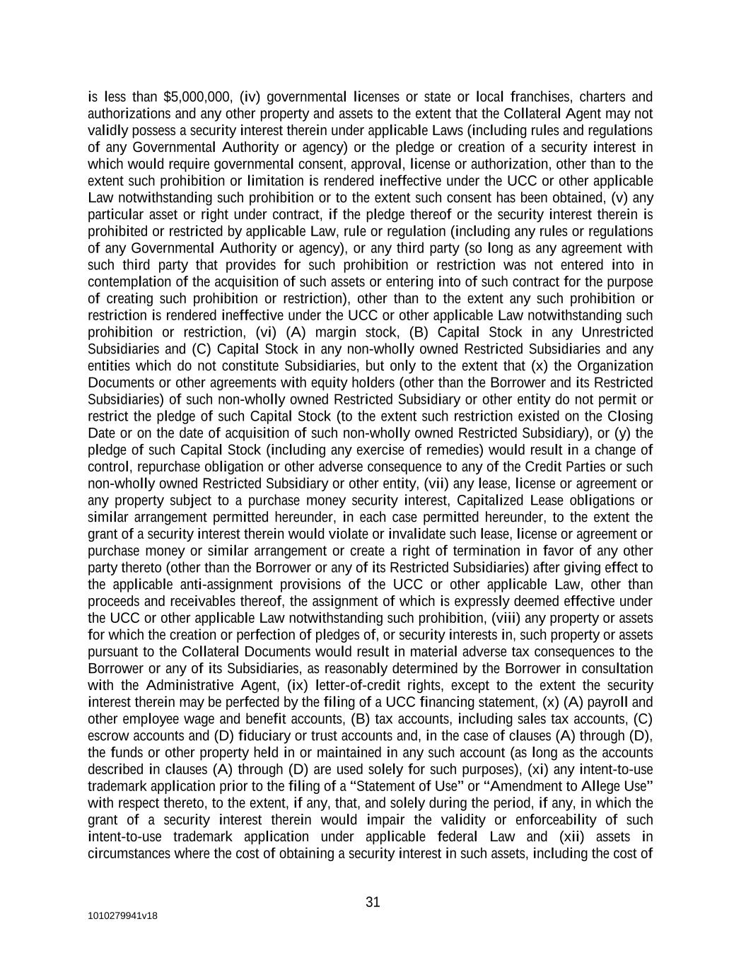 is less than $5,000,000, (iv) governmental licenses or state or local franchises, charters and authorizations and any other property and assets to the extent that the Collateral Agent may not validly possess a security interest therein under applicable Laws (including rules and regulations of any Governmental Authority or agency) or the pledge or creation of a security interest in which would require governmental consent, approval, license or authorization, other than to the extent such prohibition or limitation is rendered ineffective under the UCC or other applicable Law notwithstanding such prohibition or to the extent such consent has been obtained, (v) any particular asset or right under contract, if the pledge thereof or the security interest therein is prohibited or restricted by applicable Law, rule or regulation (including any rules or regulations of any Governmental Authority or agency), or any third party (so long as any agreement with such third party that provides for such prohibition or restriction was not entered into in contemplation of the acquisition of such assets or entering into of such contract for the purpose of creating such prohibition or restriction), other than to the extent any such prohibition or restriction is rendered ineffective under the UCC or other applicable Law notwithstanding such prohibition or restriction, (vi) (A) margin stock, (B) Capital Stock in any Unrestricted Subsidiaries and (C) Capital Stock in any non-wholly owned Restricted Subsidiaries and any entities which do not constitute Subsidiaries, but only to the extent that (x) the Organization Documents or other agreements with equity holders (other than the Borrower and its Restricted Subsidiaries) of such non-wholly owned Restricted Subsidiary or other entity do not permit or restrict the pledge of such Capital Stock (to the extent such restriction existed on the Closing Date or on the date of acquisition of such non-wholly owned Restricted Subsidiary), or (y) the pledge of such Capital Stock (including any exercise of remedies) would result in a change of control, repurchase obligation or other adverse consequence to any of the Credit Parties or such non-wholly owned Restricted Subsidiary or other entity, (vii) any lease, license or agreement or any property subject to a purchase money security interest, Capitalized Lease obligations or similar arrangement permitted hereunder, in each case permitted hereunder, to the extent the grant of a security interest therein would violate or invalidate such lease, license or agreement or purchase money or similar arrangement or create a right of termination in favor of any other party thereto (other than the Borrower or any of its Restricted Subsidiaries) after giving effect to the applicable anti-assignment provisions of the UCC or other applicable Law, other than proceeds and receivables thereof, the assignment of which is expressly deemed effective under the UCC or other applicable Law notwithstanding such prohibition, (viii) any property or assets for which the creation or perfection of pledges of, or security interests in, such property or assets pursuant to the Collateral Documents would result in material adverse tax consequences to the Borrower or any of its Subsidiaries, as reasonably determined by the Borrower in consultation with the Administrative Agent, (ix) letter-of-credit rights, except to the extent the security interest therein may be perfected by the filing of a UCC financing statement, (x) (A) payroll and other employee wage and benefit accounts, (B) tax accounts, including sales tax accounts, (C) escrow accounts and (D) fiduciary or trust accounts and, in the case of clauses (A) through (D), the funds or other property held in or maintained in any such account (as long as the accounts described in clauses (A) through (D) are used solely for such purposes), (xi) any intent-to-use trademark application prior to the filing of a “Statement of Use” or “Amendment to Allege Use” with respect thereto, to the extent, if any, that, and solely during the period, if any, in which the grant of a security interest therein would impair the validity or enforceability of such intent-to-use trademark application under applicable federal Law and (xii) assets in circumstances where the cost of obtaining a security interest in such assets, including the cost of 31 1010279941v18