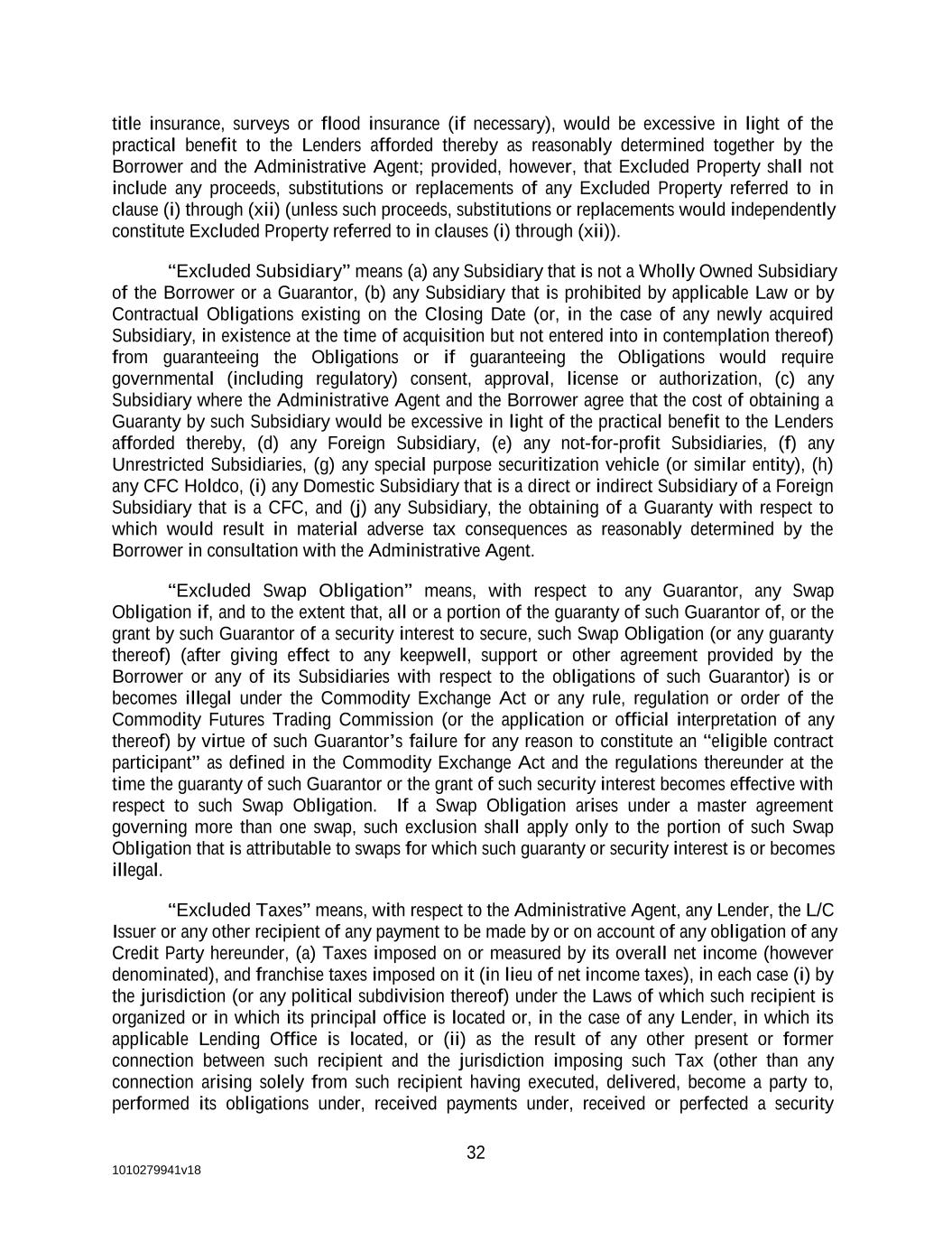 title insurance, surveys or flood insurance (if necessary), would be excessive in light of the practical benefit to the Lenders afforded thereby as reasonably determined together by the Borrower and the Administrative Agent; provided, however, that Excluded Property shall not include any proceeds, substitutions or replacements of any Excluded Property referred to in clause (i) through (xii) (unless such proceeds, substitutions or replacements would independently constitute Excluded Property referred to in clauses (i) through (xii)). “Excluded Subsidiary” means (a) any Subsidiary that is not a Wholly Owned Subsidiary of the Borrower or a Guarantor, (b) any Subsidiary that is prohibited by applicable Law or by Contractual Obligations existing on the Closing Date (or, in the case of any newly acquired Subsidiary, in existence at the time of acquisition but not entered into in contemplation thereof) from guaranteeing the Obligations or if guaranteeing the Obligations would require governmental (including regulatory) consent, approval, license or authorization, (c) any Subsidiary where the Administrative Agent and the Borrower agree that the cost of obtaining a Guaranty by such Subsidiary would be excessive in light of the practical benefit to the Lenders afforded thereby, (d) any Foreign Subsidiary, (e) any not-for-profit Subsidiaries, (f) any Unrestricted Subsidiaries, (g) any special purpose securitization vehicle (or similar entity), (h) any CFC Holdco, (i) any Domestic Subsidiary that is a direct or indirect Subsidiary of a Foreign Subsidiary that is a CFC, and (j) any Subsidiary, the obtaining of a Guaranty with respect to which would result in material adverse tax consequences as reasonably determined by the Borrower in consultation with the Administrative Agent. “Excluded Swap Obligation” means, with respect to any Guarantor, any Swap Obligation if, and to the extent that, all or a portion of the guaranty of such Guarantor of, or the grant by such Guarantor of a security interest to secure, such Swap Obligation (or any guaranty thereof) (after giving effect to any keepwell, support or other agreement provided by the Borrower or any of its Subsidiaries with respect to the obligations of such Guarantor) is or becomes illegal under the Commodity Exchange Act or any rule, regulation or order of the Commodity Futures Trading Commission (or the application or official interpretation of any thereof) by virtue of such Guarantor’s failure for any reason to constitute an “eligible contract participant” as defined in the Commodity Exchange Act and the regulations thereunder at the time the guaranty of such Guarantor or the grant of such security interest becomes effective with respect to such Swap Obligation. If a Swap Obligation arises under a master agreement governing more than one swap, such exclusion shall apply only to the portion of such Swap Obligation that is attributable to swaps for which such guaranty or security interest is or becomes illegal. “Excluded Taxes” means, with respect to the Administrative Agent, any Lender, the L/C Issuer or any other recipient of any payment to be made by or on account of any obligation of any Credit Party hereunder, (a) Taxes imposed on or measured by its overall net income (however denominated), and franchise taxes imposed on it (in lieu of net income taxes), in each case (i) by the jurisdiction (or any political subdivision thereof) under the Laws of which such recipient is organized or in which its principal office is located or, in the case of any Lender, in which its applicable Lending Office is located, or (ii) as the result of any other present or former connection between such recipient and the jurisdiction imposing such Tax (other than any connection arising solely from such recipient having executed, delivered, become a party to, performed its obligations under, received payments under, received or perfected a security 32 1010279941v18