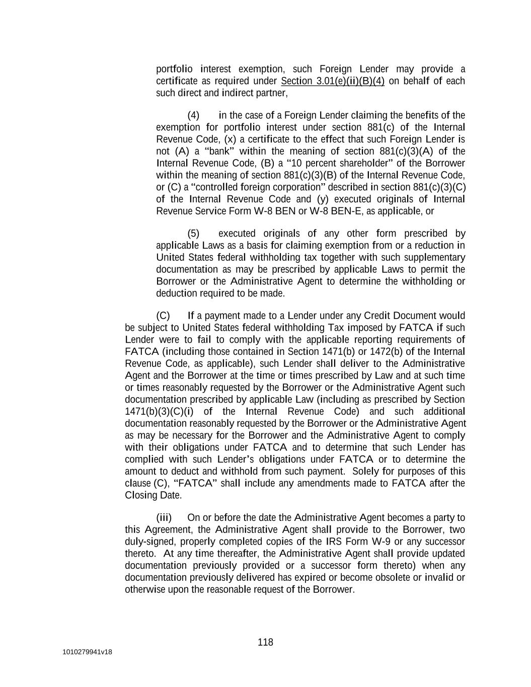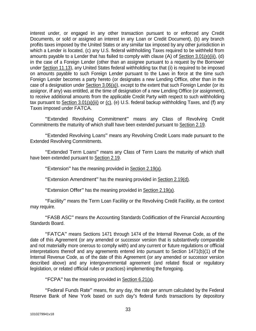interest under, or engaged in any other transaction pursuant to or enforced any Credit Documents, or sold or assigned an interest in any Loan or Credit Document), (b) any branch profits taxes imposed by the United States or any similar tax imposed by any other jurisdiction in which a Lender is located, (c) any U.S. federal withholding Taxes required to be withheld from amounts payable to a Lender that has failed to comply with clause (A) of Section 3.01(e)(ii), (d) in the case of a Foreign Lender (other than an assignee pursuant to a request by the Borrower under Section 11.13), any United States federal withholding tax that (i) is required to be imposed on amounts payable to such Foreign Lender pursuant to the Laws in force at the time such Foreign Lender becomes a party hereto (or designates a new Lending Office, other than in the case of a designation under Section 3.06(a)), except to the extent that such Foreign Lender (or its assignor, if any) was entitled, at the time of designation of a new Lending Office (or assignment), to receive additional amounts from the applicable Credit Party with respect to such withholding tax pursuant to Section 3.01(a)(ii) or (c), (e) U.S. federal backup withholding Taxes, and (f) any Taxes imposed under FATCA. “Extended Revolving Commitment” means any Class of Revolving Credit Commitments the maturity of which shall have been extended pursuant to Section 2.19. “Extended Revolving Loans” means any Revolving Credit Loans made pursuant to the Extended Revolving Commitments. “Extended Term Loans” means any Class of Term Loans the maturity of which shall have been extended pursuant to Section 2.19. “Extension” has the meaning provided in Section 2.19(a). “Extension Amendment” has the meaning provided in Section 2.19(d). “Extension Offer” has the meaning provided in Section 2.19(a). “Facility” means the Term Loan Facility or the Revolving Credit Facility, as the context may require. “FASB ASC” means the Accounting Standards Codification of the Financial Accounting Standards Board. “FATCA” means Sections 1471 through 1474 of the Internal Revenue Code, as of the date of this Agreement (or any amended or successor version that is substantively comparable and not materially more onerous to comply with) and any current or future regulations or official interpretations thereof and any agreements entered into pursuant to Section 1471(b)(1) of the Internal Revenue Code, as of the date of this Agreement (or any amended or successor version described above) and any intergovernmental agreement (and related fiscal or regulatory legislation, or related official rules or practices) implementing the foregoing. “FCPA” has the meaning provided in Section 6.21(a). “Federal Funds Rate” means, for any day, the rate per annum calculated by the Federal Reserve Bank of New York based on such day’s federal funds transactions by depository 33 1010279941v18