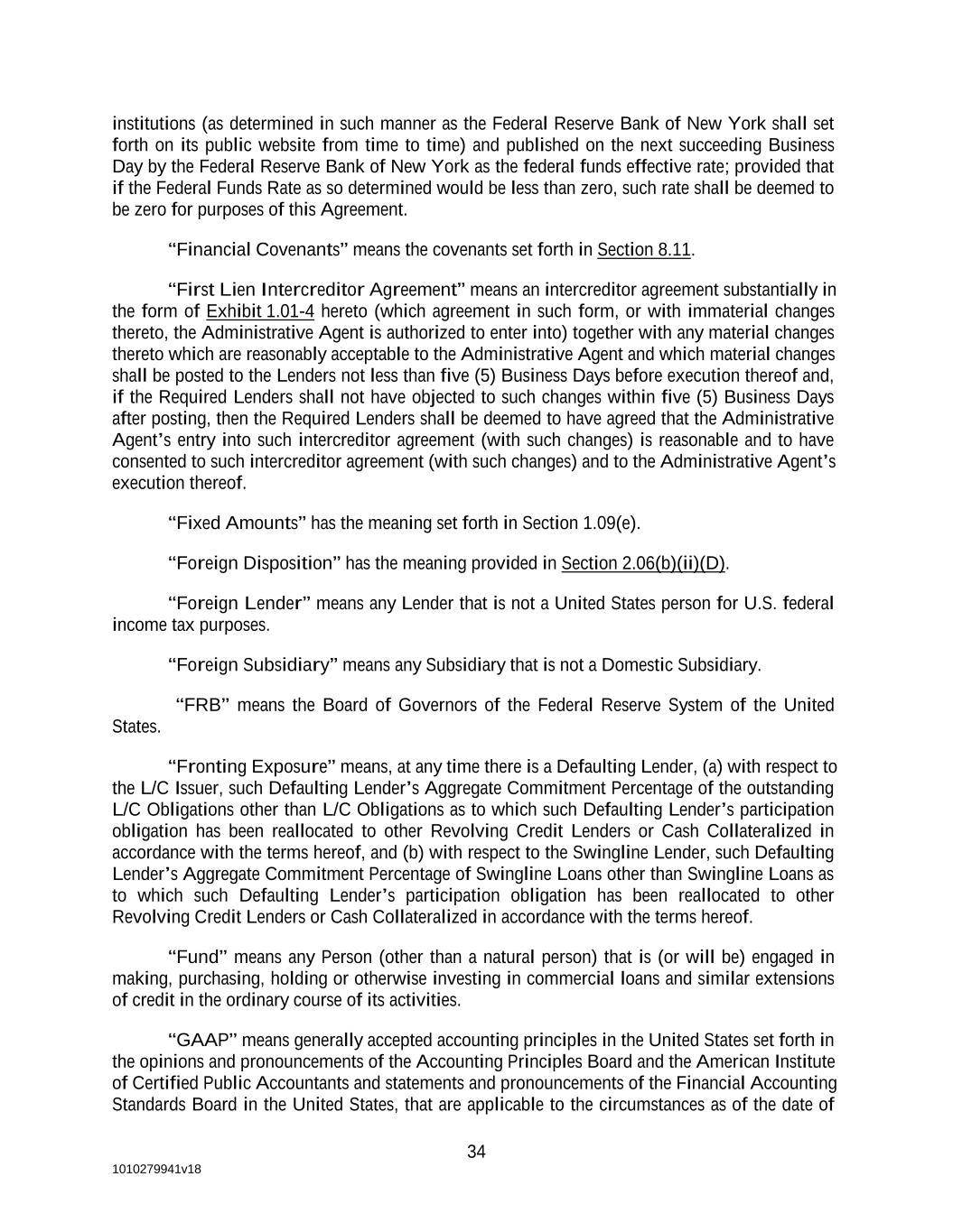 institutions (as determined in such manner as the Federal Reserve Bank of New York shall set forth on its public website from time to time) and published on the next succeeding Business Day by the Federal Reserve Bank of New York as the federal funds effective rate; provided that if the Federal Funds Rate as so determined would be less than zero, such rate shall be deemed to be zero for purposes of this Agreement. “Financial Covenants” means the covenants set forth in Section 8.11. “First Lien Intercreditor Agreement” means an intercreditor agreement substantially in the form of Exhibit 1.01-4 hereto (which agreement in such form, or with immaterial changes thereto, the Administrative Agent is authorized to enter into) together with any material changes thereto which are reasonably acceptable to the Administrative Agent and which material changes shall be posted to the Lenders not less than five (5) Business Days before execution thereof and, if the Required Lenders shall not have objected to such changes within five (5) Business Days after posting, then the Required Lenders shall be deemed to have agreed that the Administrative Agent’s entry into such intercreditor agreement (with such changes) is reasonable and to have consented to such intercreditor agreement (with such changes) and to the Administrative Agent’s execution thereof. “Fixed Amounts” has the meaning set forth in Section 1.09(e). “Foreign Disposition” has the meaning provided in Section 2.06(b)(ii)(D). “Foreign Lender” means any Lender that is not a United States person for U.S. federal income tax purposes. “Foreign Subsidiary” means any Subsidiary that is not a Domestic Subsidiary. “FRB” means the Board of Governors of the Federal Reserve System of the United States. “Fronting Exposure” means, at any time there is a Defaulting Lender, (a) with respect to the L/C Issuer, such Defaulting Lender’s Aggregate Commitment Percentage of the outstanding L/C Obligations other than L/C Obligations as to which such Defaulting Lender’s participation obligation has been reallocated to other Revolving Credit Lenders or Cash Collateralized in accordance with the terms hereof, and (b) with respect to the Swingline Lender, such Defaulting Lender’s Aggregate Commitment Percentage of Swingline Loans other than Swingline Loans as to which such Defaulting Lender’s participation obligation has been reallocated to other Revolving Credit Lenders or Cash Collateralized in accordance with the terms hereof. “Fund” means any Person (other than a natural person) that is (or will be) engaged in making, purchasing, holding or otherwise investing in commercial loans and similar extensions of credit in the ordinary course of its activities. “GAAP” means generally accepted accounting principles in the United States set forth in the opinions and pronouncements of the Accounting Principles Board and the American Institute of Certified Public Accountants and statements and pronouncements of the Financial Accounting Standards Board in the United States, that are applicable to the circumstances as of the date of 34 1010279941v18