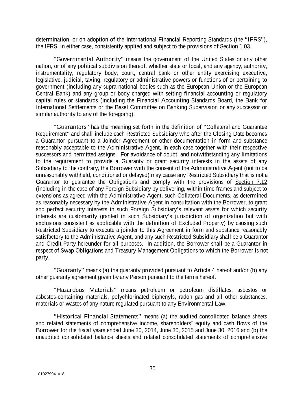 determination, or on adoption of the International Financial Reporting Standards (the “IFRS”), the IFRS, in either case, consistently applied and subject to the provisions of Section 1.03. “Governmental Authority” means the government of the United States or any other nation, or of any political subdivision thereof, whether state or local, and any agency, authority, instrumentality, regulatory body, court, central bank or other entity exercising executive, legislative, judicial, taxing, regulatory or administrative powers or functions of or pertaining to government (including any supra-national bodies such as the European Union or the European Central Bank) and any group or body charged with setting financial accounting or regulatory capital rules or standards (including the Financial Accounting Standards Board, the Bank for International Settlements or the Basel Committee on Banking Supervision or any successor or similar authority to any of the foregoing). “Guarantors” has the meaning set forth in the definition of “Collateral and Guarantee Requirement” and shall include each Restricted Subsidiary who after the Closing Date becomes a Guarantor pursuant to a Joinder Agreement or other documentation in form and substance reasonably acceptable to the Administrative Agent, in each case together with their respective successors and permitted assigns. For avoidance of doubt, and notwithstanding any limitations to the requirement to provide a Guaranty or grant security interests in the assets of any Subsidiary to the contrary, the Borrower with the consent of the Administrative Agent (not to be unreasonably withheld, conditioned or delayed) may cause any Restricted Subsidiary that is not a Guarantor to guarantee the Obligations and comply with the provisions of Section 7.12 (including in the case of any Foreign Subsidiary by delivering, within time frames and subject to extensions as agreed with the Administrative Agent, such Collateral Documents, as determined as reasonably necessary by the Administrative Agent in consultation with the Borrower, to grant and perfect security interests in such Foreign Subsidiary’s relevant assets for which security interests are customarily granted in such Subsidiary’s jurisdiction of organization but with exclusions consistent as applicable with the definition of Excluded Property) by causing such Restricted Subsidiary to execute a joinder to this Agreement in form and substance reasonably satisfactory to the Administrative Agent, and any such Restricted Subsidiary shall be a Guarantor and Credit Party hereunder for all purposes. In addition, the Borrower shall be a Guarantor in respect of Swap Obligations and Treasury Management Obligations to which the Borrower is not party. “Guaranty” means (a) the guaranty provided pursuant to Article 4 hereof and/or (b) any other guaranty agreement given by any Person pursuant to the terms hereof. “Hazardous Materials” means petroleum or petroleum distillates, asbestos or asbestos-containing materials, polychlorinated biphenyls, radon gas and all other substances, materials or wastes of any nature regulated pursuant to any Environmental Law. “Historical Financial Statements” means (a) the audited consolidated balance sheets and related statements of comprehensive income, shareholders’ equity and cash flows of the Borrower for the fiscal years ended June 30, 2014, June 30, 2015 and June 30, 2016 and (b) the unaudited consolidated balance sheets and related consolidated statements of comprehensive 35 1010279941v18