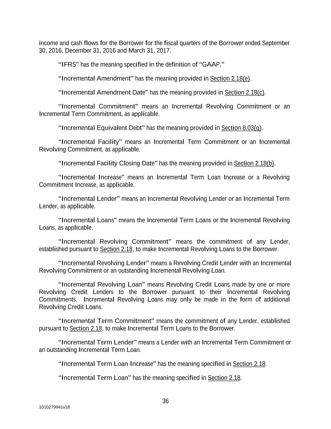 income and cash flows for the Borrower for the fiscal quarters of the Borrower ended September 30, 2016, December 31, 2016 and March 31, 2017. “IFRS” has the meaning specified in the definition of “GAAP.” “Incremental Amendment” has the meaning provided in Section 2.18(e). “Incremental Amendment Date” has the meaning provided in Section 2.18(c). “Incremental Commitment” means an Incremental Revolving Commitment or an Incremental Term Commitment, as applicable. “Incremental Equivalent Debt” has the meaning provided in Section 8.03(q). “Incremental Facility” means an Incremental Term Commitment or an Incremental Revolving Commitment, as applicable. “Incremental Facility Closing Date” has the meaning provided in Section 2.18(b). “Incremental Increase” means an Incremental Term Loan Increase or a Revolving Commitment Increase, as applicable. “Incremental Lender” means an Incremental Revolving Lender or an Incremental Term Lender, as applicable. “Incremental Loans” means the Incremental Term Loans or the Incremental Revolving Loans, as applicable. “Incremental Revolving Commitment” means the commitment of any Lender, established pursuant to Section 2.18, to make Incremental Revolving Loans to the Borrower. “Incremental Revolving Lender” means a Revolving Credit Lender with an Incremental Revolving Commitment or an outstanding Incremental Revolving Loan. “Incremental Revolving Loan” means Revolving Credit Loans made by one or more Revolving Credit Lenders to the Borrower pursuant to their Incremental Revolving Commitments. Incremental Revolving Loans may only be made in the form of additional Revolving Credit Loans. “Incremental Term Commitment” means the commitment of any Lender, established pursuant to Section 2.18, to make Incremental Term Loans to the Borrower. “Incremental Term Lender” means a Lender with an Incremental Term Commitment or an outstanding Incremental Term Loan. “Incremental Term Loan Increase” has the meaning specified in Section 2.18. “Incremental Term Loan” has the meaning specified in Section 2.18. 36 1010279941v18