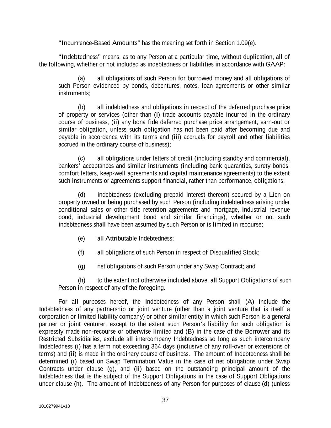 “Incurrence-Based Amounts” has the meaning set forth in Section 1.09(e). “Indebtedness” means, as to any Person at a particular time, without duplication, all of the following, whether or not included as indebtedness or liabilities in accordance with GAAP: (a) all obligations of such Person for borrowed money and all obligations of such Person evidenced by bonds, debentures, notes, loan agreements or other similar instruments; (b) all indebtedness and obligations in respect of the deferred purchase price of property or services (other than (i) trade accounts payable incurred in the ordinary course of business, (ii) any bona fide deferred purchase price arrangement, earn-out or similar obligation, unless such obligation has not been paid after becoming due and payable in accordance with its terms and (iii) accruals for payroll and other liabilities accrued in the ordinary course of business); (c) all obligations under letters of credit (including standby and commercial), bankers’ acceptances and similar instruments (including bank guaranties, surety bonds, comfort letters, keep-well agreements and capital maintenance agreements) to the extent such instruments or agreements support financial, rather than performance, obligations; (d) indebtedness (excluding prepaid interest thereon) secured by a Lien on property owned or being purchased by such Person (including indebtedness arising under conditional sales or other title retention agreements and mortgage, industrial revenue bond, industrial development bond and similar financings), whether or not such indebtedness shall have been assumed by such Person or is limited in recourse; (e) all Attributable Indebtedness; (f) all obligations of such Person in respect of Disqualified Stock; (g) net obligations of such Person under any Swap Contract; and (h) to the extent not otherwise included above, all Support Obligations of such Person in respect of any of the foregoing. For all purposes hereof, the Indebtedness of any Person shall (A) include the Indebtedness of any partnership or joint venture (other than a joint venture that is itself a corporation or limited liability company) or other similar entity in which such Person is a general partner or joint venturer, except to the extent such Person’s liability for such obligation is expressly made non-recourse or otherwise limited and (B) in the case of the Borrower and its Restricted Subsidiaries, exclude all intercompany Indebtedness so long as such intercompany Indebtedness (i) has a term not exceeding 364 days (inclusive of any roll-over or extensions of terms) and (ii) is made in the ordinary course of business. The amount of Indebtedness shall be determined (i) based on Swap Termination Value in the case of net obligations under Swap Contracts under clause (g), and (ii) based on the outstanding principal amount of the Indebtedness that is the subject of the Support Obligations in the case of Support Obligations under clause (h). The amount of Indebtedness of any Person for purposes of clause (d) (unless 37 1010279941v18