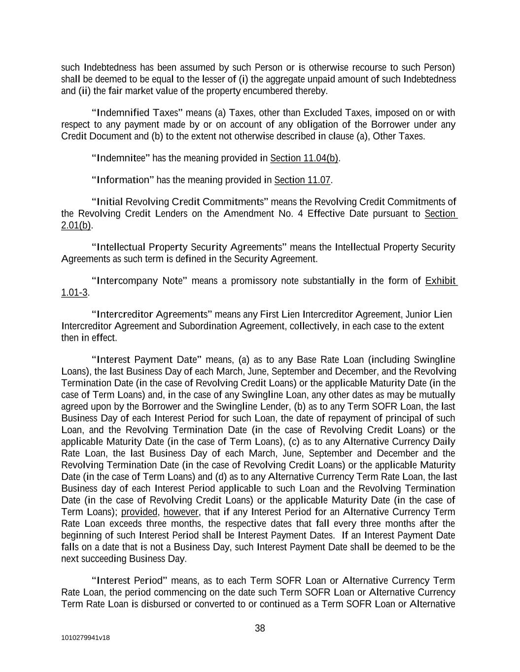 such Indebtedness has been assumed by such Person or is otherwise recourse to such Person) shall be deemed to be equal to the lesser of (i) the aggregate unpaid amount of such Indebtedness and (ii) the fair market value of the property encumbered thereby. “Indemnified Taxes” means (a) Taxes, other than Excluded Taxes, imposed on or with respect to any payment made by or on account of any obligation of the Borrower under any Credit Document and (b) to the extent not otherwise described in clause (a), Other Taxes. “Indemnitee” has the meaning provided in Section 11.04(b). “Information” has the meaning provided in Section 11.07. “Initial Revolving Credit Commitments” means the Revolving Credit Commitments of the Revolving Credit Lenders on the Amendment No. 4 Effective Date pursuant to Section 2.01(b). “Intellectual Property Security Agreements” means the Intellectual Property Security Agreements as such term is defined in the Security Agreement. “Intercompany Note” means a promissory note substantially in the form of Exhibit 1.01-3. “Intercreditor Agreements” means any First Lien Intercreditor Agreement, Junior Lien Intercreditor Agreement and Subordination Agreement, collectively, in each case to the extent then in effect. “Interest Payment Date” means, (a) as to any Base Rate Loan (including Swingline Loans), the last Business Day of each March, June, September and December, and the Revolving Termination Date (in the case of Revolving Credit Loans) or the applicable Maturity Date (in the case of Term Loans) and, in the case of any Swingline Loan, any other dates as may be mutually agreed upon by the Borrower and the Swingline Lender, (b) as to any Term SOFR Loan, the last Business Day of each Interest Period for such Loan, the date of repayment of principal of such Loan, and the Revolving Termination Date (in the case of Revolving Credit Loans) or the applicable Maturity Date (in the case of Term Loans), (c) as to any Alternative Currency Daily Rate Loan, the last Business Day of each March, June, September and December and the Revolving Termination Date (in the case of Revolving Credit Loans) or the applicable Maturity Date (in the case of Term Loans) and (d) as to any Alternative Currency Term Rate Loan, the last Business day of each Interest Period applicable to such Loan and the Revolving Termination Date (in the case of Revolving Credit Loans) or the applicable Maturity Date (in the case of Term Loans); provided, however, that if any Interest Period for an Alternative Currency Term Rate Loan exceeds three months, the respective dates that fall every three months after the beginning of such Interest Period shall be Interest Payment Dates. If an Interest Payment Date falls on a date that is not a Business Day, such Interest Payment Date shall be deemed to be the next succeeding Business Day. “Interest Period” means, as to each Term SOFR Loan or Alternative Currency Term Rate Loan, the period commencing on the date such Term SOFR Loan or Alternative Currency Term Rate Loan is disbursed or converted to or continued as a Term SOFR Loan or Alternative 38 1010279941v18