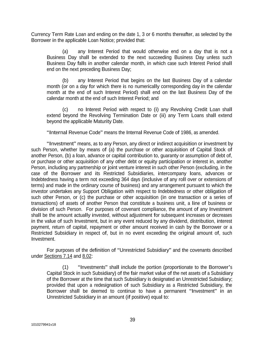 Currency Term Rate Loan and ending on the date 1, 3 or 6 months thereafter, as selected by the Borrower in the applicable Loan Notice; provided that: (a) any Interest Period that would otherwise end on a day that is not a Business Day shall be extended to the next succeeding Business Day unless such Business Day falls in another calendar month, in which case such Interest Period shall end on the next preceding Business Day; (b) any Interest Period that begins on the last Business Day of a calendar month (or on a day for which there is no numerically corresponding day in the calendar month at the end of such Interest Period) shall end on the last Business Day of the calendar month at the end of such Interest Period; and (c) no Interest Period with respect to (i) any Revolving Credit Loan shall extend beyond the Revolving Termination Date or (ii) any Term Loans shall extend beyond the applicable Maturity Date. “Internal Revenue Code” means the Internal Revenue Code of 1986, as amended. “Investment” means, as to any Person, any direct or indirect acquisition or investment by such Person, whether by means of (a) the purchase or other acquisition of Capital Stock of another Person, (b) a loan, advance or capital contribution to, guaranty or assumption of debt of, or purchase or other acquisition of any other debt or equity participation or interest in, another Person, including any partnership or joint venture interest in such other Person (excluding, in the case of the Borrower and its Restricted Subsidiaries, intercompany loans, advances or Indebtedness having a term not exceeding 364 days (inclusive of any roll over or extensions of terms) and made in the ordinary course of business) and any arrangement pursuant to which the investor undertakes any Support Obligation with respect to Indebtedness or other obligation of such other Person, or (c) the purchase or other acquisition (in one transaction or a series of transactions) of assets of another Person that constitute a business unit, a line of business or division of such Person. For purposes of covenant compliance, the amount of any Investment shall be the amount actually invested, without adjustment for subsequent increases or decreases in the value of such Investment, but in any event reduced by any dividend, distribution, interest payment, return of capital, repayment or other amount received in cash by the Borrower or a Restricted Subsidiary in respect of, but in no event exceeding the original amount of, such Investment. For purposes of the definition of “Unrestricted Subsidiary” and the covenants described under Sections 7.14 and 8.02: (1) “Investments” shall include the portion (proportionate to the Borrower’s Capital Stock in such Subsidiary) of the fair market value of the net assets of a Subsidiary of the Borrower at the time that such Subsidiary is designated an Unrestricted Subsidiary; provided that upon a redesignation of such Subsidiary as a Restricted Subsidiary, the Borrower shall be deemed to continue to have a permanent “Investment” in an Unrestricted Subsidiary in an amount (if positive) equal to: 39 1010279941v18