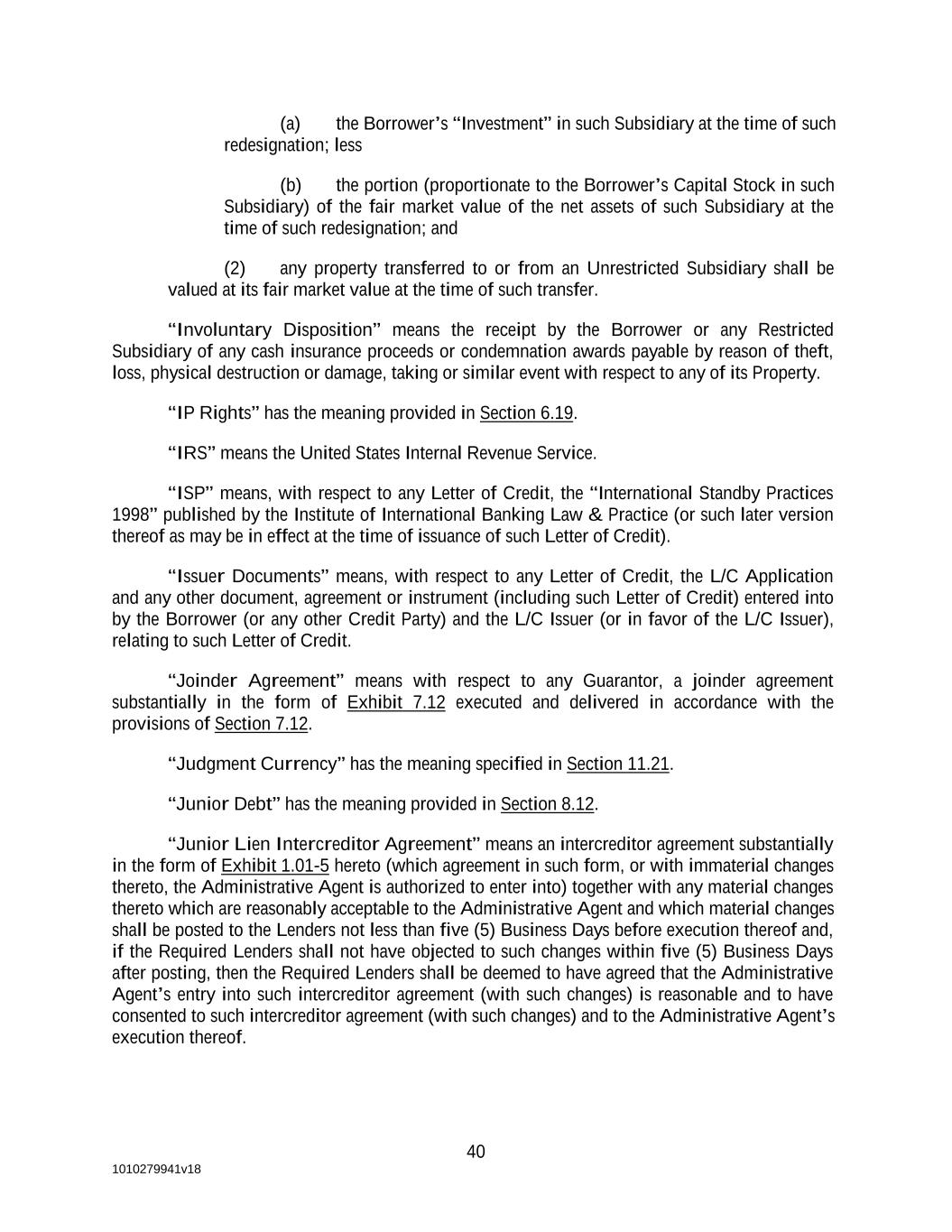 (a) the Borrower’s “Investment” in such Subsidiary at the time of such redesignation; less (b) the portion (proportionate to the Borrower’s Capital Stock in such Subsidiary) of the fair market value of the net assets of such Subsidiary at the time of such redesignation; and (2) any property transferred to or from an Unrestricted Subsidiary shall be valued at its fair market value at the time of such transfer. “Involuntary Disposition” means the receipt by the Borrower or any Restricted Subsidiary of any cash insurance proceeds or condemnation awards payable by reason of theft, loss, physical destruction or damage, taking or similar event with respect to any of its Property. “IP Rights” has the meaning provided in Section 6.19. “IRS” means the United States Internal Revenue Service. “ISP” means, with respect to any Letter of Credit, the “International Standby Practices 1998” published by the Institute of International Banking Law & Practice (or such later version thereof as may be in effect at the time of issuance of such Letter of Credit). “Issuer Documents” means, with respect to any Letter of Credit, the L/C Application and any other document, agreement or instrument (including such Letter of Credit) entered into by the Borrower (or any other Credit Party) and the L/C Issuer (or in favor of the L/C Issuer), relating to such Letter of Credit. “Joinder Agreement” means with respect to any Guarantor, a joinder agreement substantially in the form of Exhibit 7.12 executed and delivered in accordance with the provisions of Section 7.12. “Judgment Currency” has the meaning specified in Section 11.21. “Junior Debt” has the meaning provided in Section 8.12. “Junior Lien Intercreditor Agreement” means an intercreditor agreement substantially in the form of Exhibit 1.01-5 hereto (which agreement in such form, or with immaterial changes thereto, the Administrative Agent is authorized to enter into) together with any material changes thereto which are reasonably acceptable to the Administrative Agent and which material changes shall be posted to the Lenders not less than five (5) Business Days before execution thereof and, if the Required Lenders shall not have objected to such changes within five (5) Business Days after posting, then the Required Lenders shall be deemed to have agreed that the Administrative Agent’s entry into such intercreditor agreement (with such changes) is reasonable and to have consented to such intercreditor agreement (with such changes) and to the Administrative Agent’s execution thereof. 40 1010279941v18