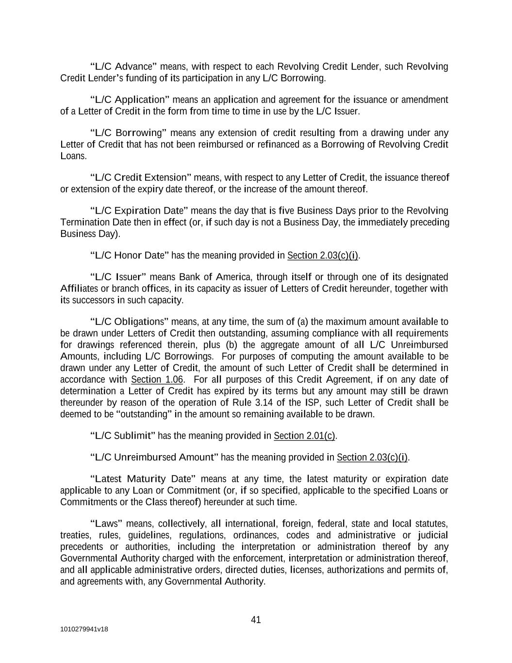 “L/C Advance” means, with respect to each Revolving Credit Lender, such Revolving Credit Lender’s funding of its participation in any L/C Borrowing. “L/C Application” means an application and agreement for the issuance or amendment of a Letter of Credit in the form from time to time in use by the L/C Issuer. “L/C Borrowing” means any extension of credit resulting from a drawing under any Letter of Credit that has not been reimbursed or refinanced as a Borrowing of Revolving Credit Loans. “L/C Credit Extension” means, with respect to any Letter of Credit, the issuance thereof or extension of the expiry date thereof, or the increase of the amount thereof. “L/C Expiration Date” means the day that is five Business Days prior to the Revolving Termination Date then in effect (or, if such day is not a Business Day, the immediately preceding Business Day). “L/C Honor Date” has the meaning provided in Section 2.03(c)(i). “L/C Issuer” means Bank of America, through itself or through one of its designated Affiliates or branch offices, in its capacity as issuer of Letters of Credit hereunder, together with its successors in such capacity. “L/C Obligations” means, at any time, the sum of (a) the maximum amount available to be drawn under Letters of Credit then outstanding, assuming compliance with all requirements for drawings referenced therein, plus (b) the aggregate amount of all L/C Unreimbursed Amounts, including L/C Borrowings. For purposes of computing the amount available to be drawn under any Letter of Credit, the amount of such Letter of Credit shall be determined in accordance with Section 1.06. For all purposes of this Credit Agreement, if on any date of determination a Letter of Credit has expired by its terms but any amount may still be drawn thereunder by reason of the operation of Rule 3.14 of the ISP, such Letter of Credit shall be deemed to be “outstanding” in the amount so remaining available to be drawn. “L/C Sublimit” has the meaning provided in Section 2.01(c). “L/C Unreimbursed Amount” has the meaning provided in Section 2.03(c)(i). “Latest Maturity Date” means at any time, the latest maturity or expiration date applicable to any Loan or Commitment (or, if so specified, applicable to the specified Loans or Commitments or the Class thereof) hereunder at such time. “Laws” means, collectively, all international, foreign, federal, state and local statutes, treaties, rules, guidelines, regulations, ordinances, codes and administrative or judicial precedents or authorities, including the interpretation or administration thereof by any Governmental Authority charged with the enforcement, interpretation or administration thereof, and all applicable administrative orders, directed duties, licenses, authorizations and permits of, and agreements with, any Governmental Authority. 41 1010279941v18